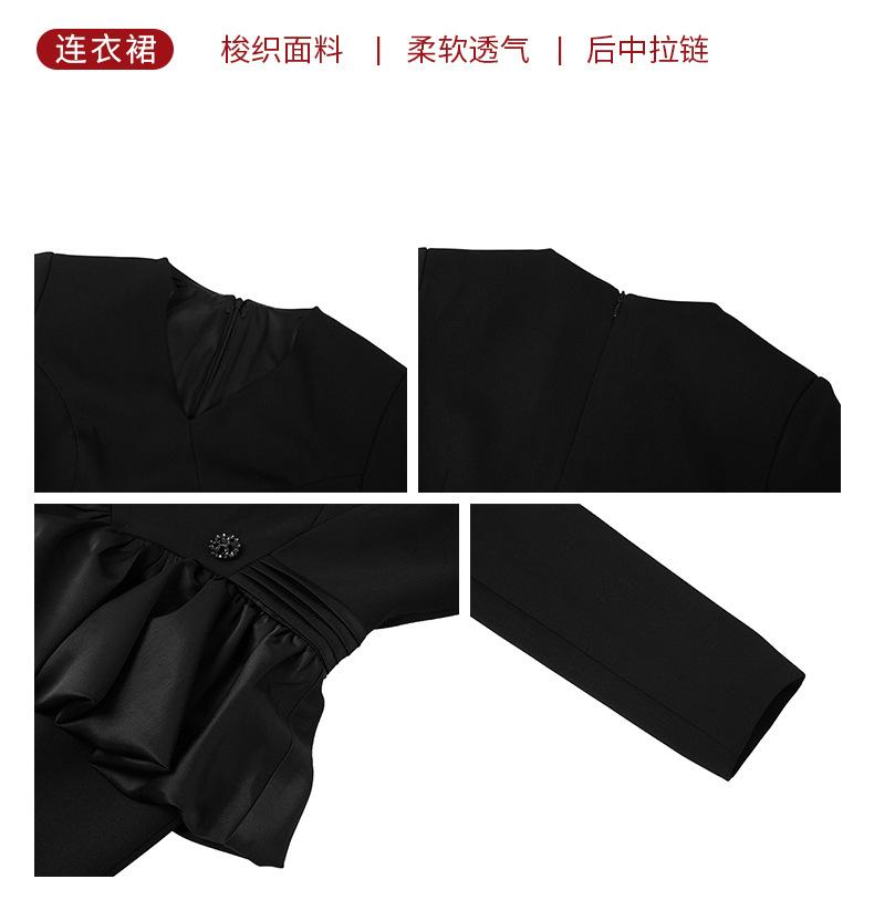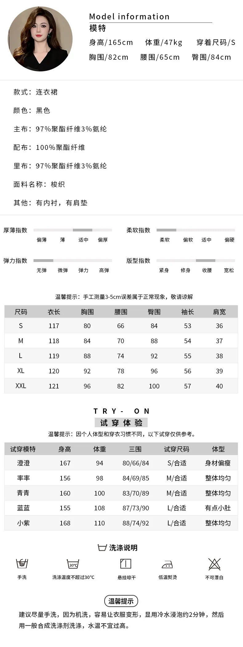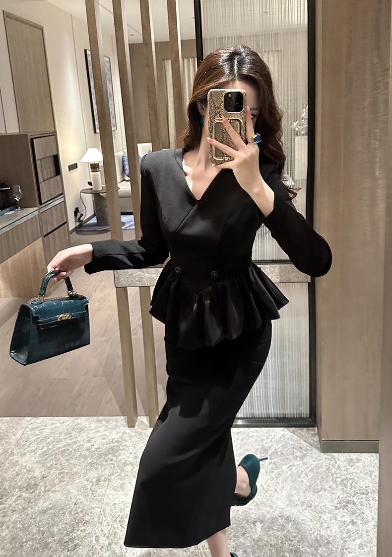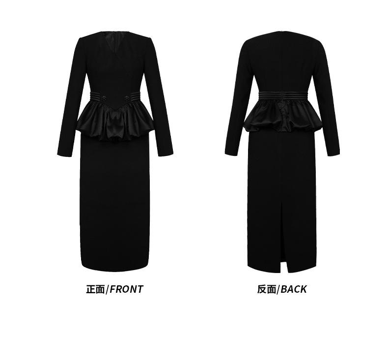 2025 Nuevo Otoño Vestido Elegante Francés de Cuello en V con Volantes Cubre Vientre Ajustado Abraza Caderas Negro para Mujer 45062