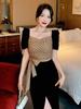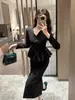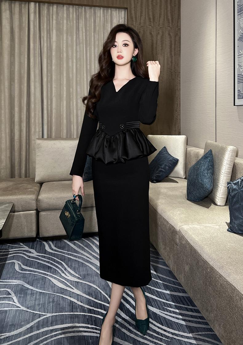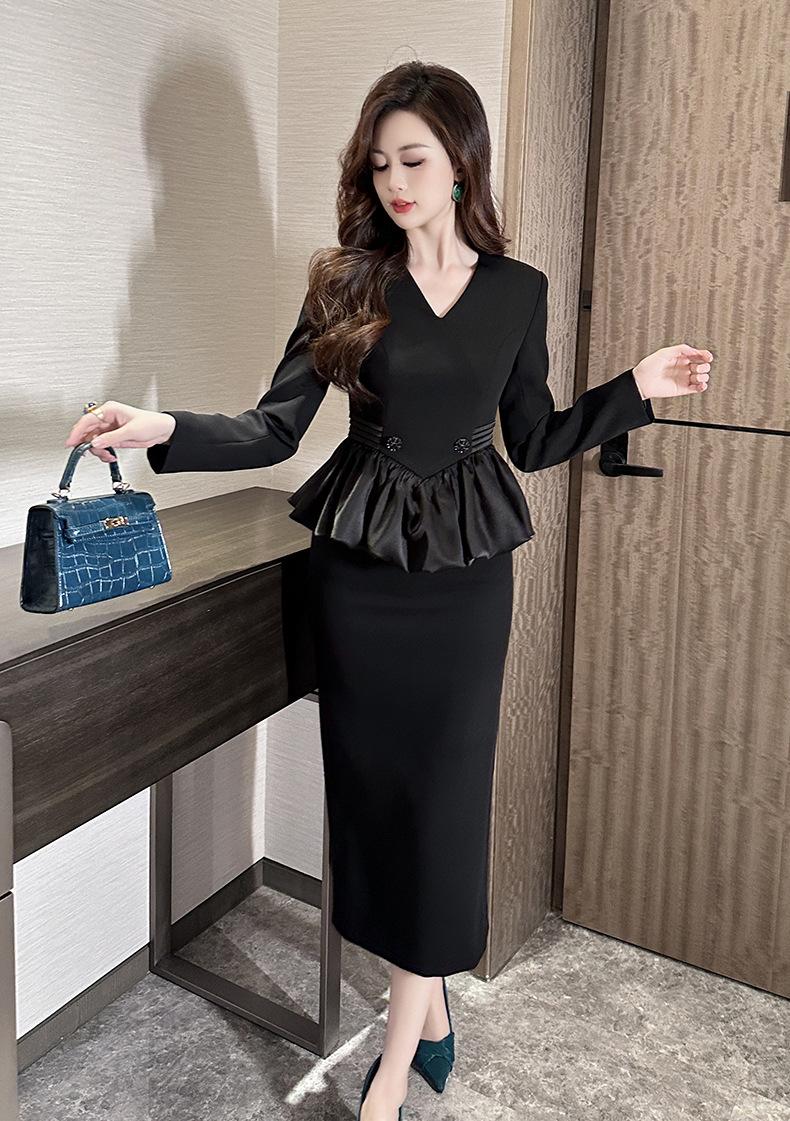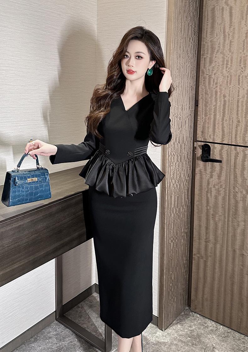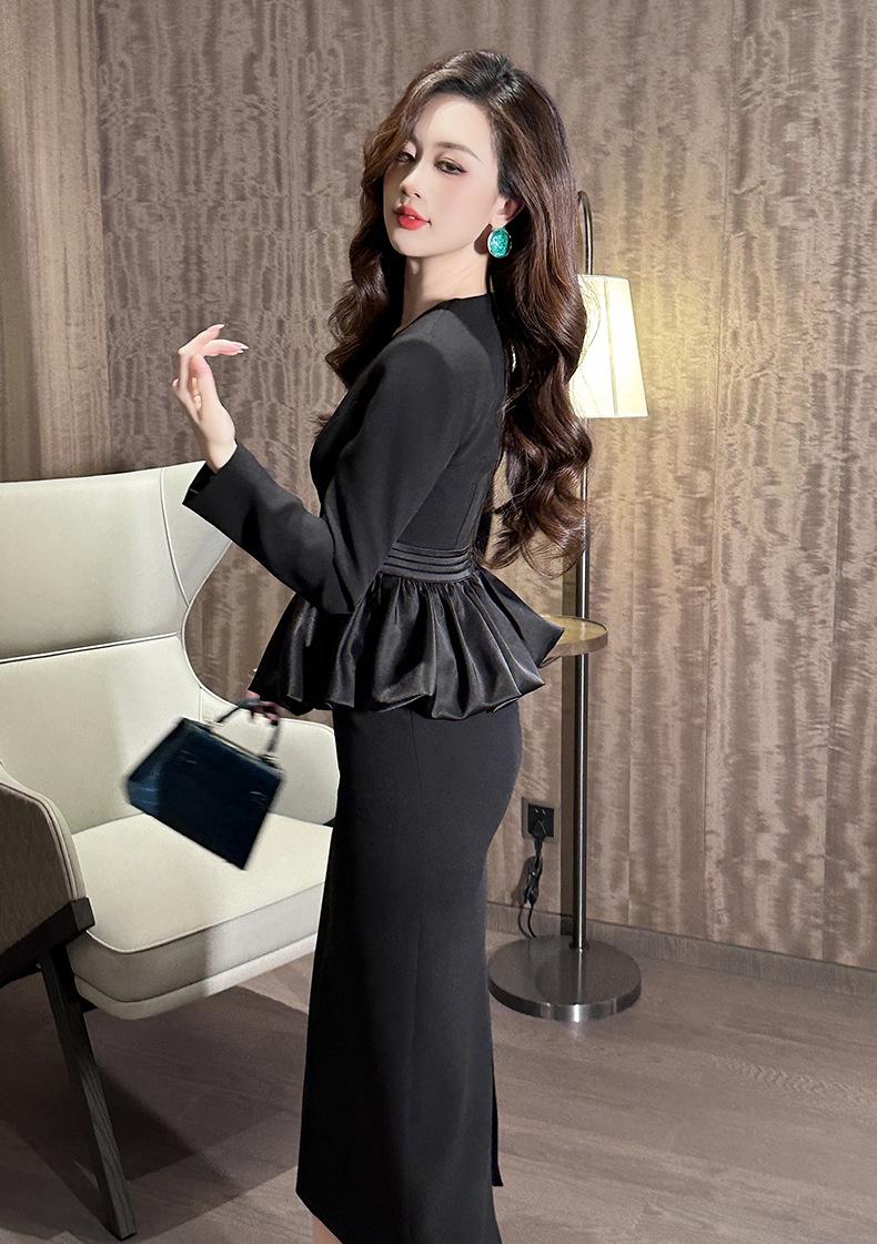 2025 Nuevo Otoño Vestido Elegante Francés de Cuello en V con Volantes Cubre Vientre Ajustado Abraza Caderas Negro para Mujer 45062