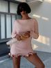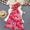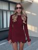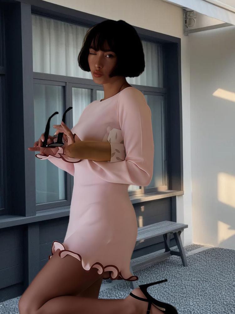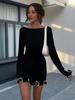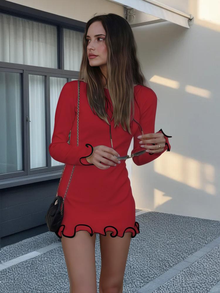 Vestido de Cuello Redondo con Volantes en el Bajo de Estilo Europeo y Americano para Mujer 2025 Verano Nuevo Color-Block de Personalidad Manga Larga Entallado Vestido Corto