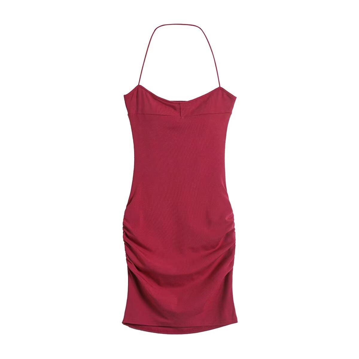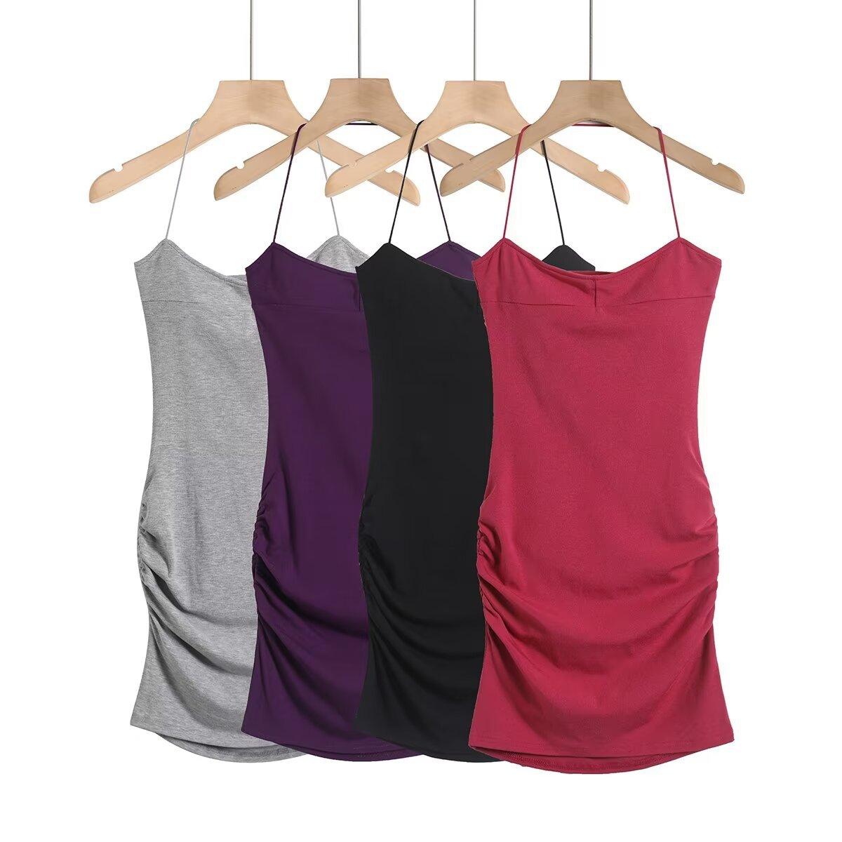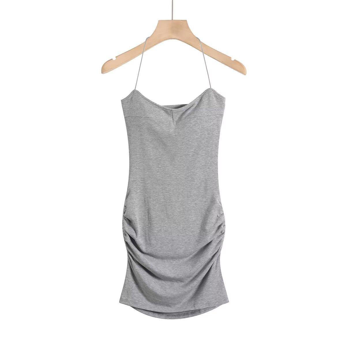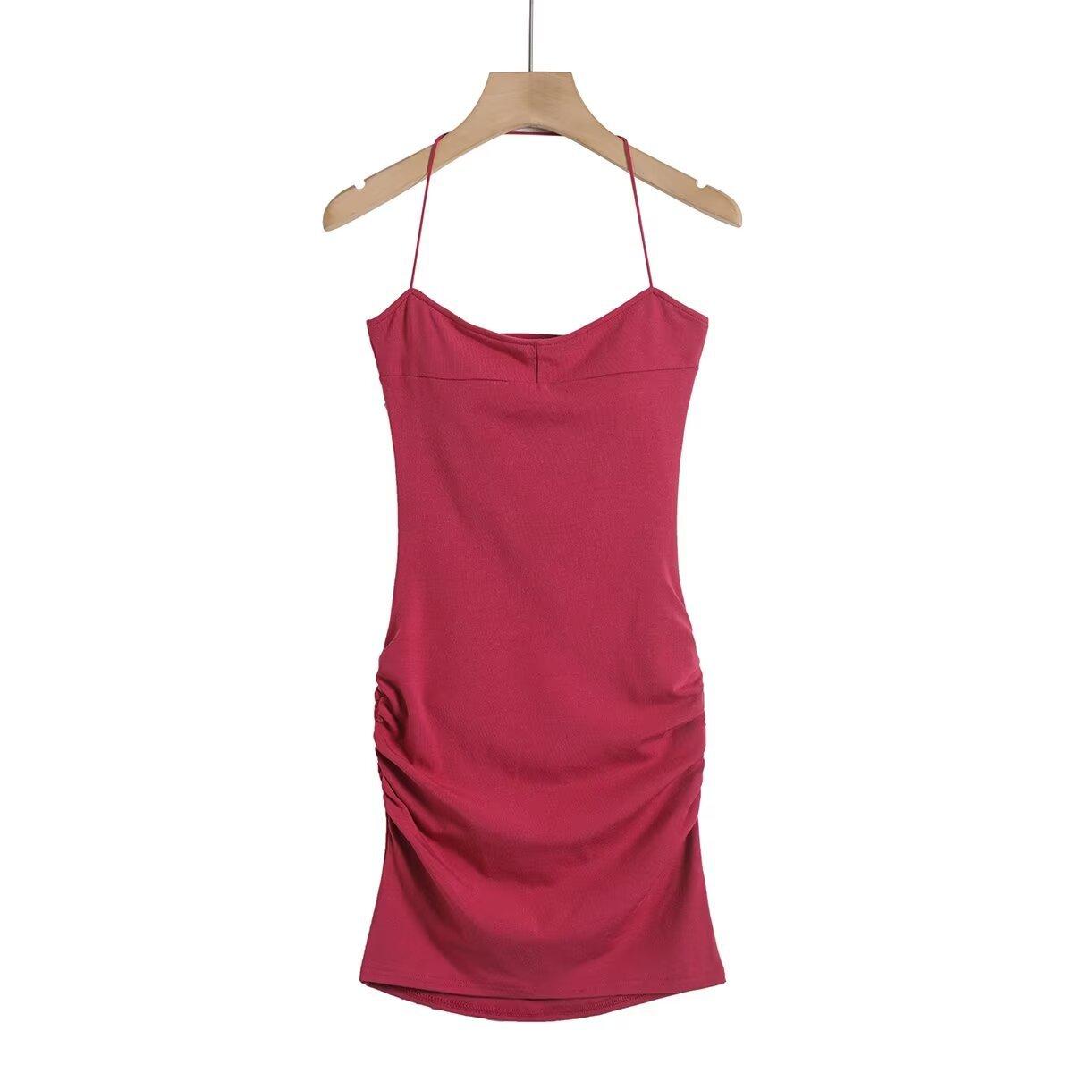 Spice Girls Vestido de Cuello con Tirante Delgado para Mujer Verano con Almohadilla en el Pecho Plisado Sexy Ajustado Adelgazante Cadera Largo Tubo Moderno Falda Corta