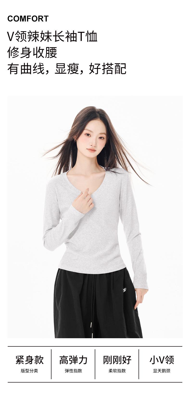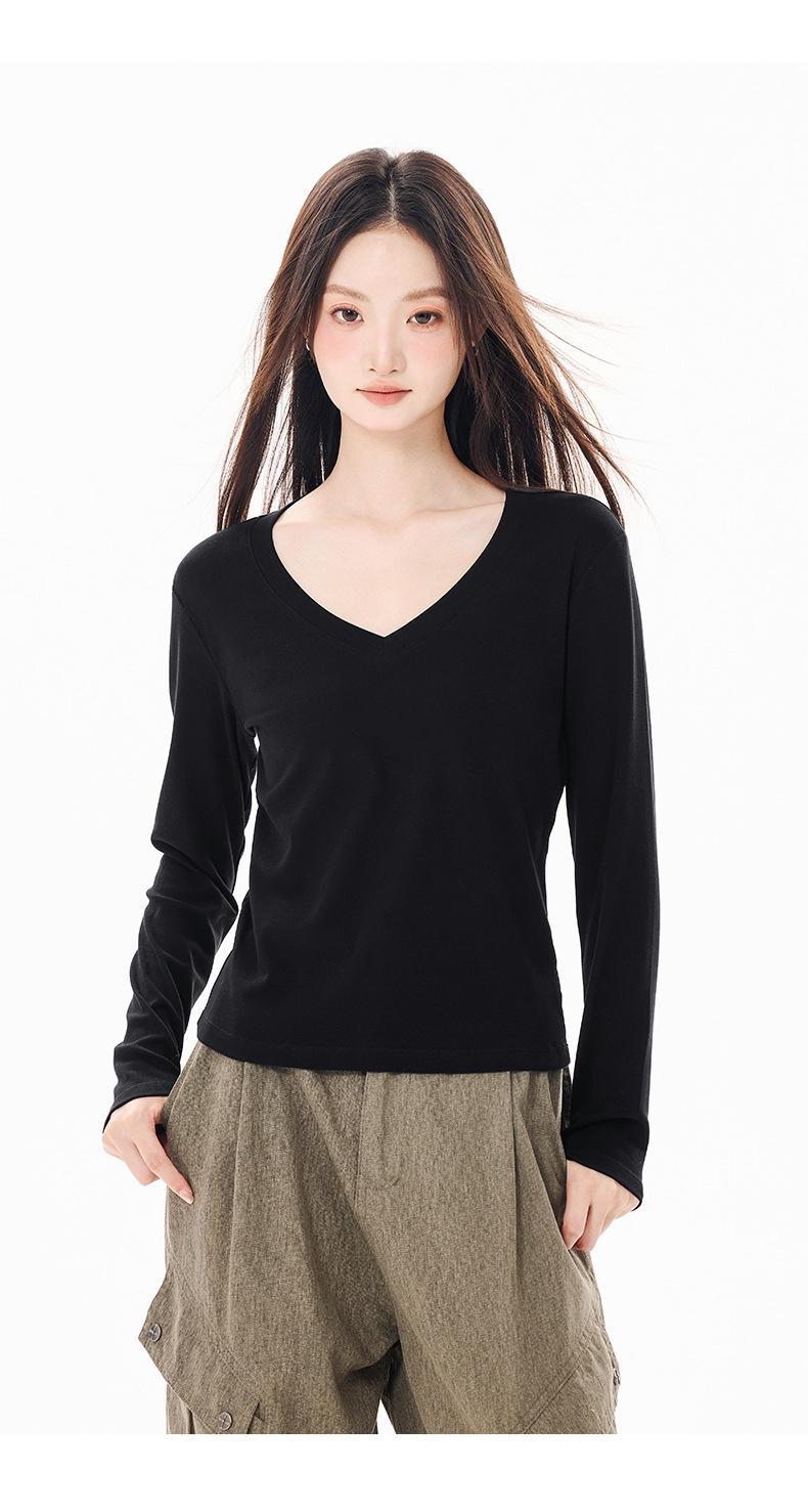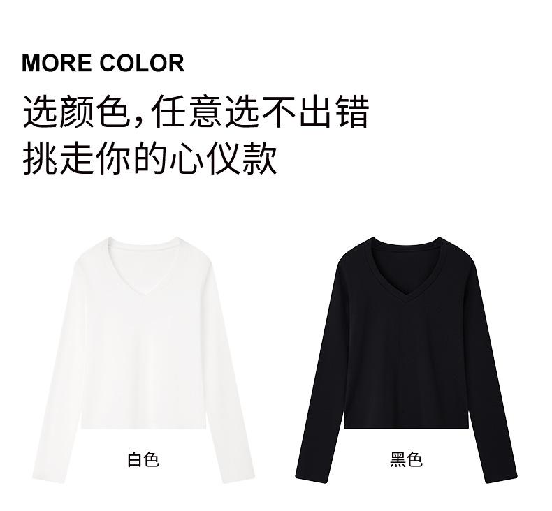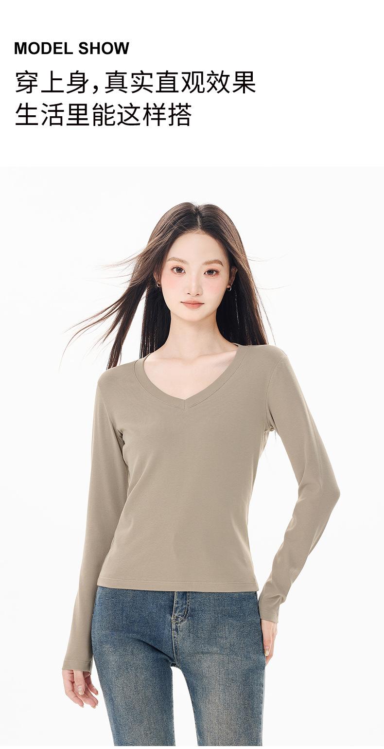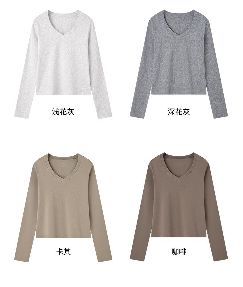 Camiseta de Manga Larga con Cuello en V de Color Sólido y Corte Slim para Mujer Otoño Nuevo Adelgazante Corto Chica Caliente Capa Interior Top Básico