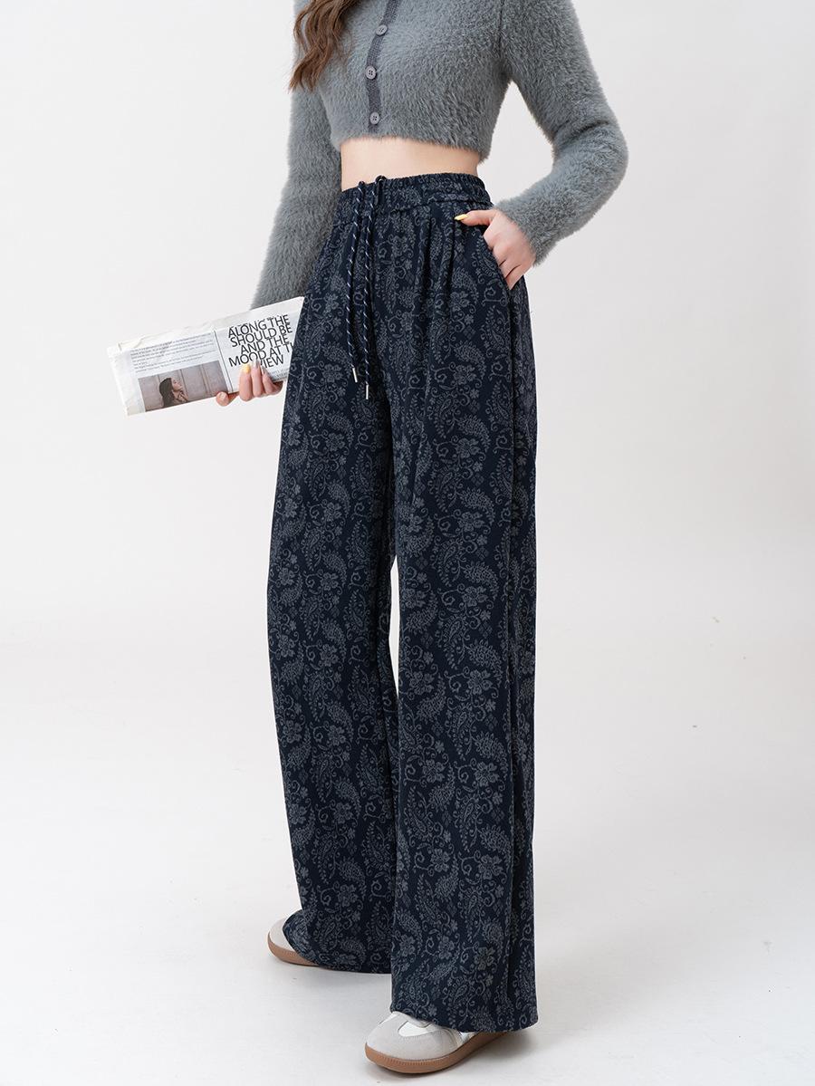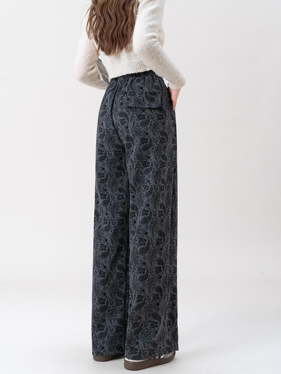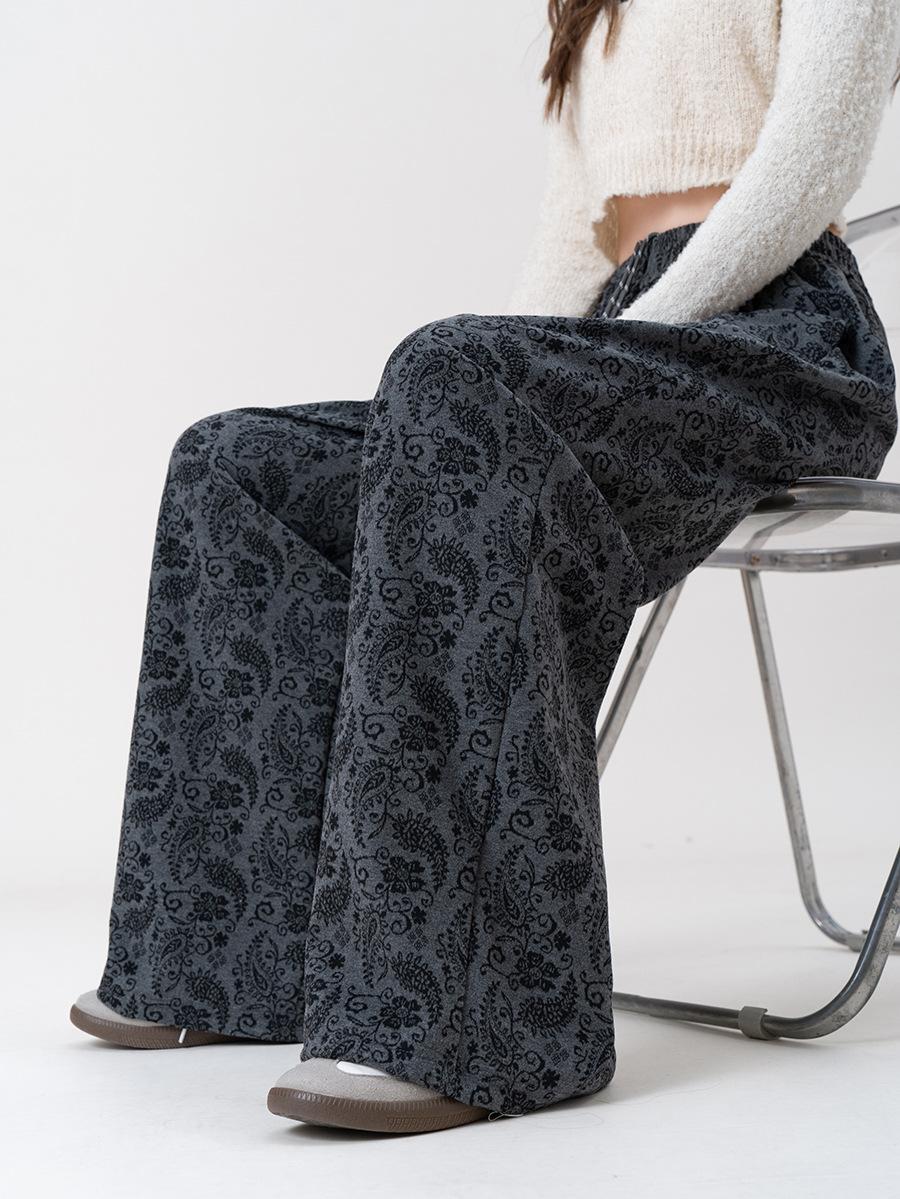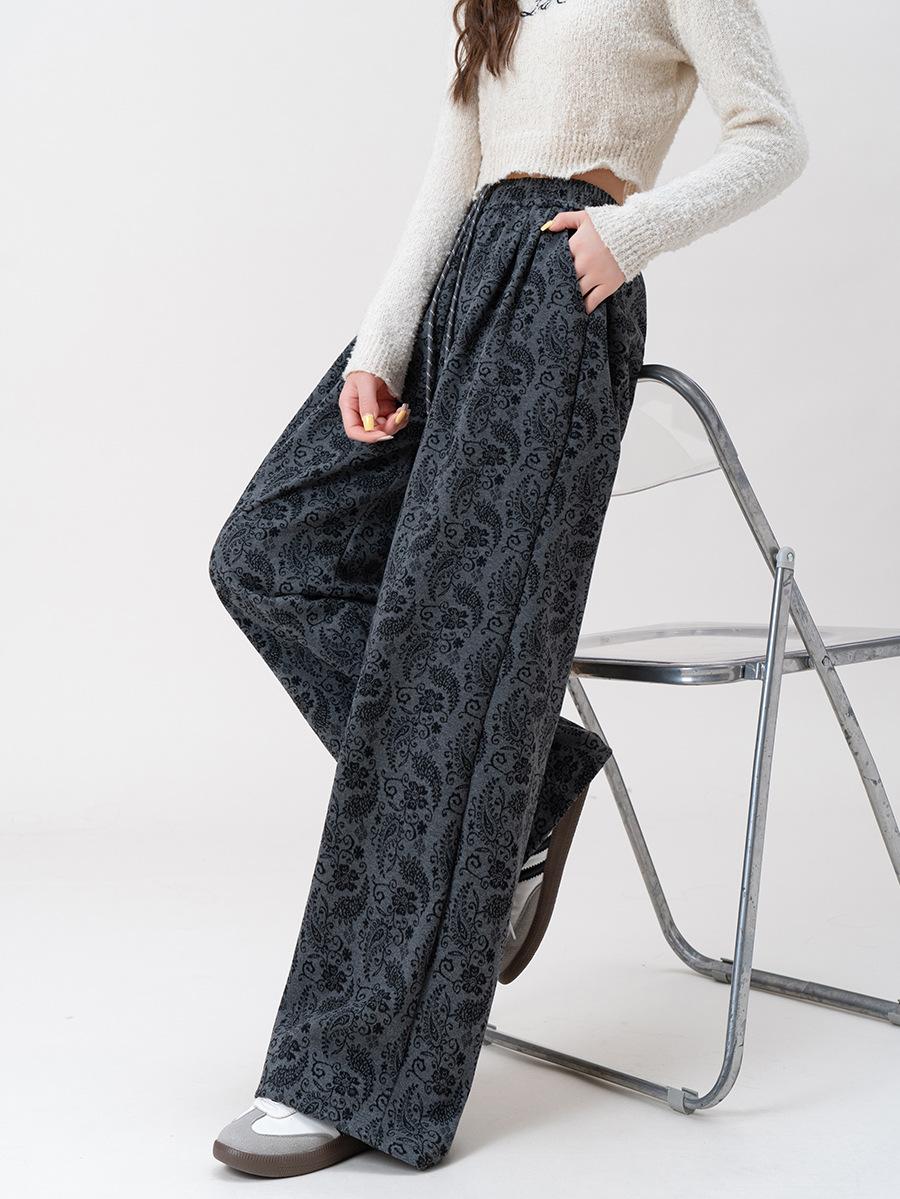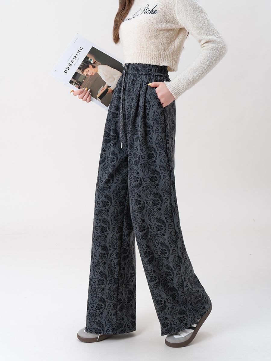 Pantalones Jacquard de Pierna Ancha para Mujer Otoño Invierno Gruesos Nuevos de Cintura Alta Sueltos Adelgazantes Casuales Pantalones Largos 8912