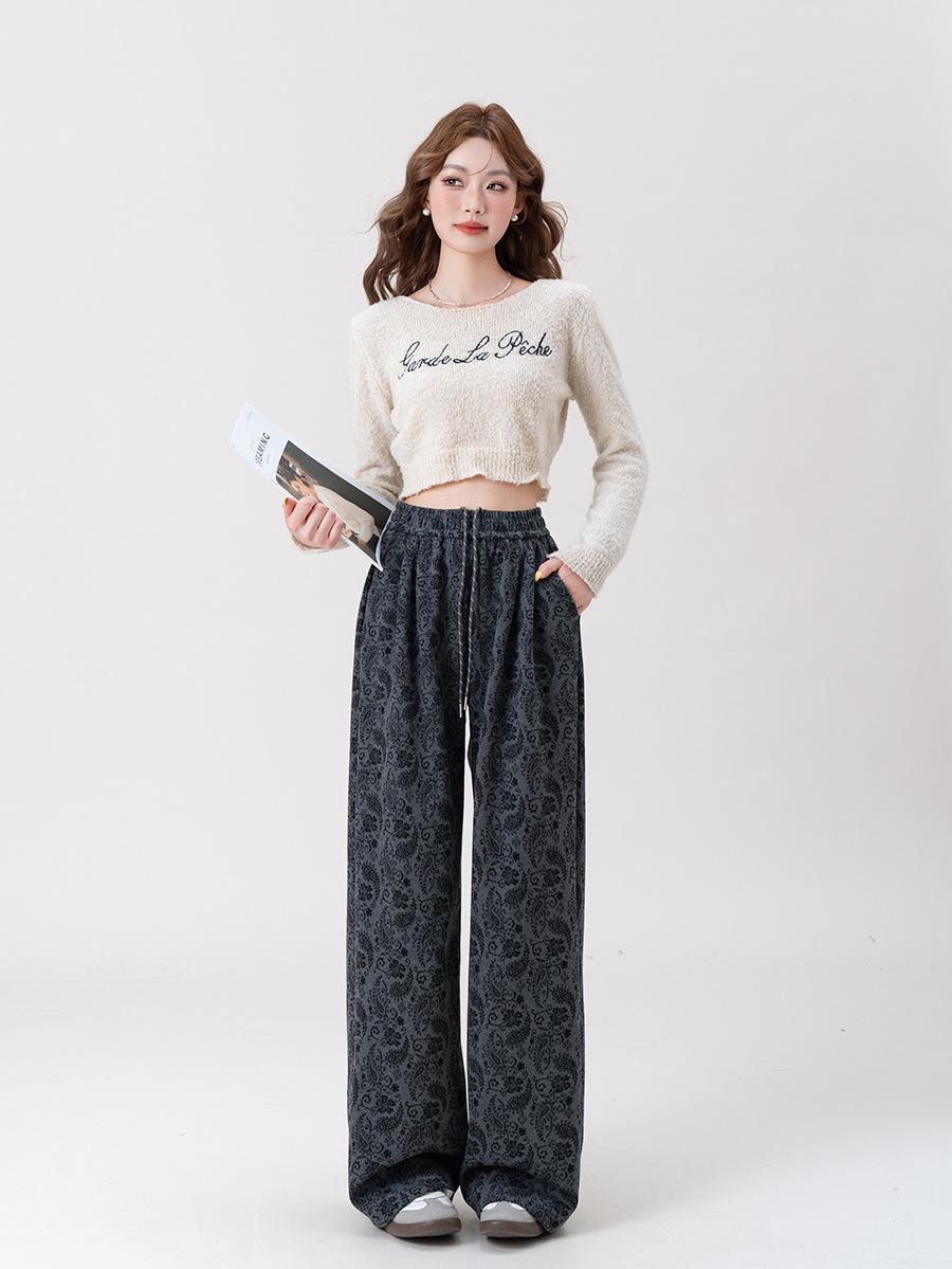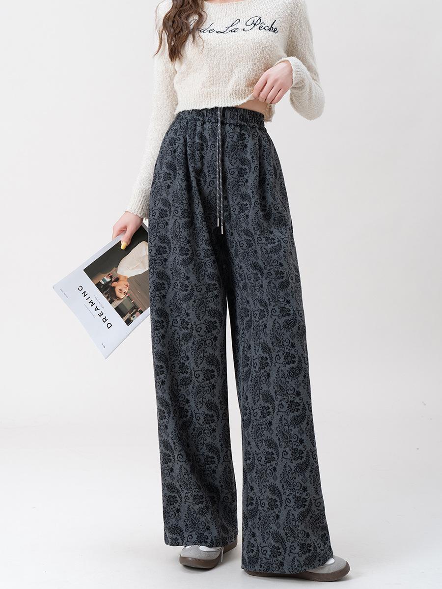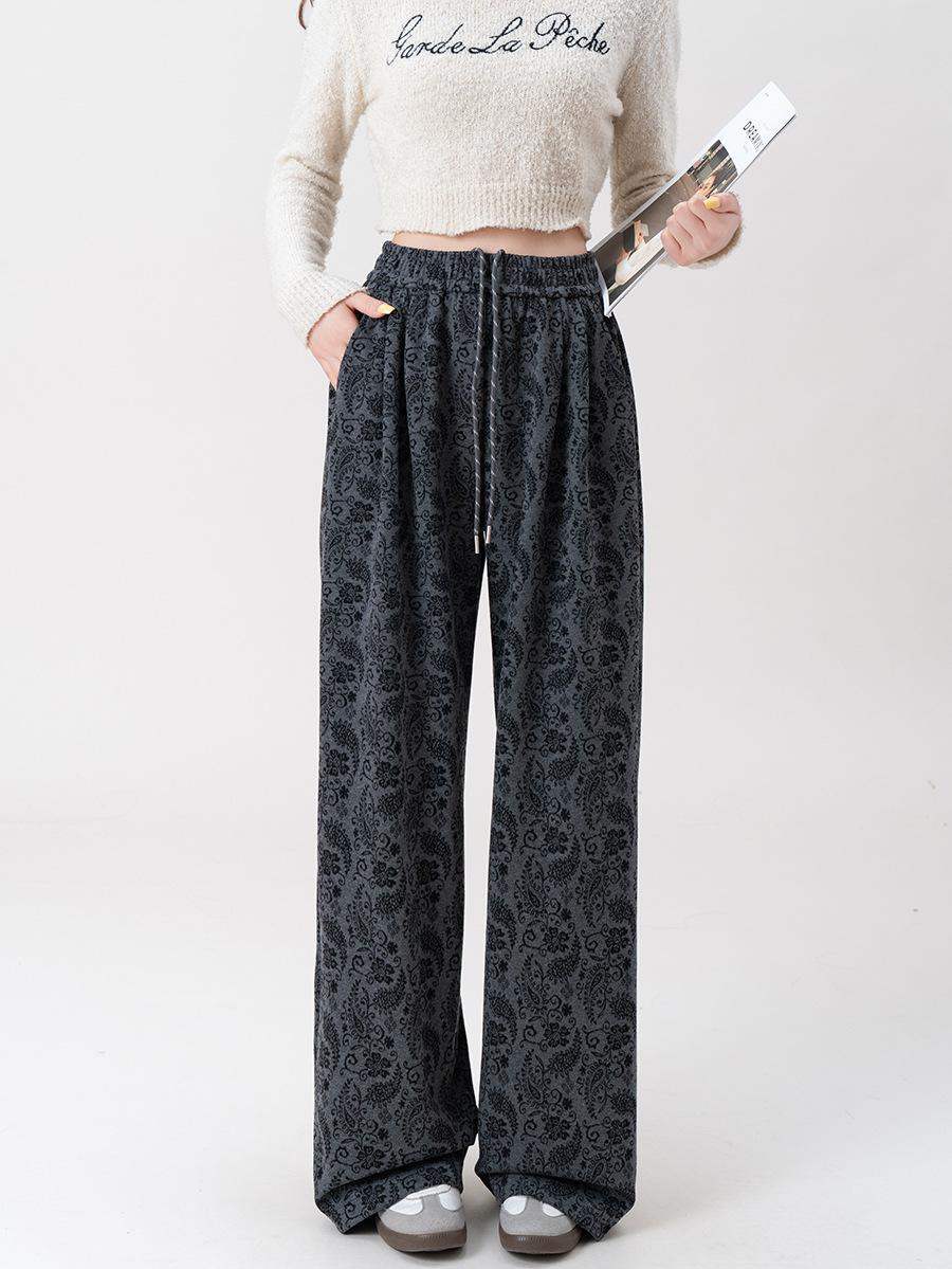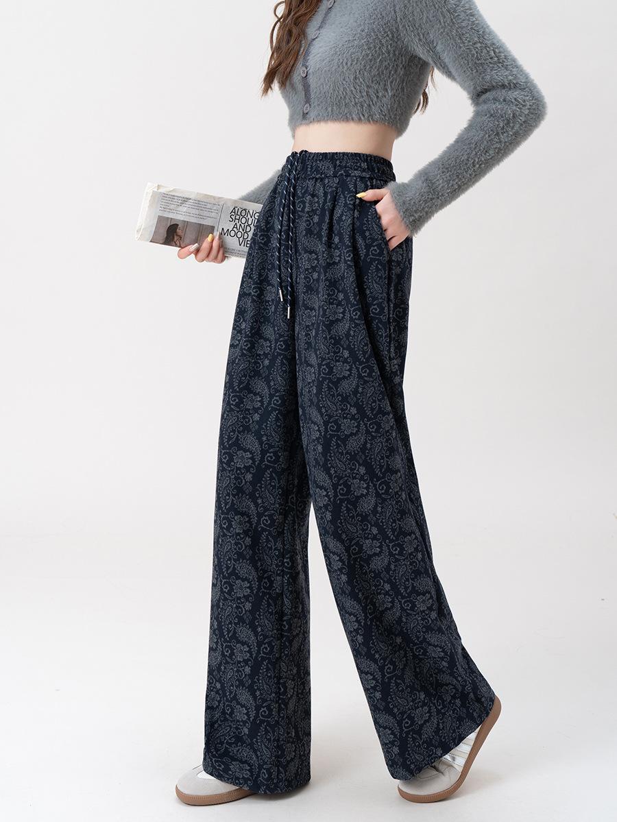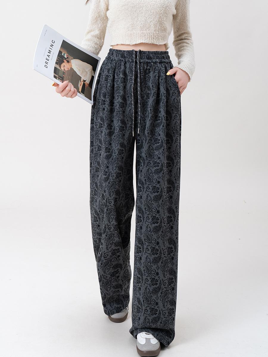 Pantalones Jacquard de Pierna Ancha para Mujer Otoño Invierno Gruesos Nuevos de Cintura Alta Sueltos Adelgazantes Casuales Pantalones Largos 8912
