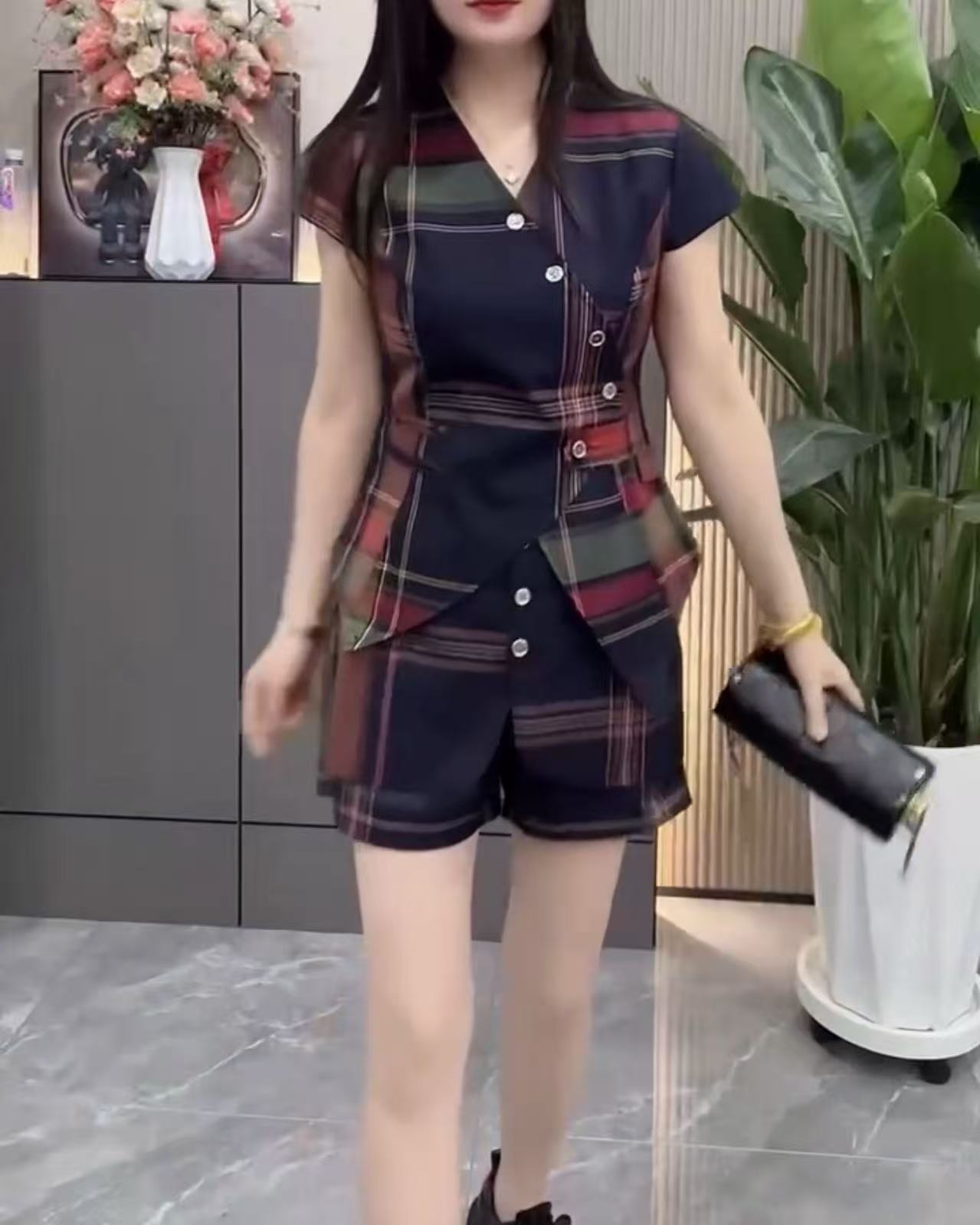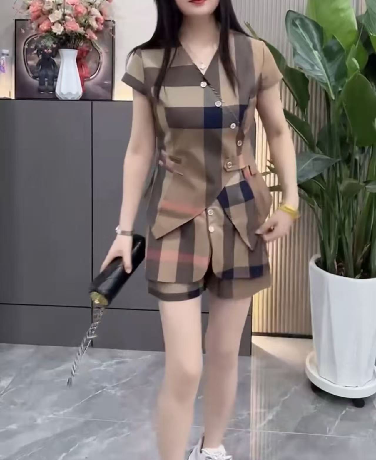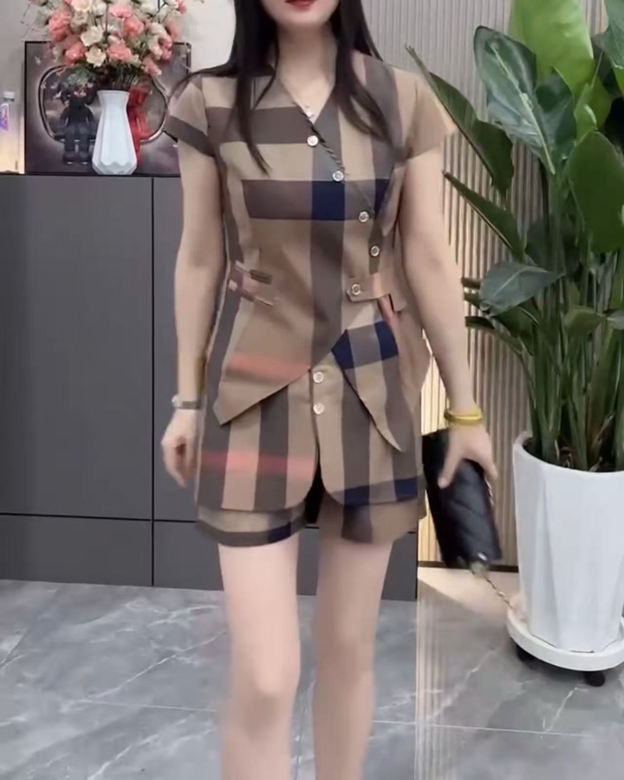 Khaki plaid two-piece set, Navy blue plaid two-piece set, Striped two piece set