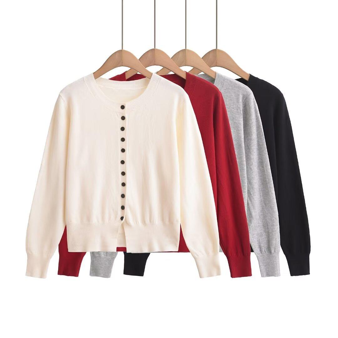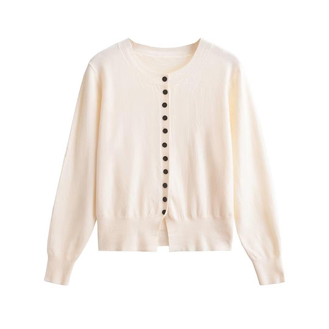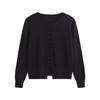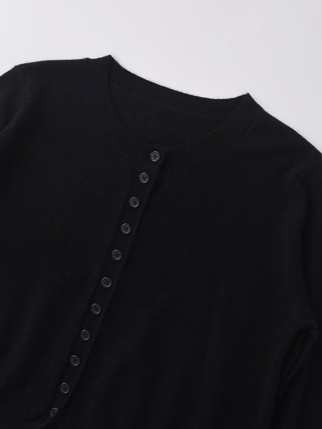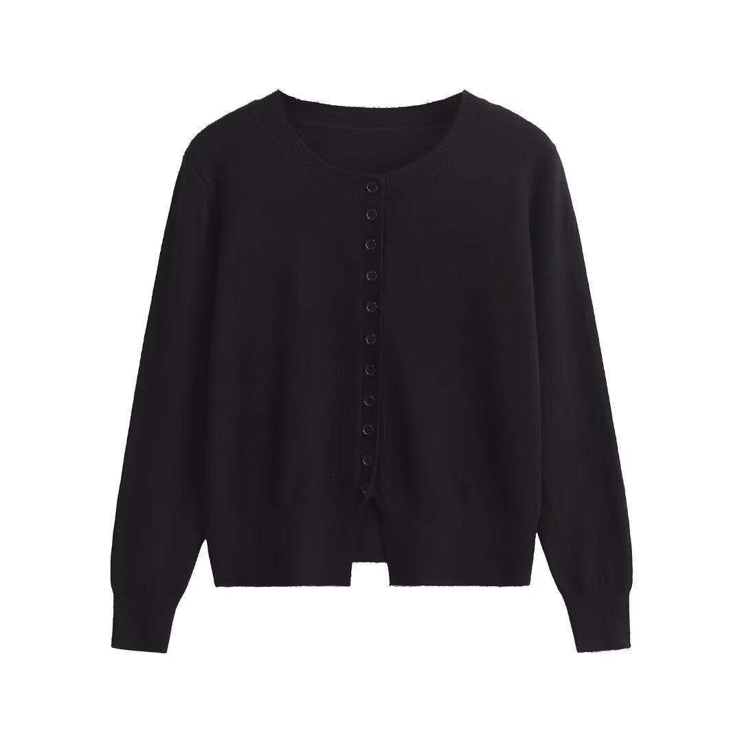 2024 Principios de Otoño Nuevo Estilo Coreano Negro Botón Cuello Redondo Sencillo Combinable Suéter de Manga Larga para Mujer Suéter de Ocio Puro