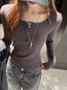 Camiseta de manga larga básica de nuevo estilo para otoño e invierno para mujer con botones de diseño por dentro y por fuera, top de cuello redondo estilo coreano en el hombro derecho