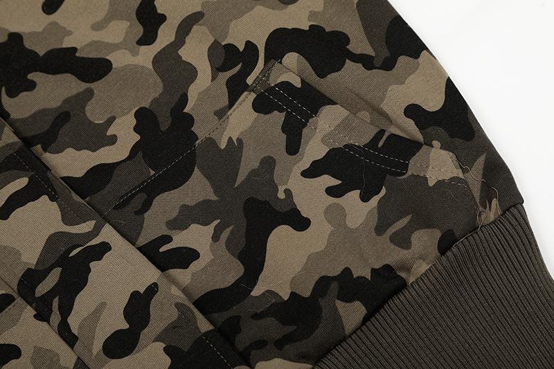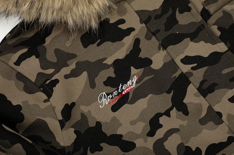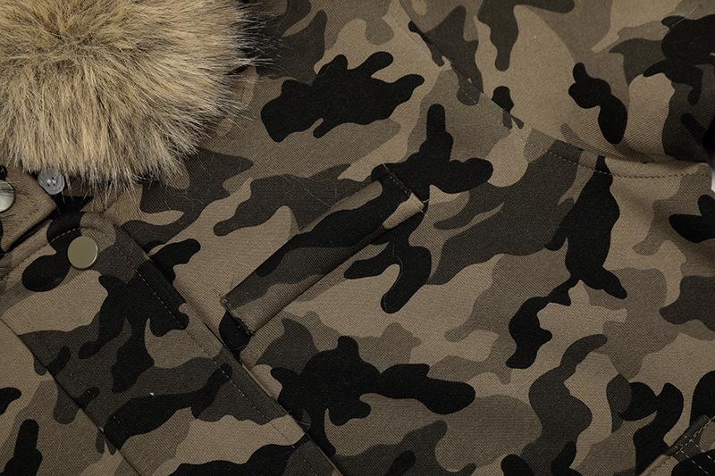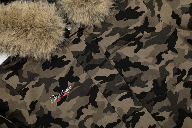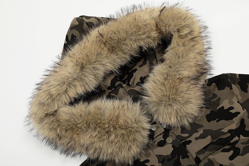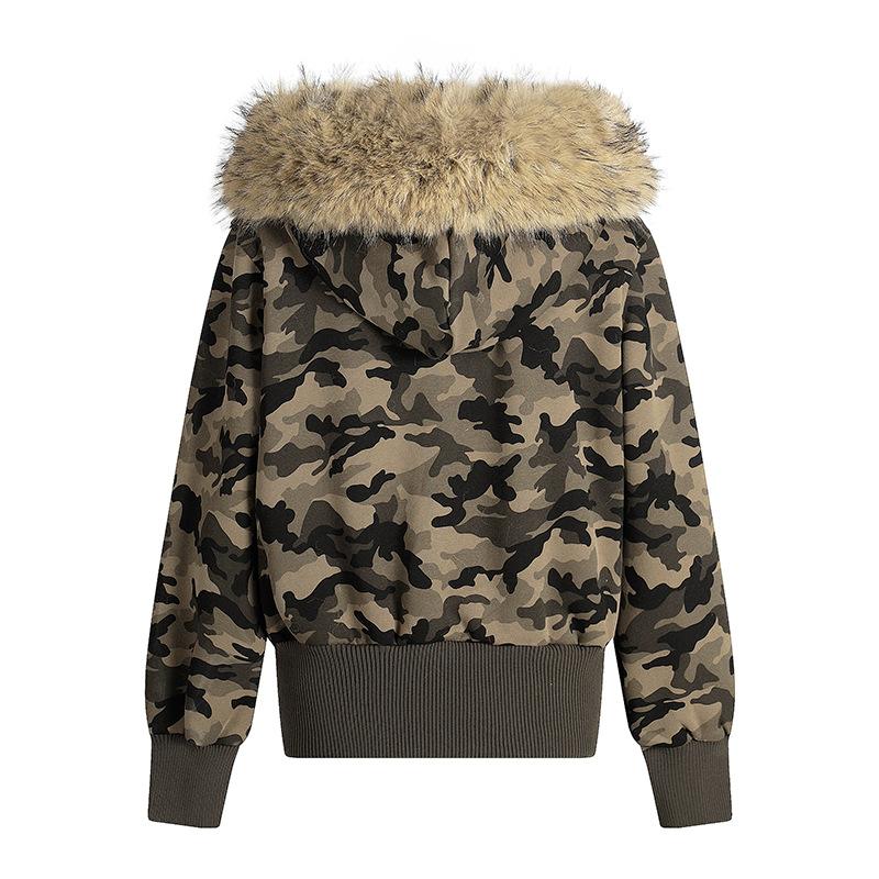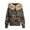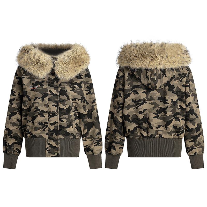 2025 Nueva Chaqueta Fina con Capucha y Cuello de Piel Camuflaje Retro Americano para Mujer, Holgada, Casual, Versátil, con Sentido del Diseño, Top