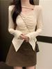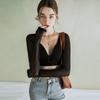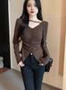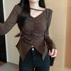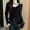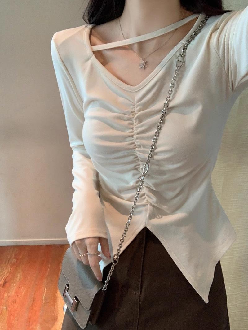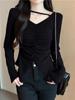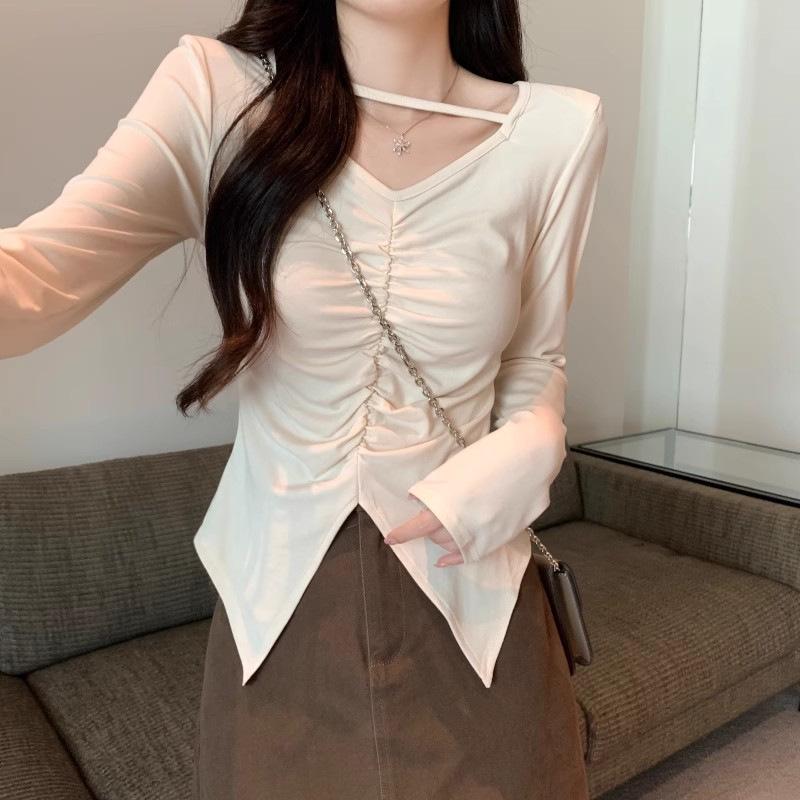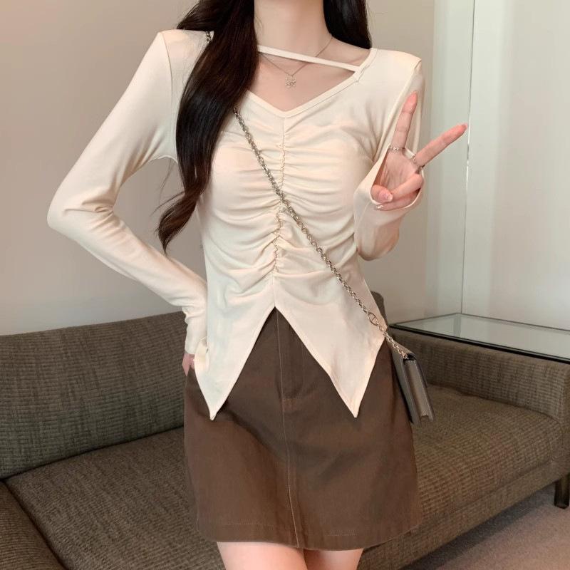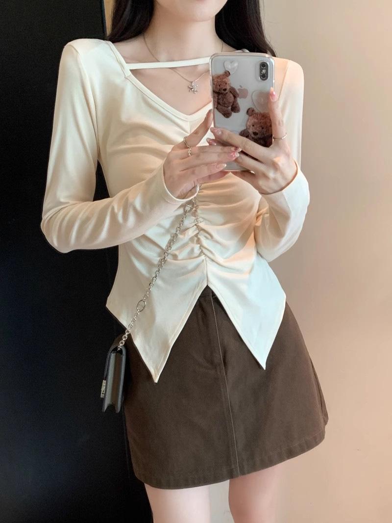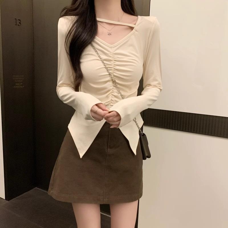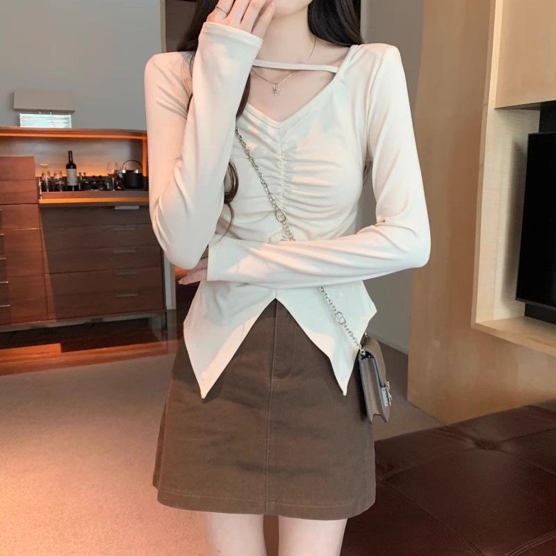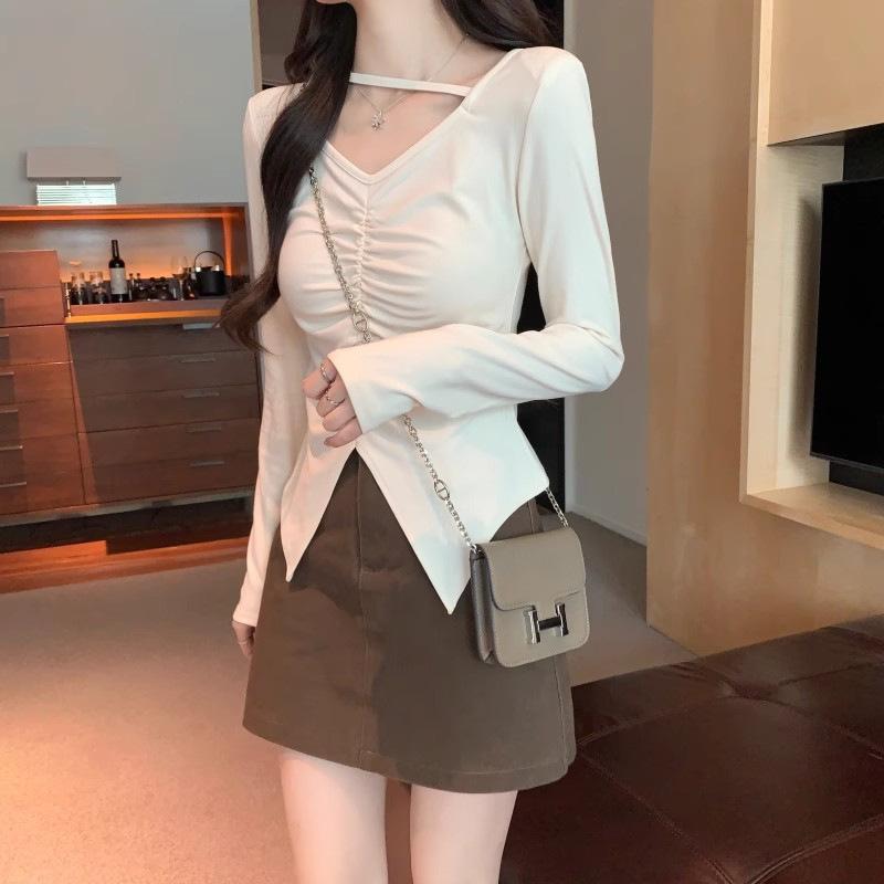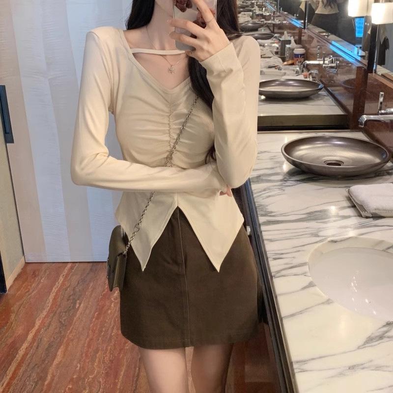 2024 principios de otoño nuevo temperamento de chica caliente cuello en V abertura manga larga camiseta sexy puro nicho moda top ins