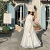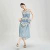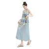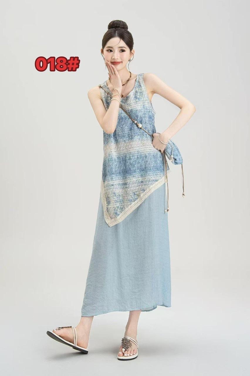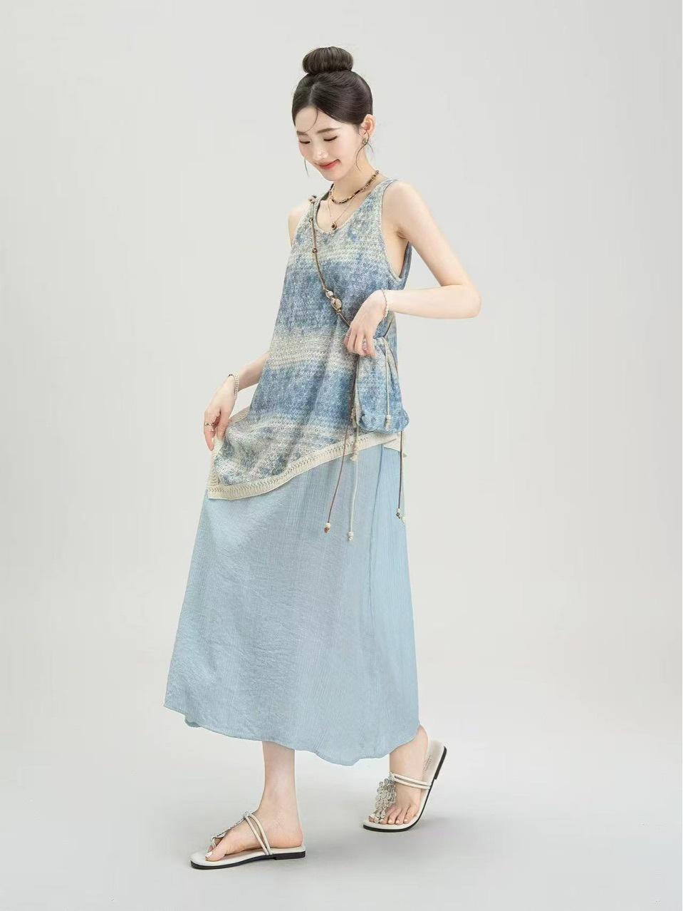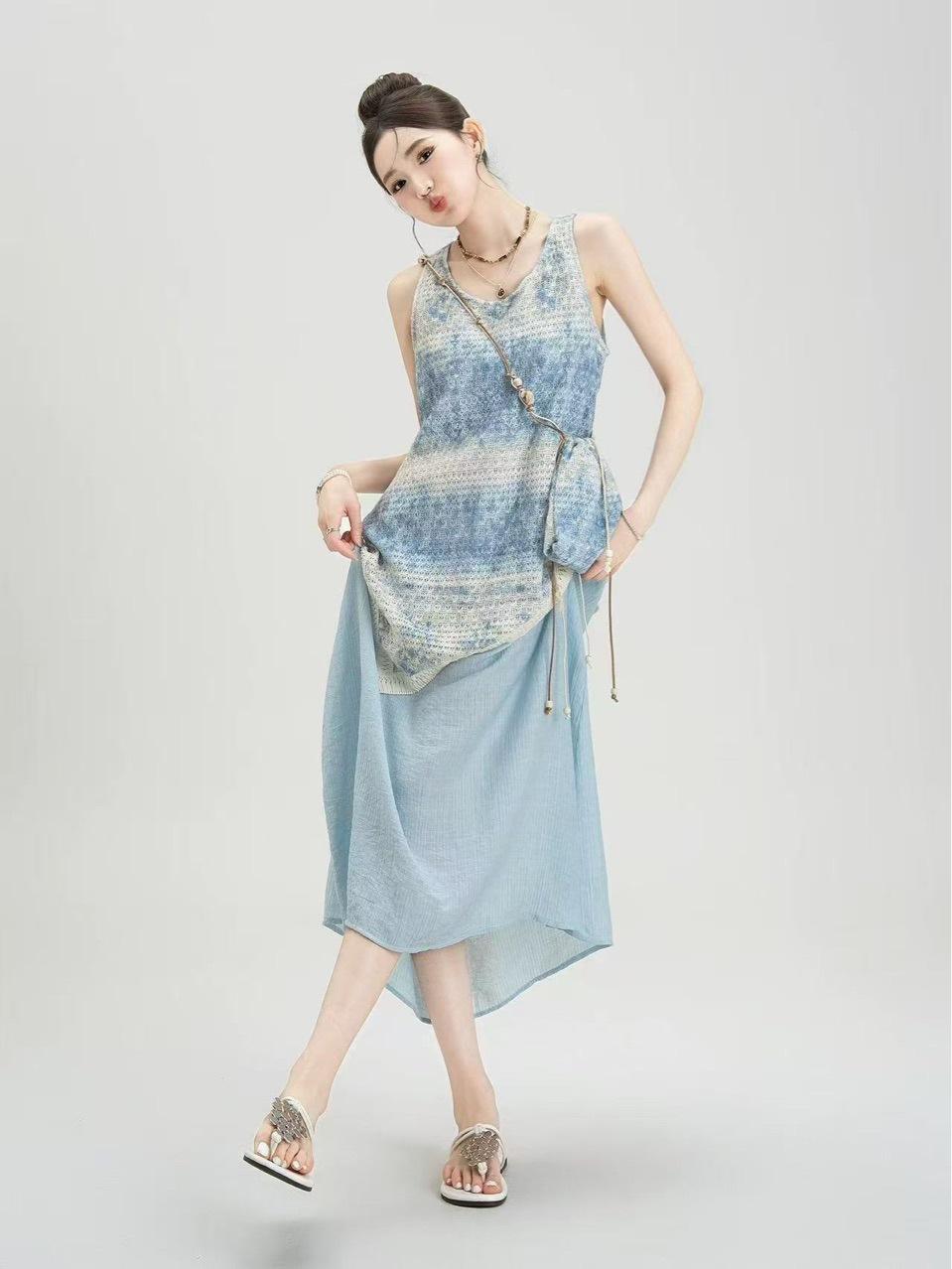 Vestido Chaleco Irregular con Flecos y Empalme Falso de Dos Piezas para Mujer Verano Azul Degradado Estilo Dulce Costero con Bolso