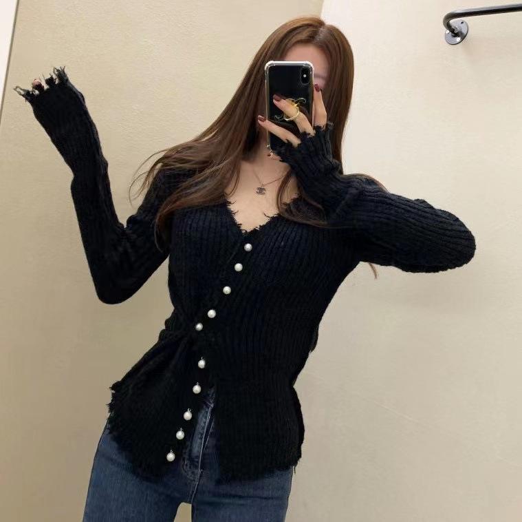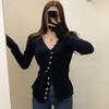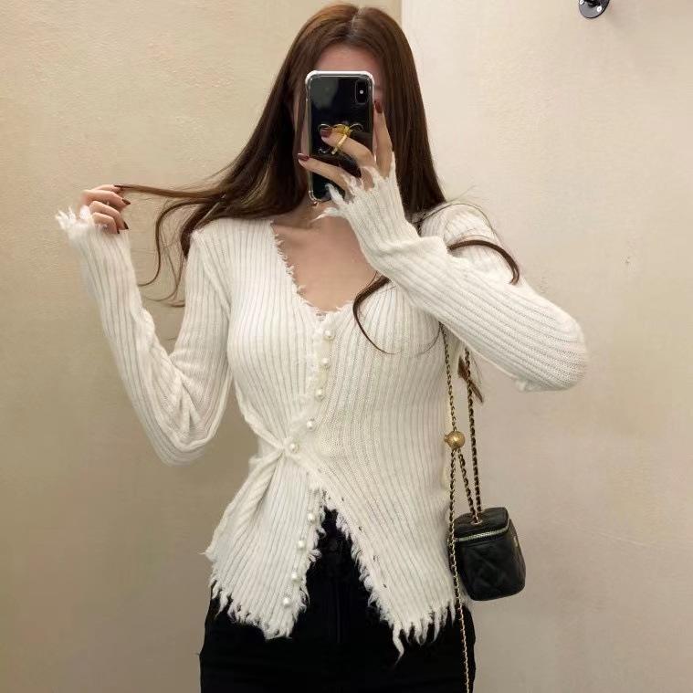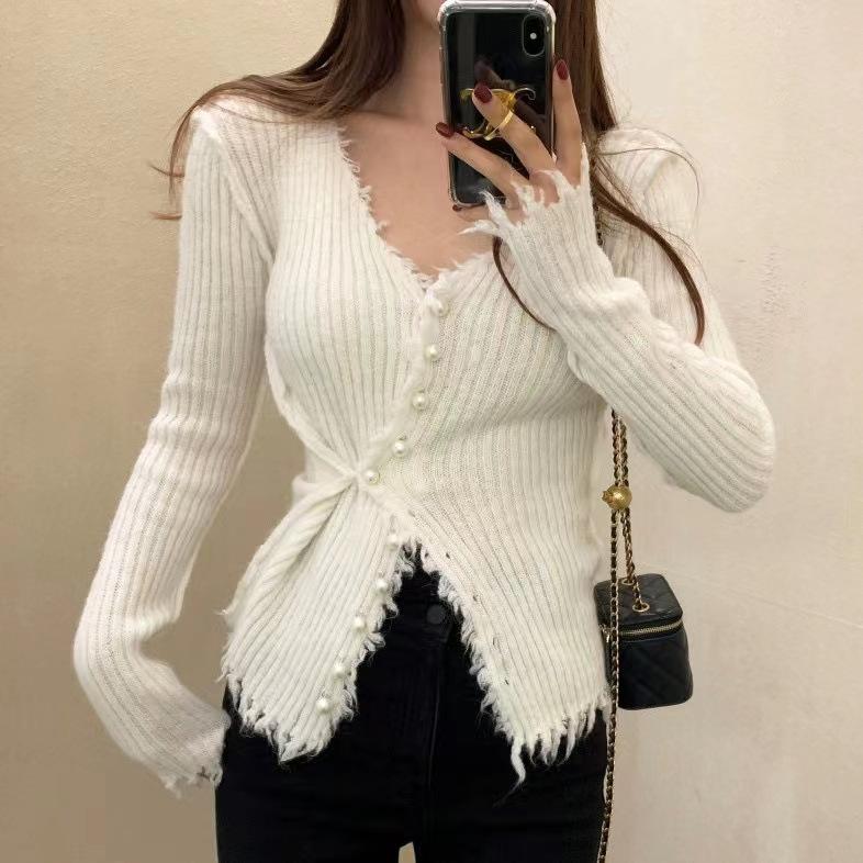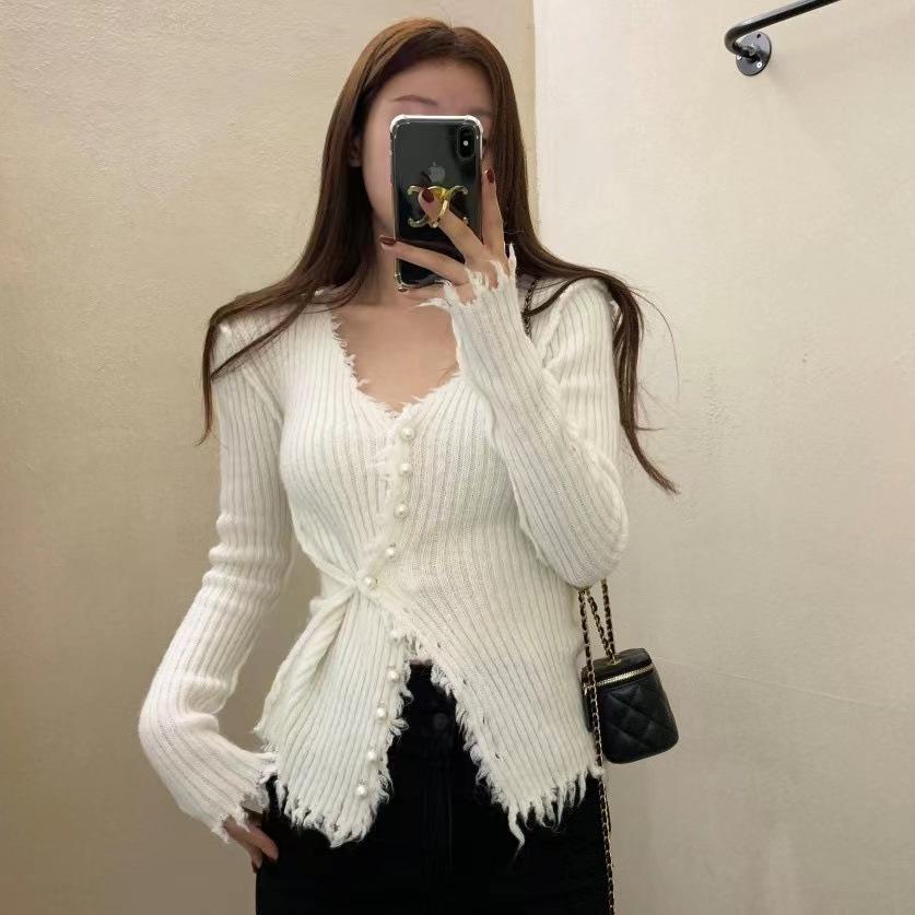 Deseo Puro Chica Caliente Sexy Ajustado Adelgazante Cuello en V Manga Larga Diseño Camiseta Nicho Único Chic Top Ins Mujeres