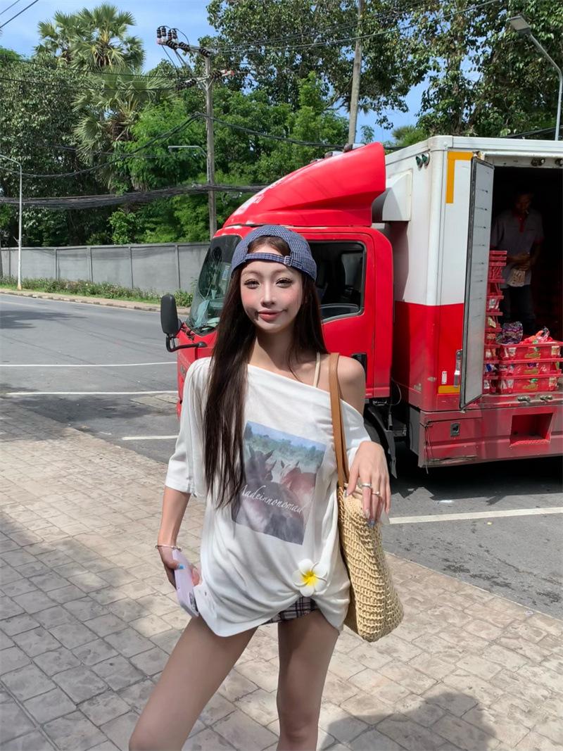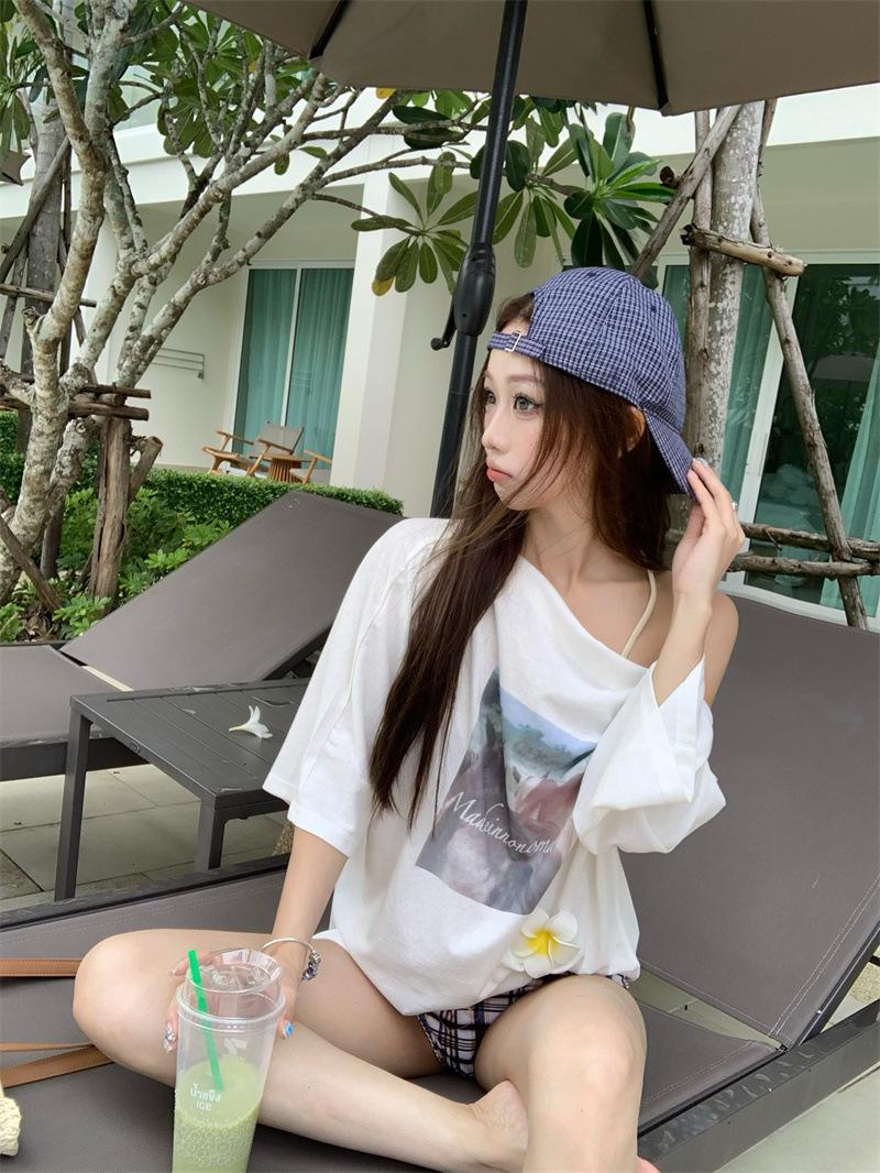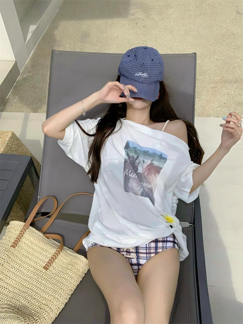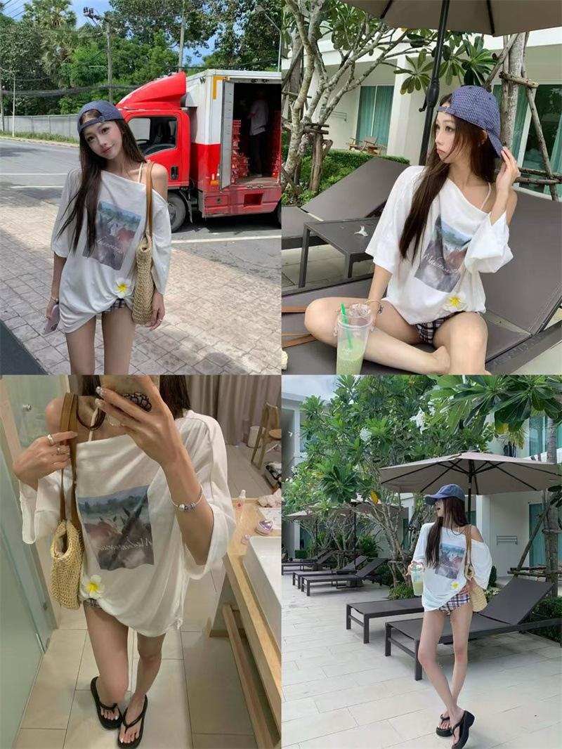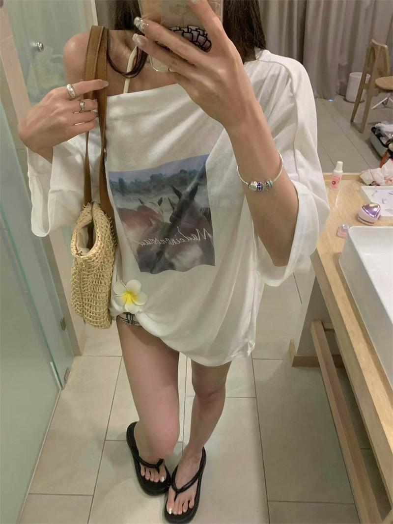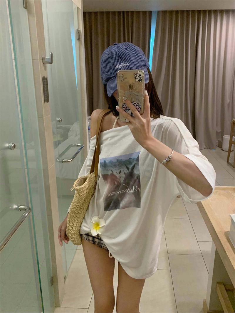 Camiseta Blanca de Manga Corta Estilo Perezoso para Mujer en Verano Largo Medio Holgada Aspecto Adelgazante Casual Relajada Estampada Hombro Inclinado Top