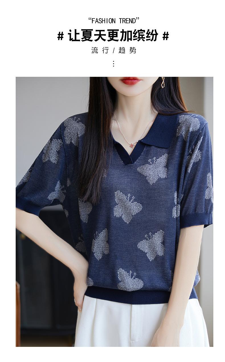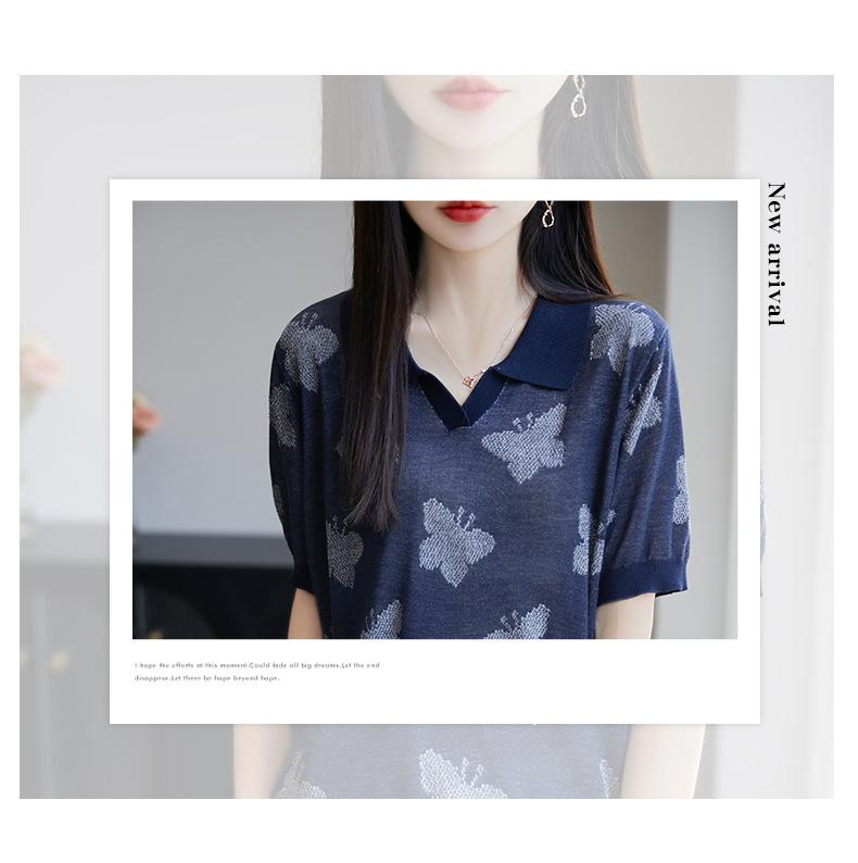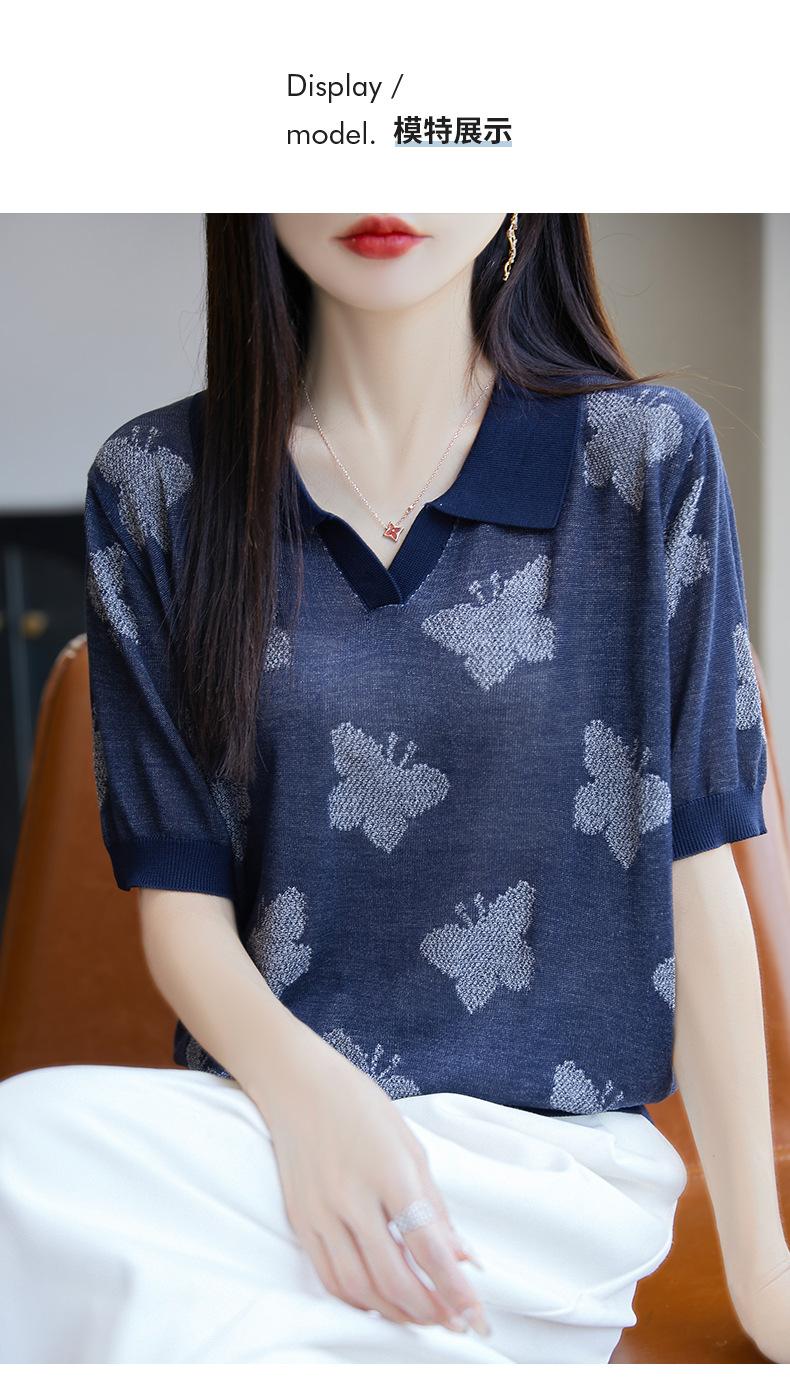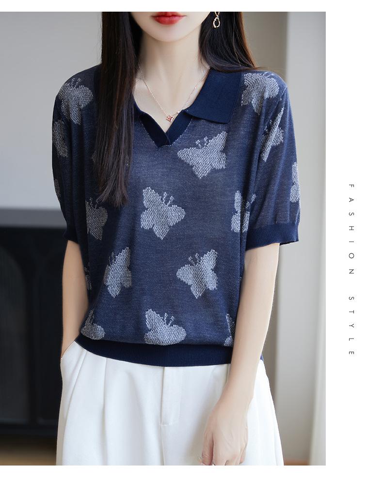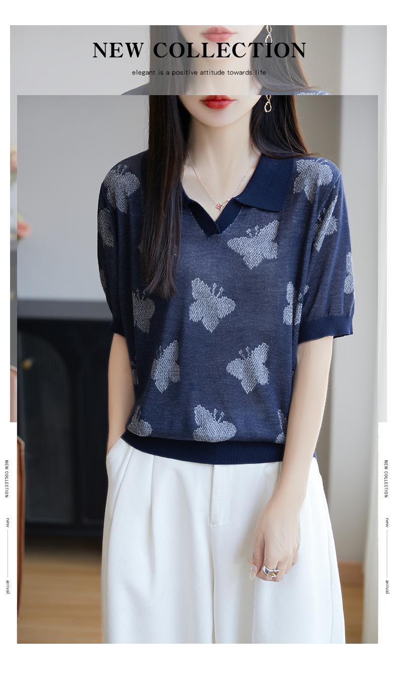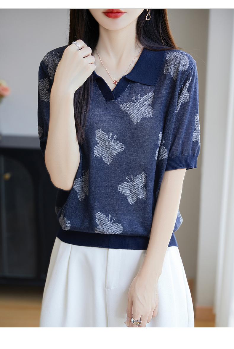 2025 Nuevo Verano Solapa Jacquard Mariposa Manga Corta Punto Camiseta Top Delgado Versátil Transpirable para Mujer