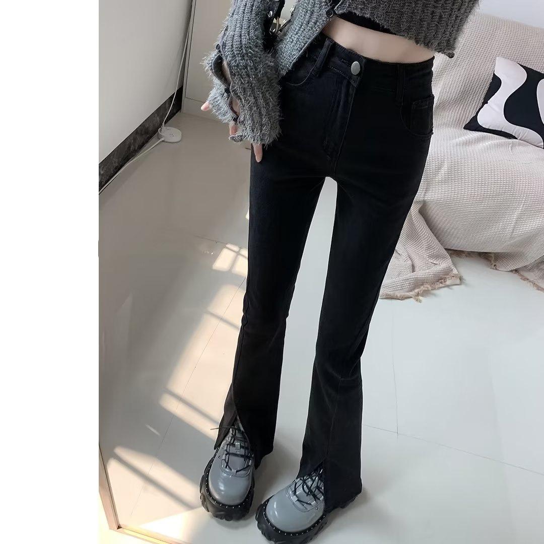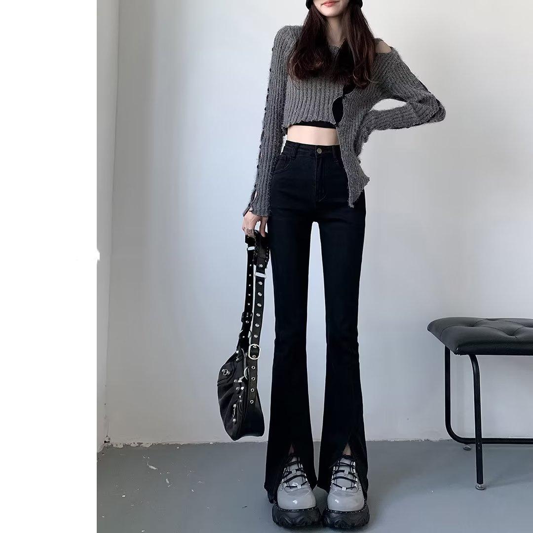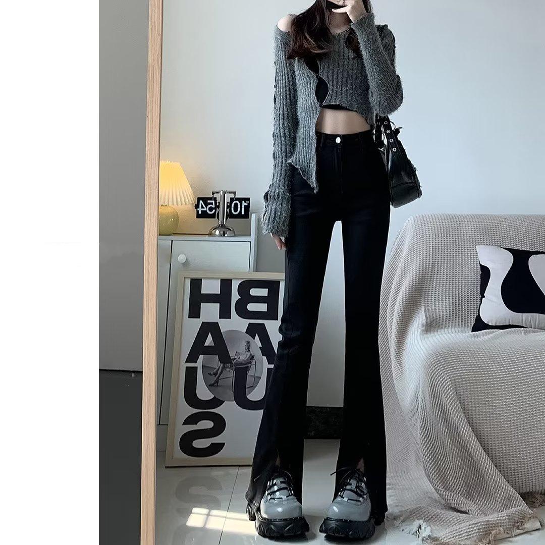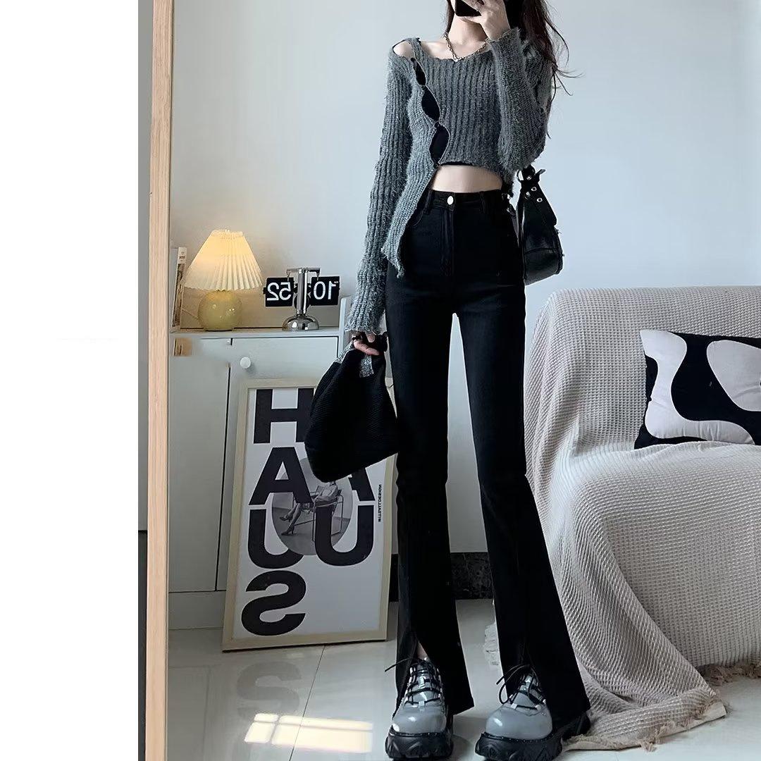 Jeans Rectos Negros con Abertura Edición Estrecha para Mujer Primavera y Otoño 2025 Nuevos Cintura Alta Adelgazantes Pantalones de Pierna Ancha Pequeños