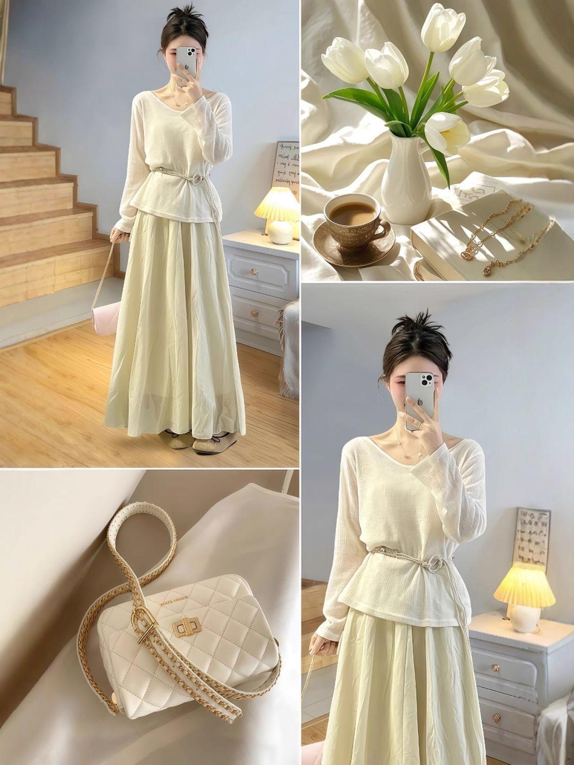 Long Sleeve + Belt + Midi Skirt 【Set】