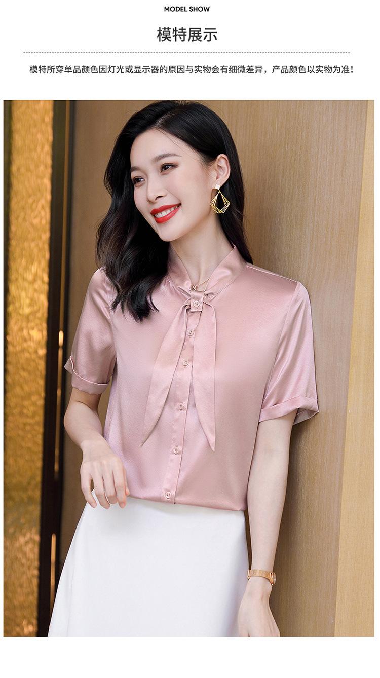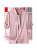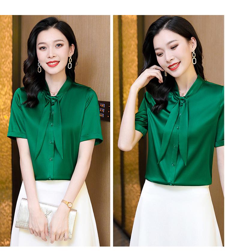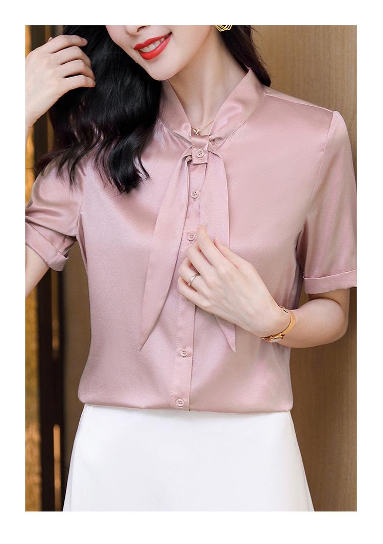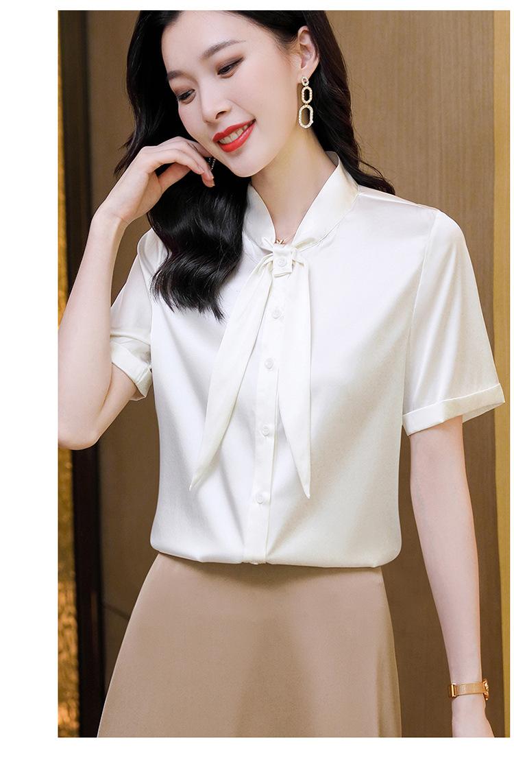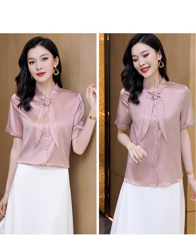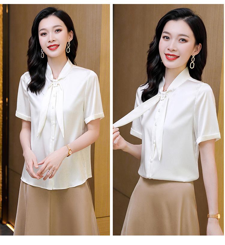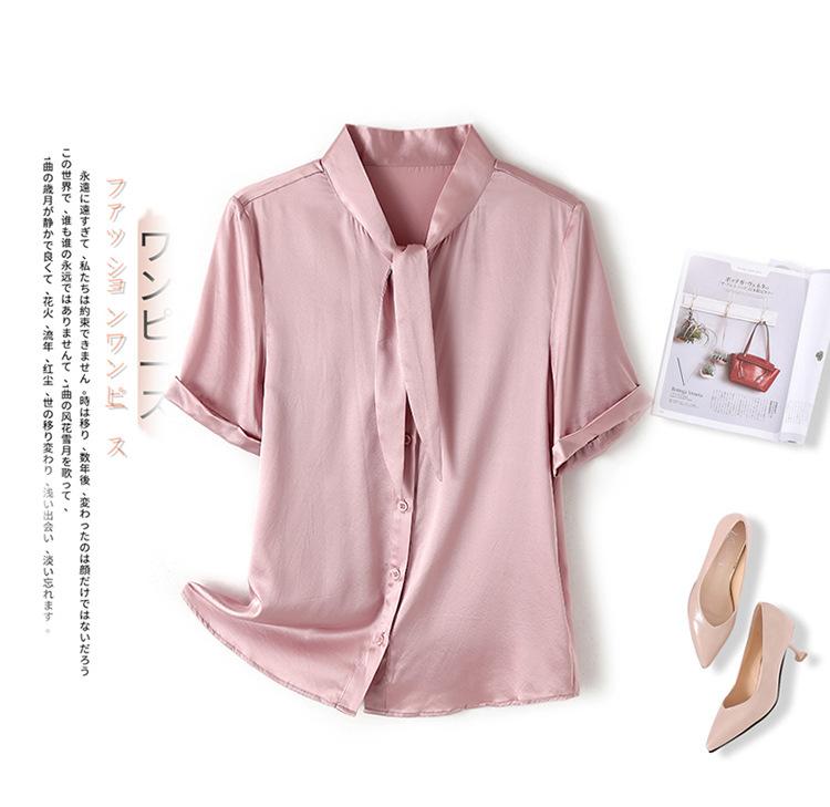 Verano Nuevo Estilo Encaje Diseño de Seda Color Sólido Estilo Elegante Maduro Versátil Moda Lazo Camisa de Manga Corta para Mujer