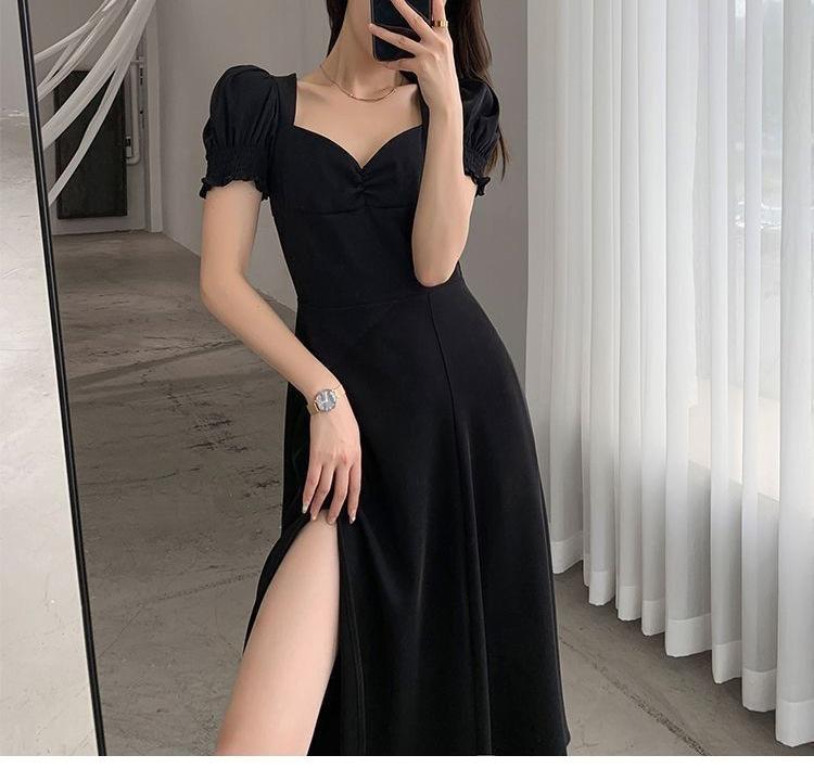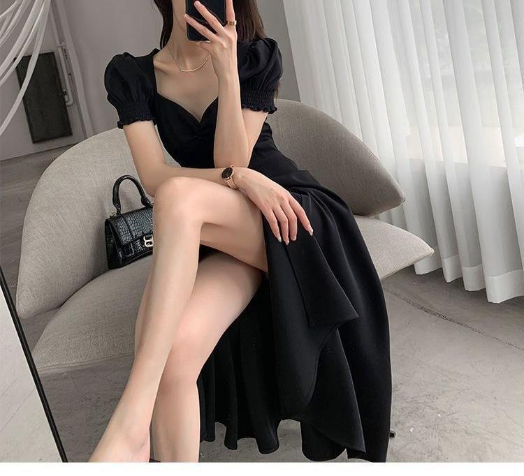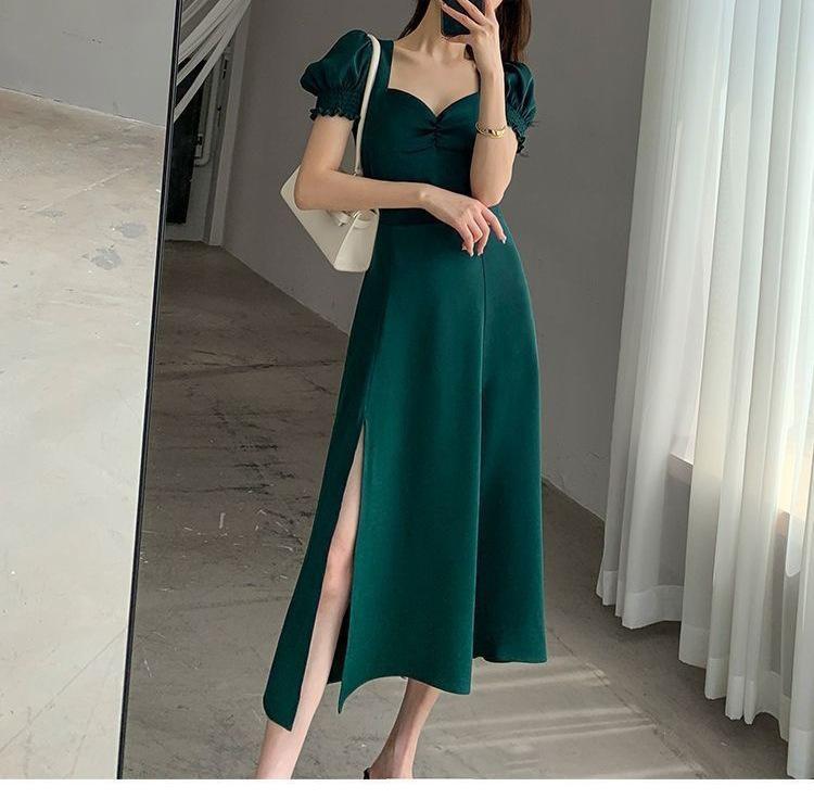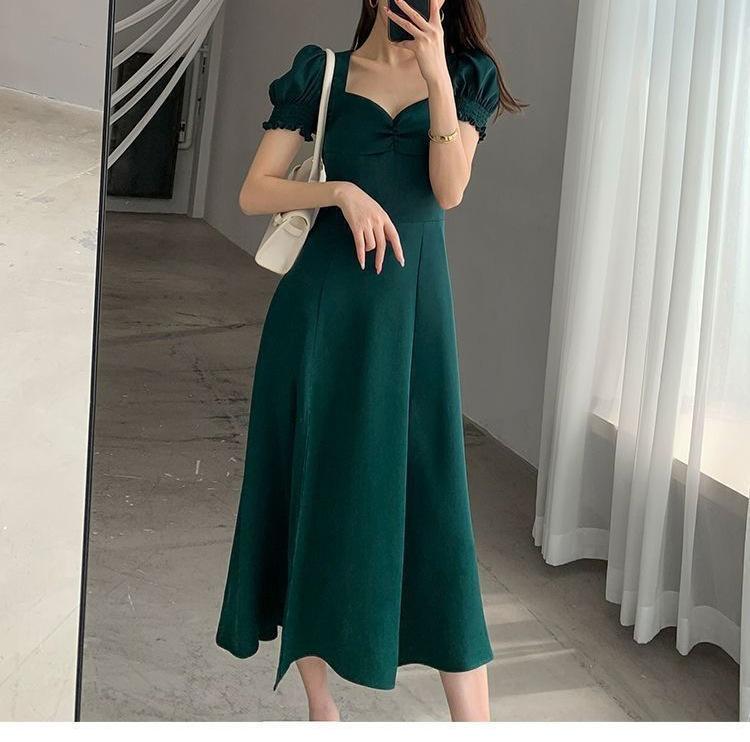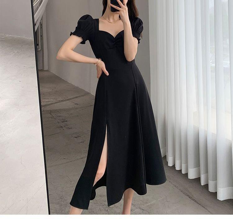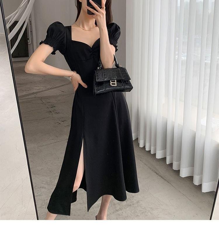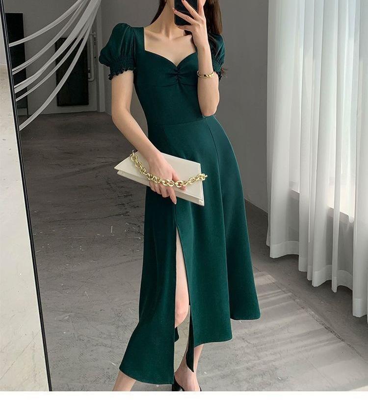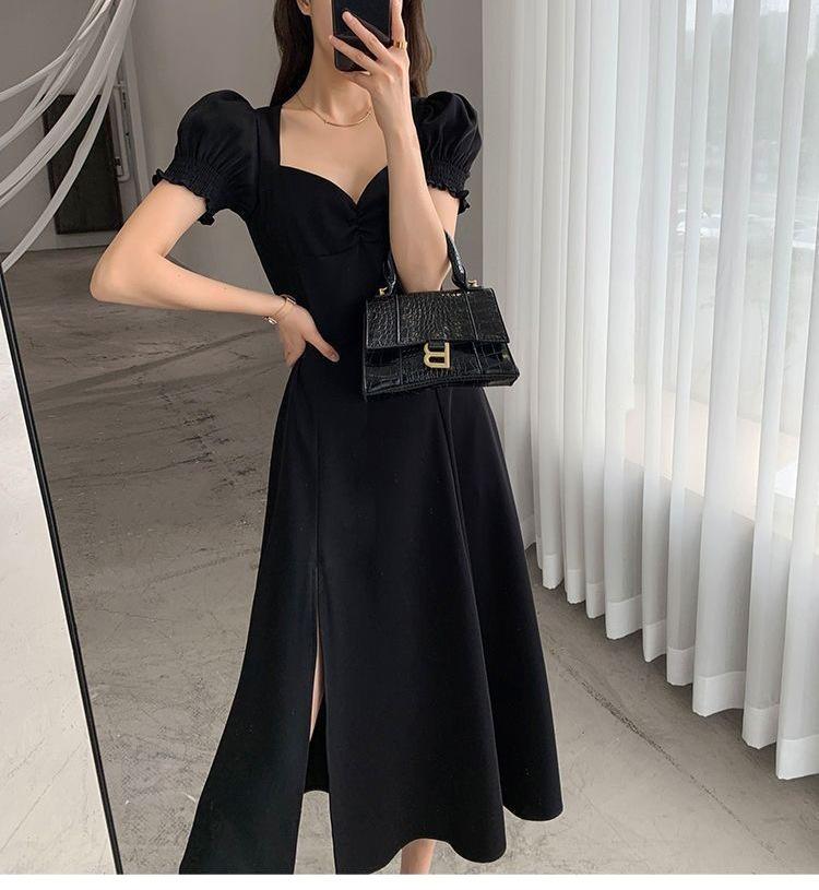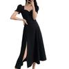 Vestido Largo Estilo Hepburn Elegante Cuello Cuadrado Retro Manga Farol Francesa Línea A Verano Nuevo vestido Vestido Largo con Abertura