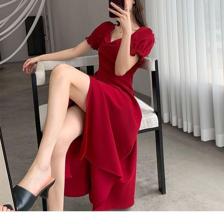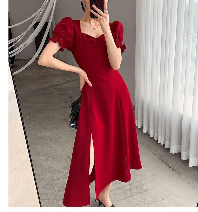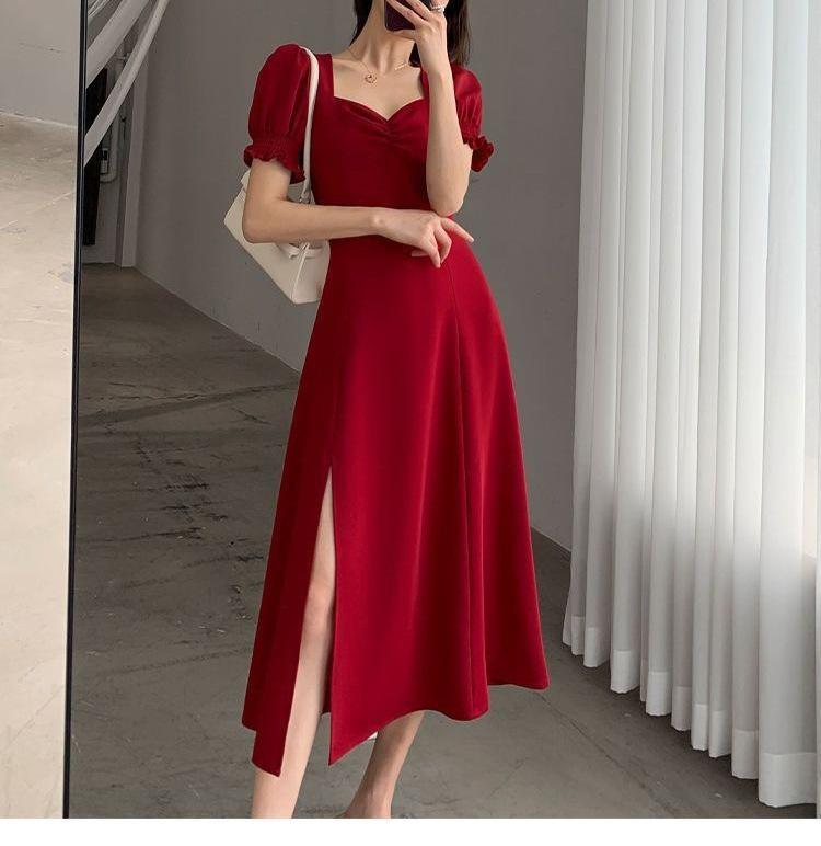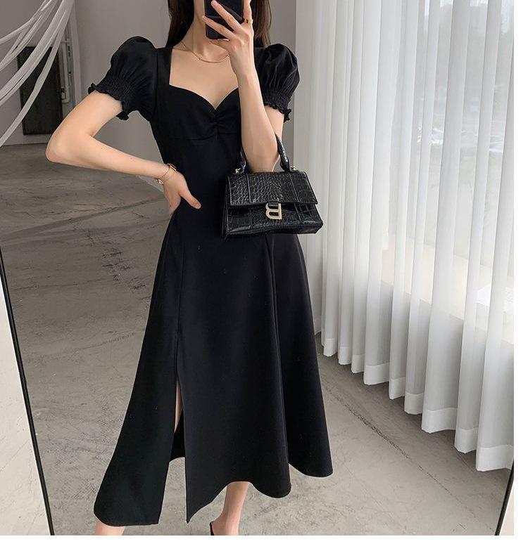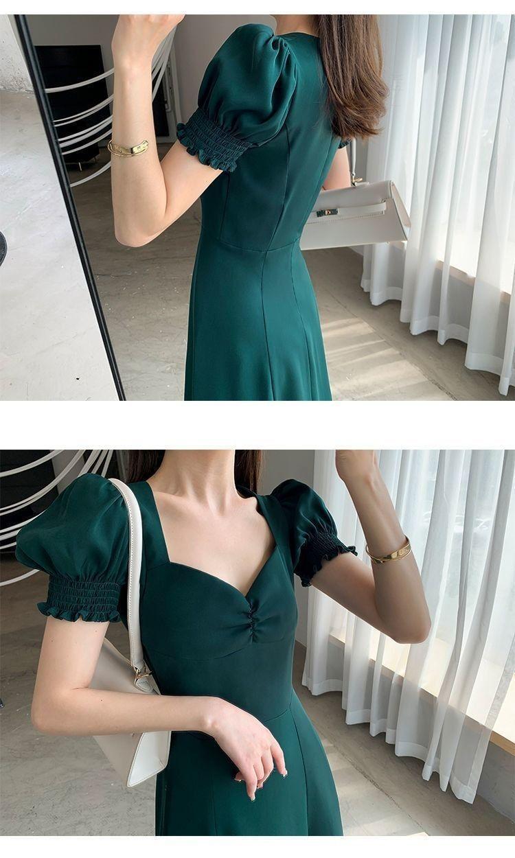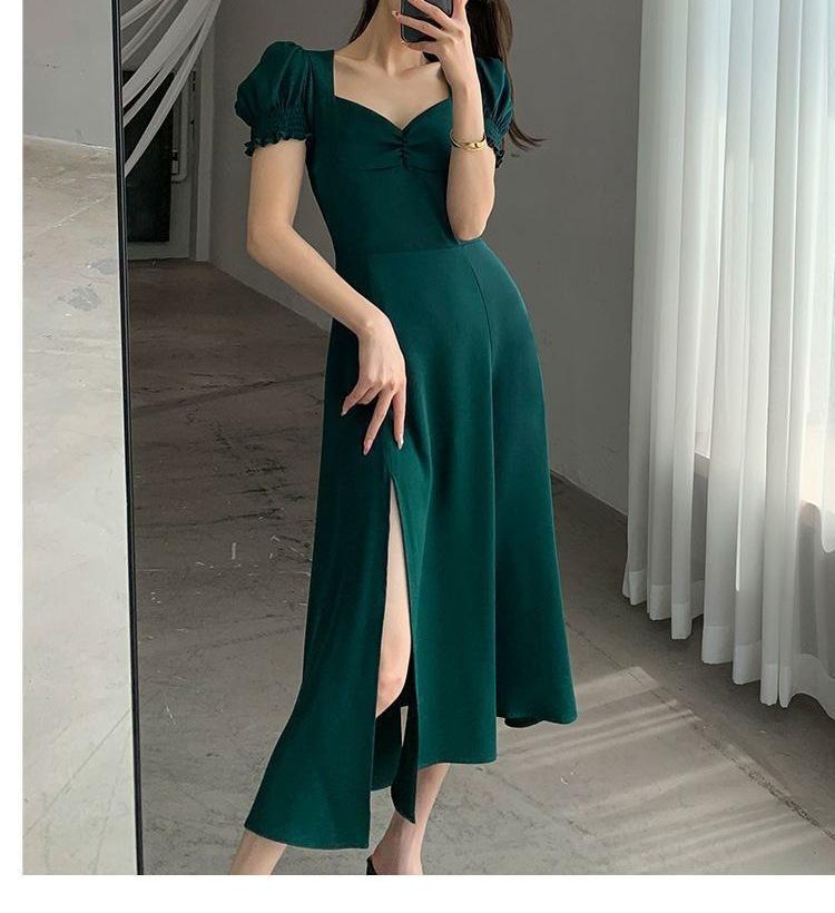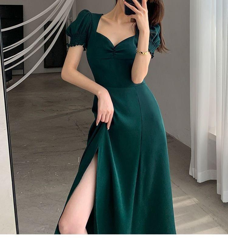 Vestido Largo Estilo Hepburn Elegante Cuello Cuadrado Retro Manga Farol Francesa Línea A Verano Nuevo vestido Vestido Largo con Abertura