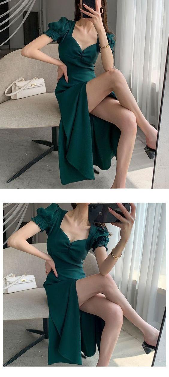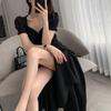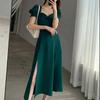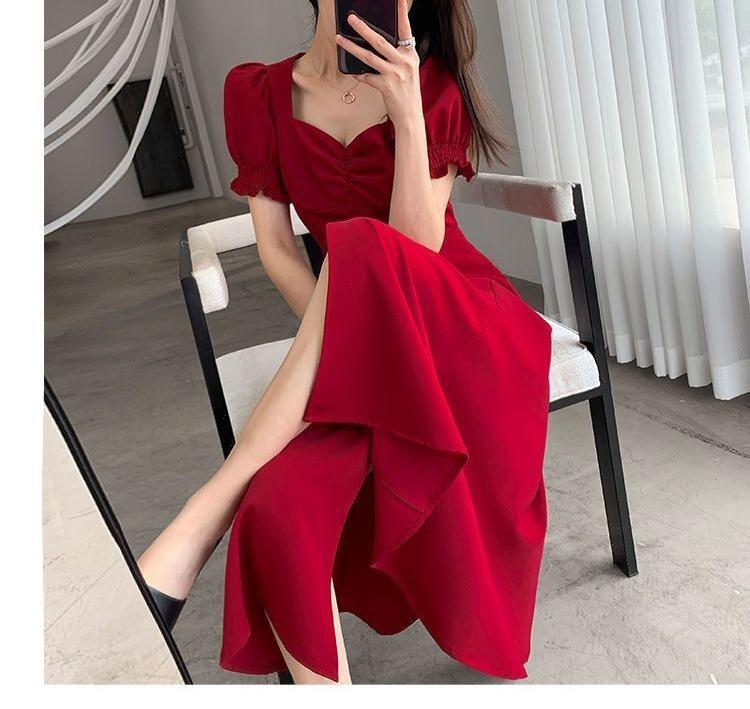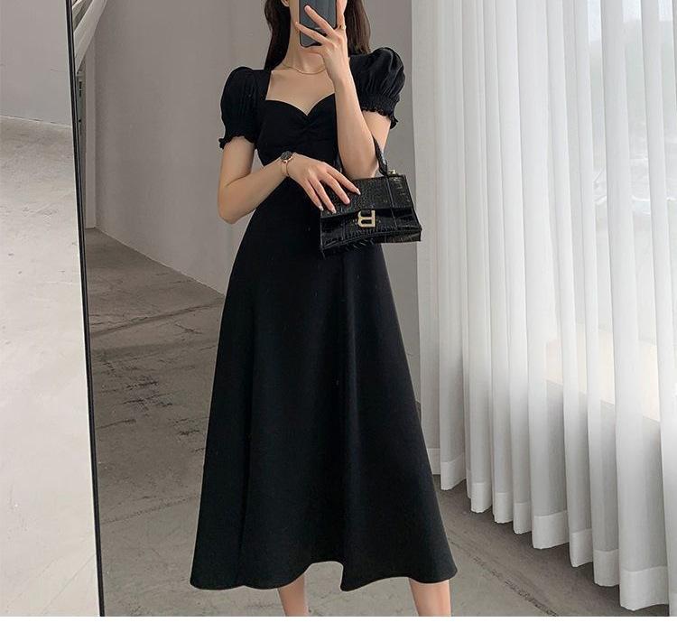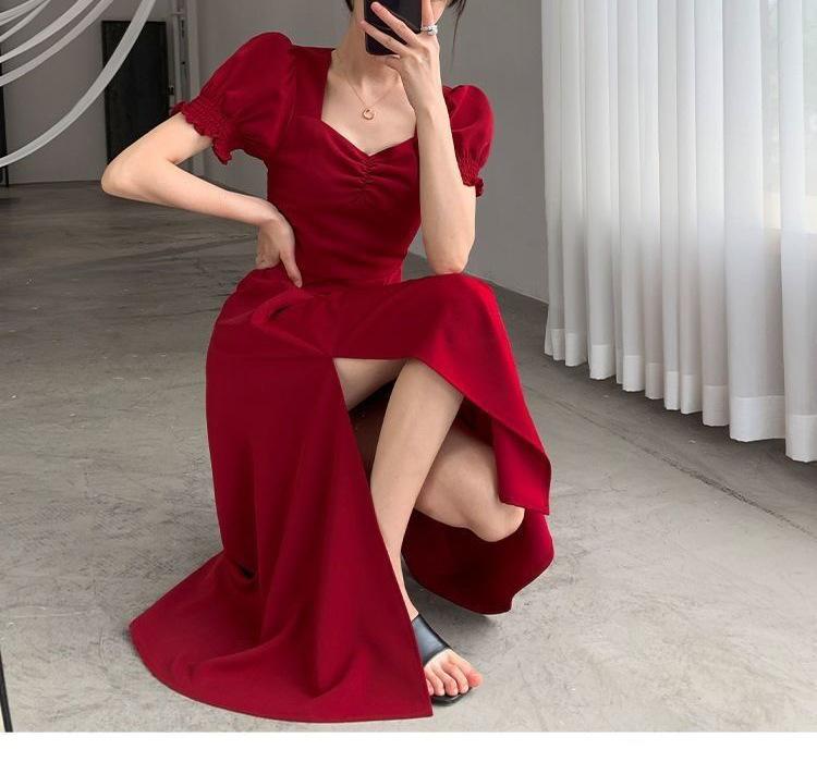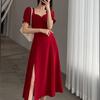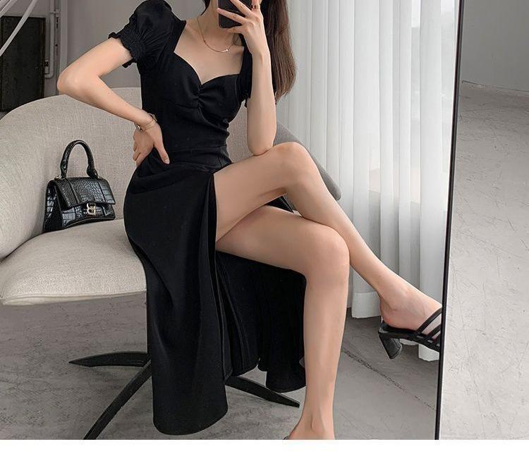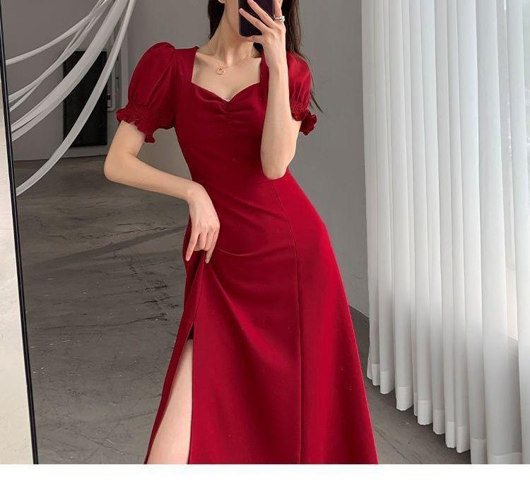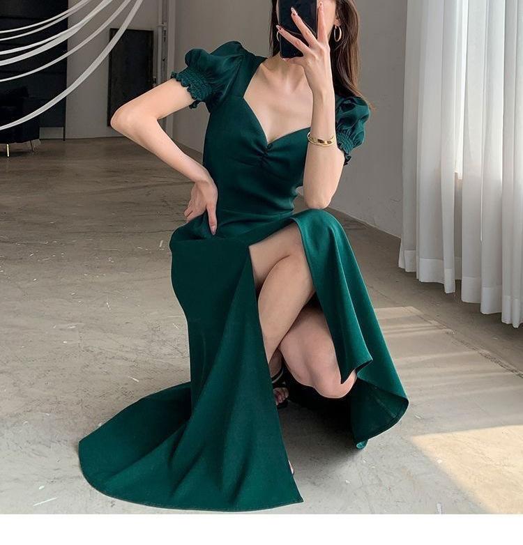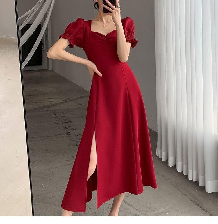 Vestido Largo Estilo Hepburn Elegante Cuello Cuadrado Retro Manga Farol Francesa Línea A Verano Nuevo vestido Vestido Largo con Abertura