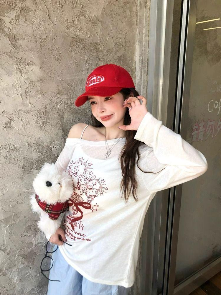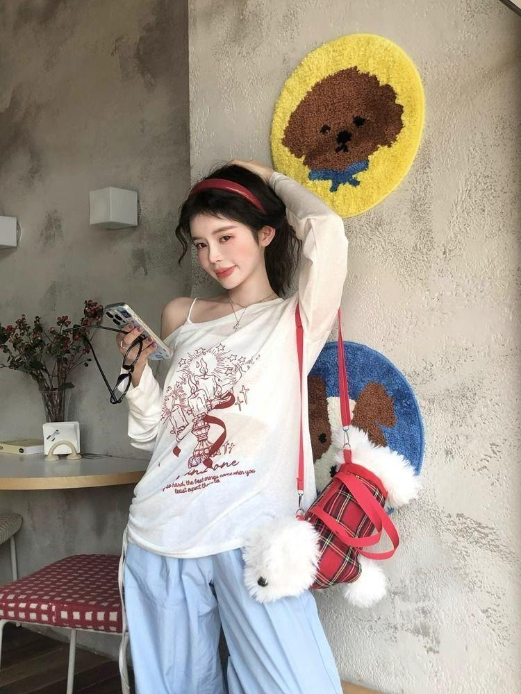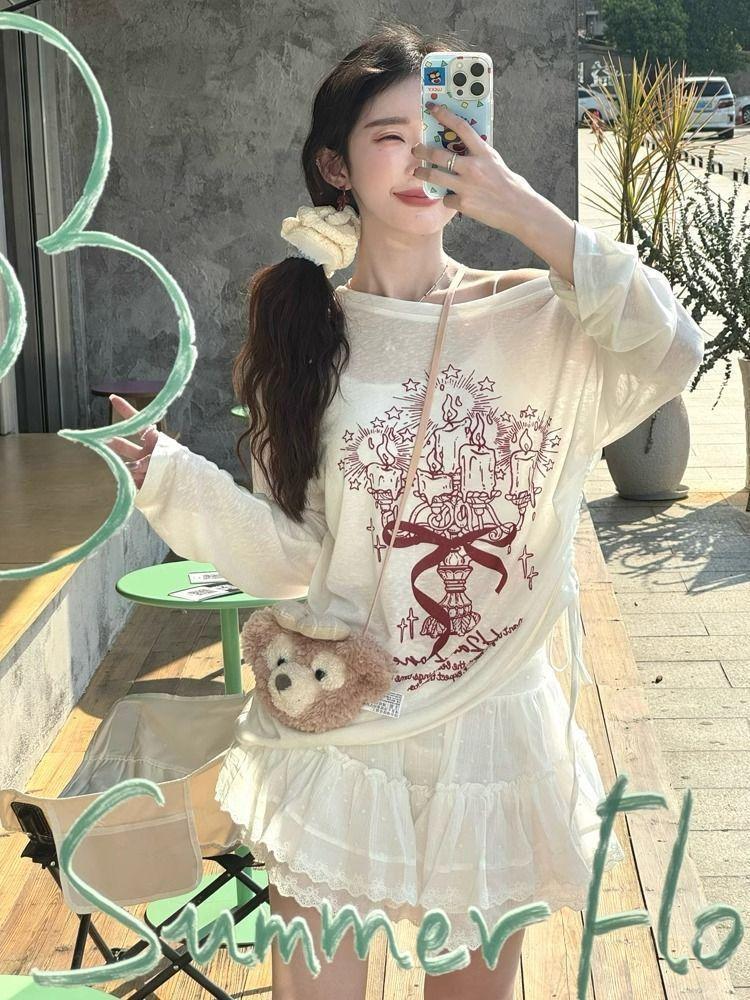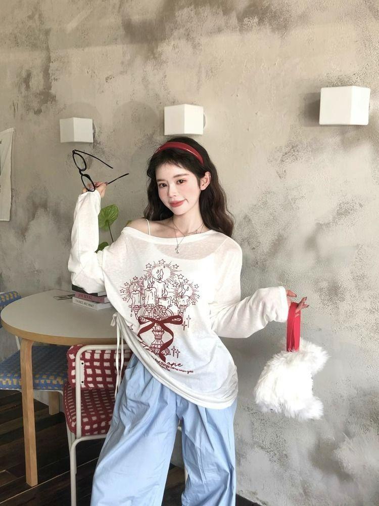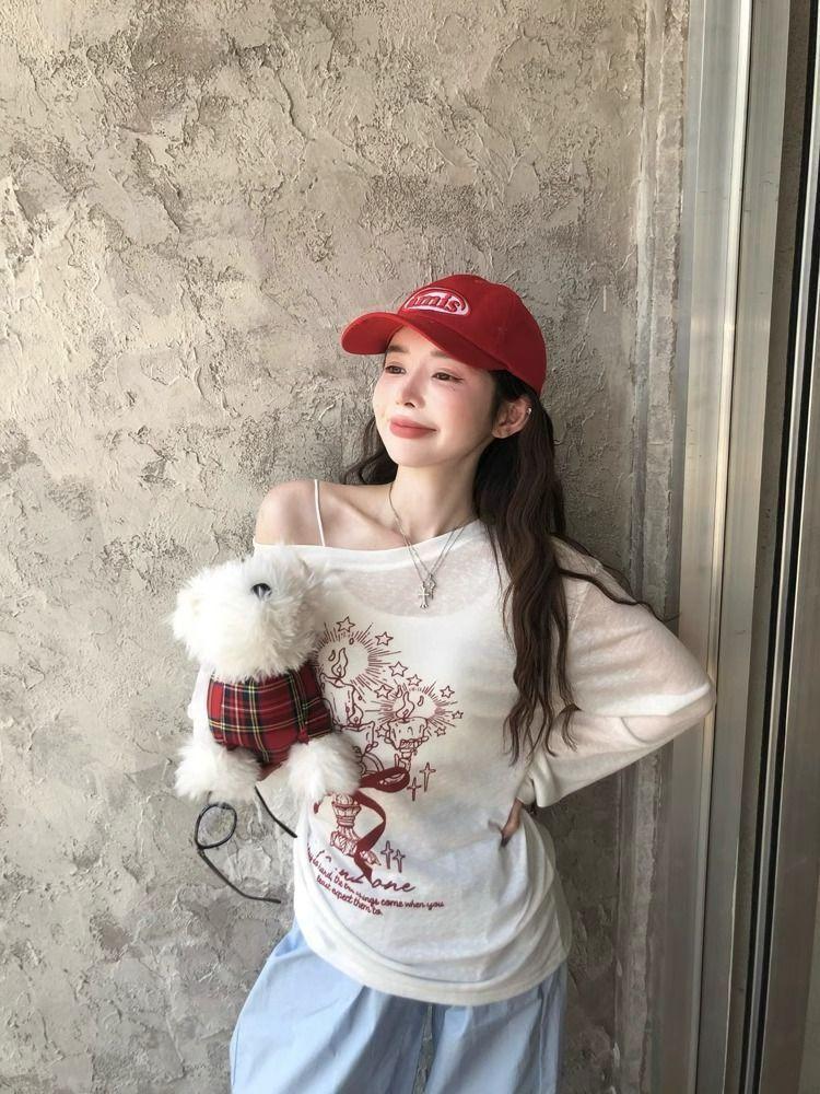 Camiseta de Manga Larga Simple de Estilo Preppy Coreano a la Moda Verano Nueva Versátil Camisa de Protección Solar Diseño Estampado Top para Mujer