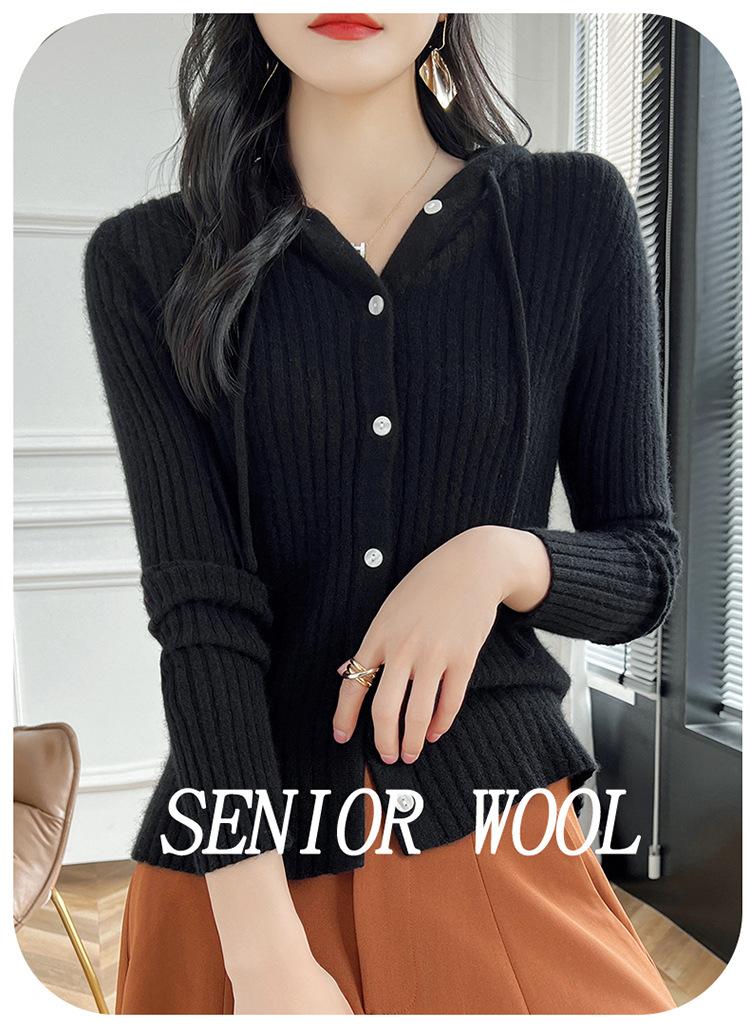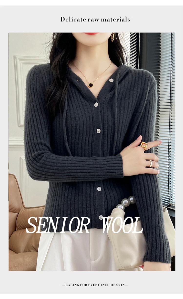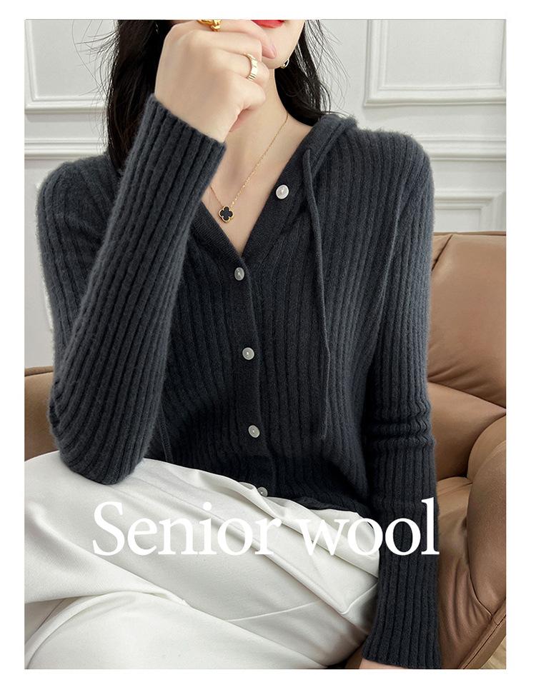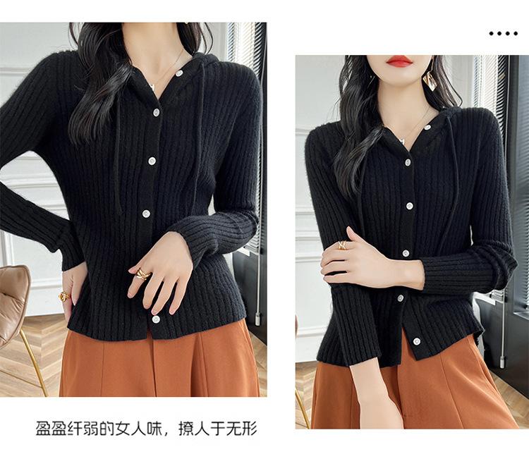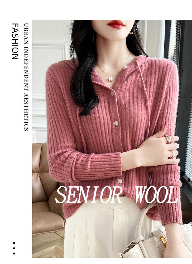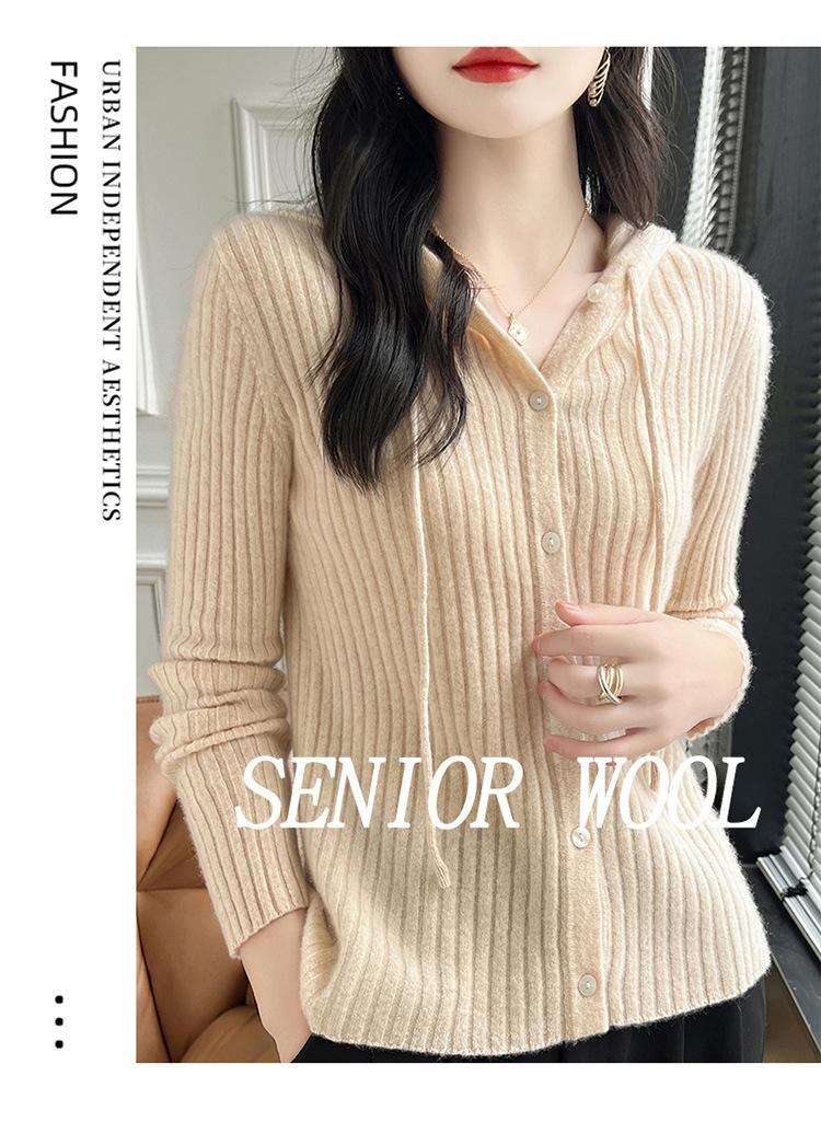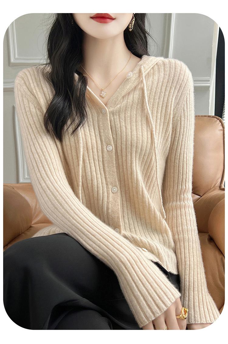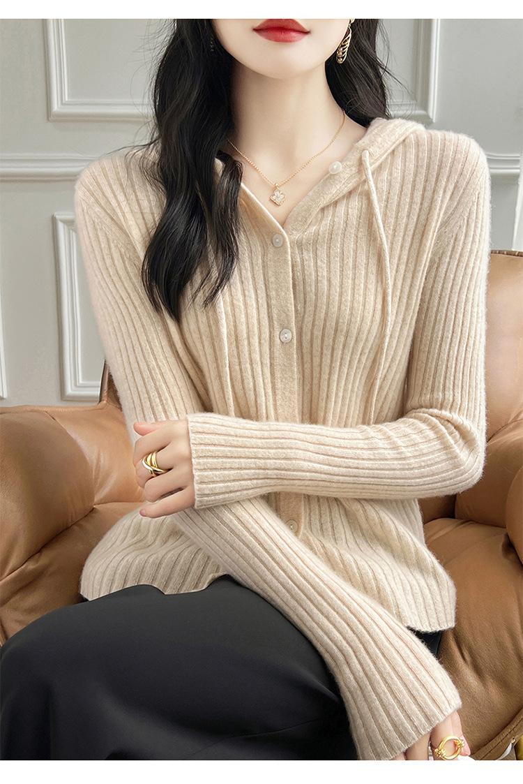 Cárdigan de Punto con Capucha de Lana Pura Nuevo Otoño e Invierno 2024 Ajustado Adelgazante Color Sólido Abrigo Suéter para Mujer