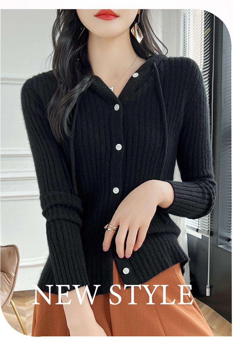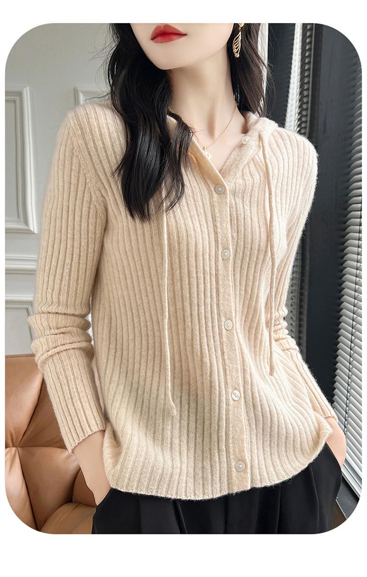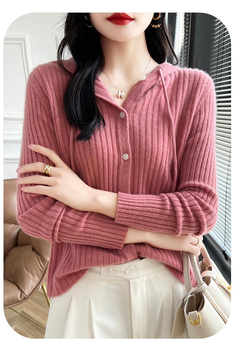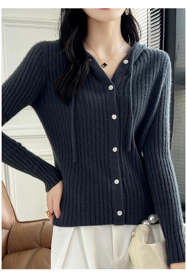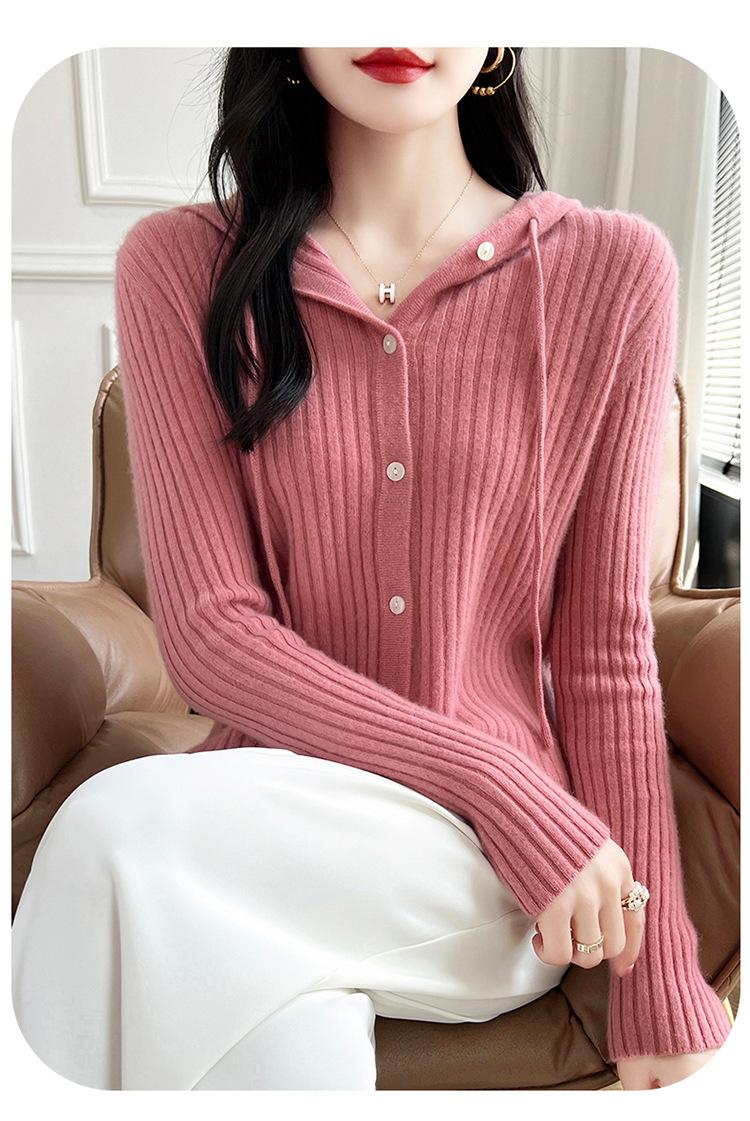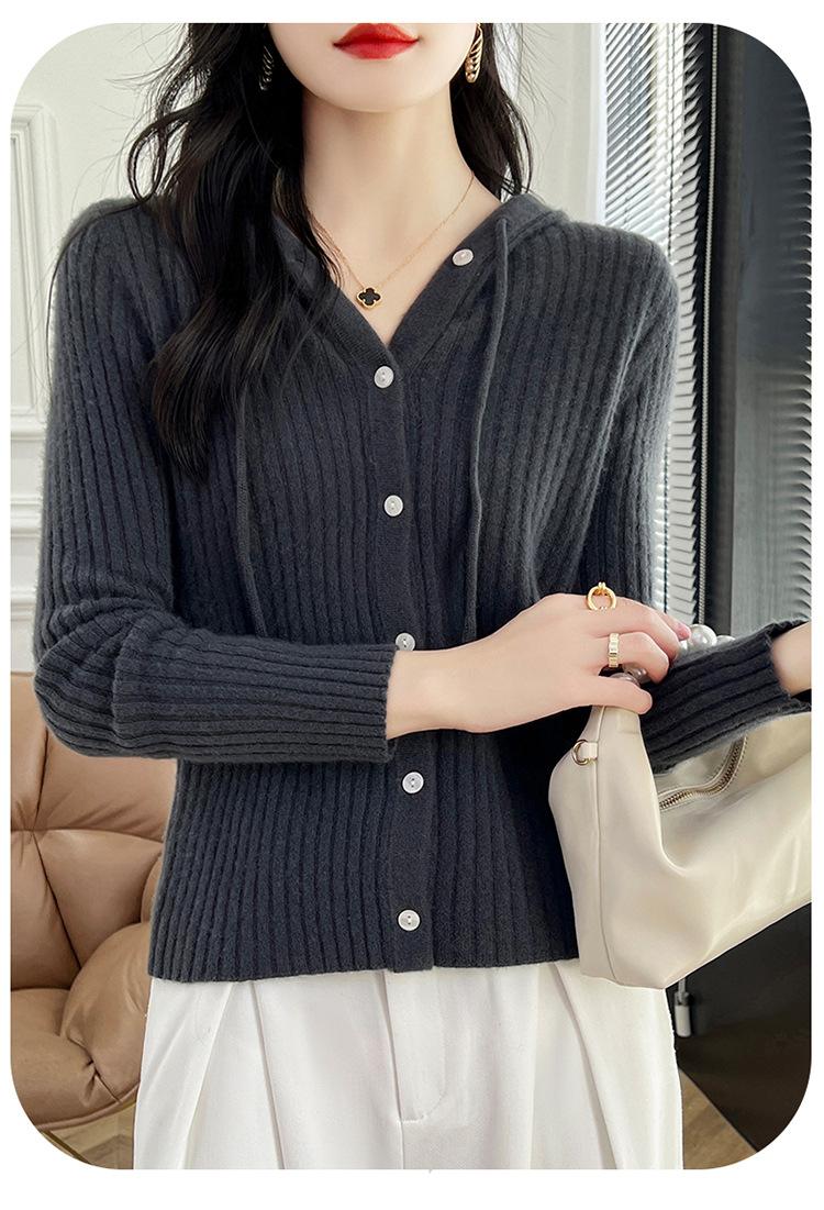 Cárdigan de Punto con Capucha de Lana Pura Nuevo Otoño e Invierno 2024 Ajustado Adelgazante Color Sólido Abrigo Suéter para Mujer