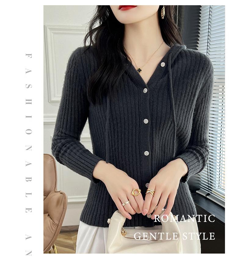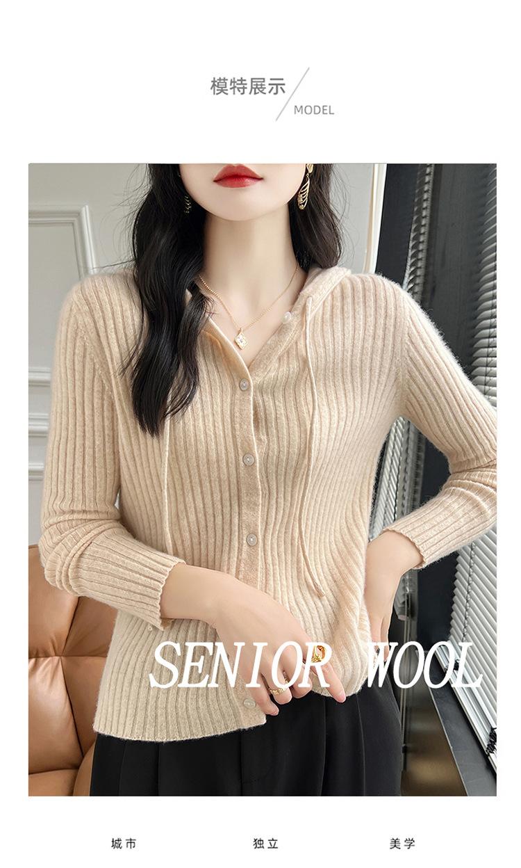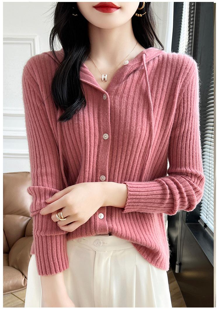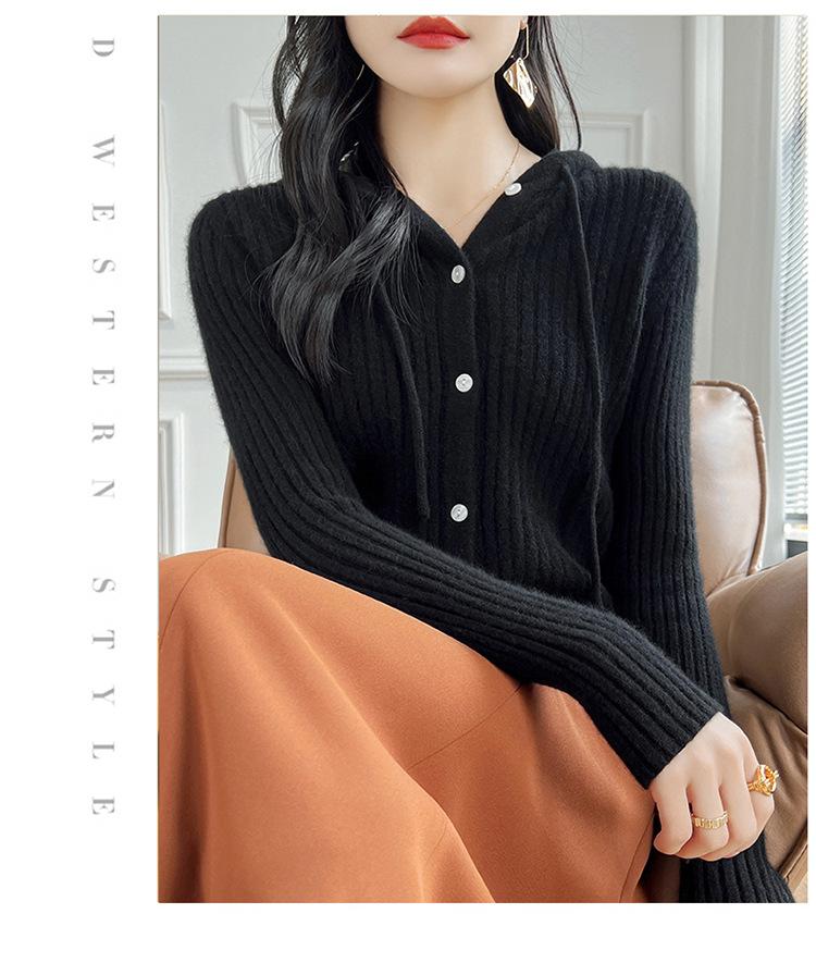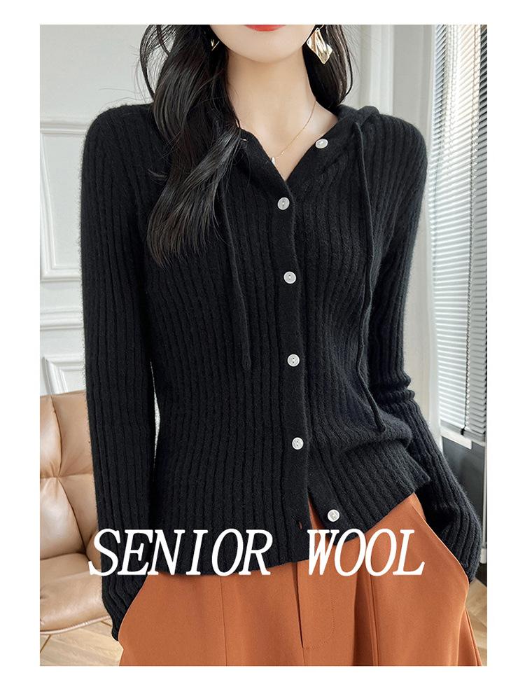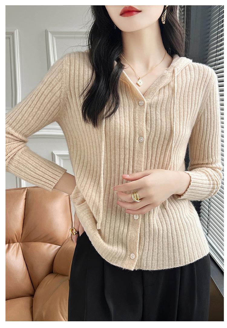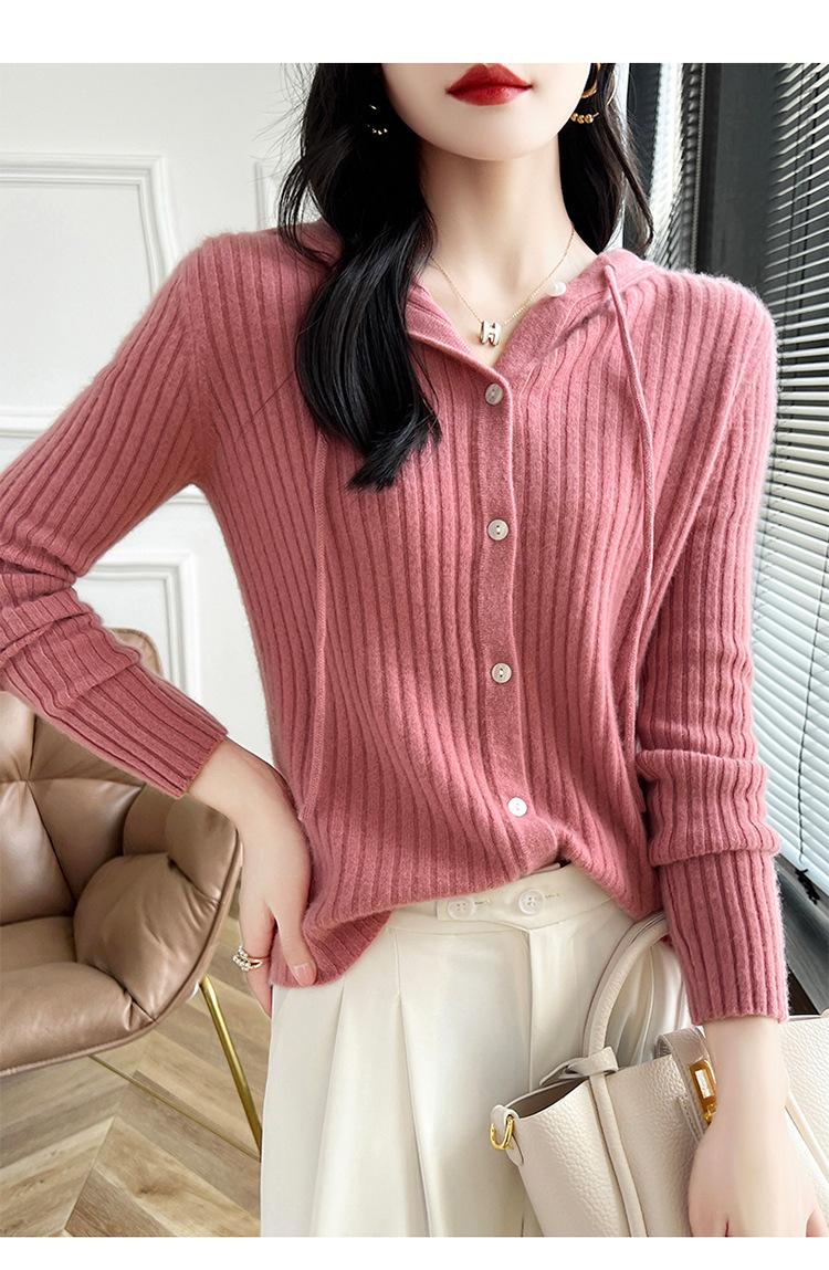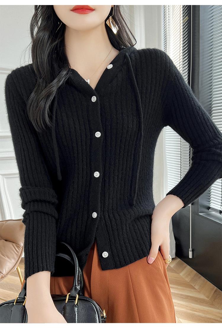 Cárdigan de Punto con Capucha de Lana Pura Nuevo Otoño e Invierno 2024 Ajustado Adelgazante Color Sólido Abrigo Suéter para Mujer