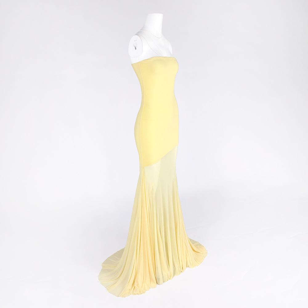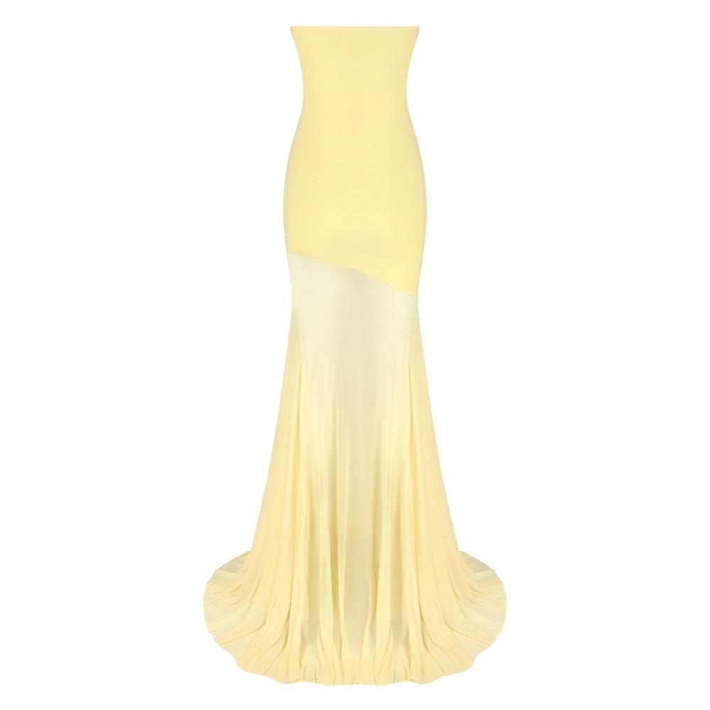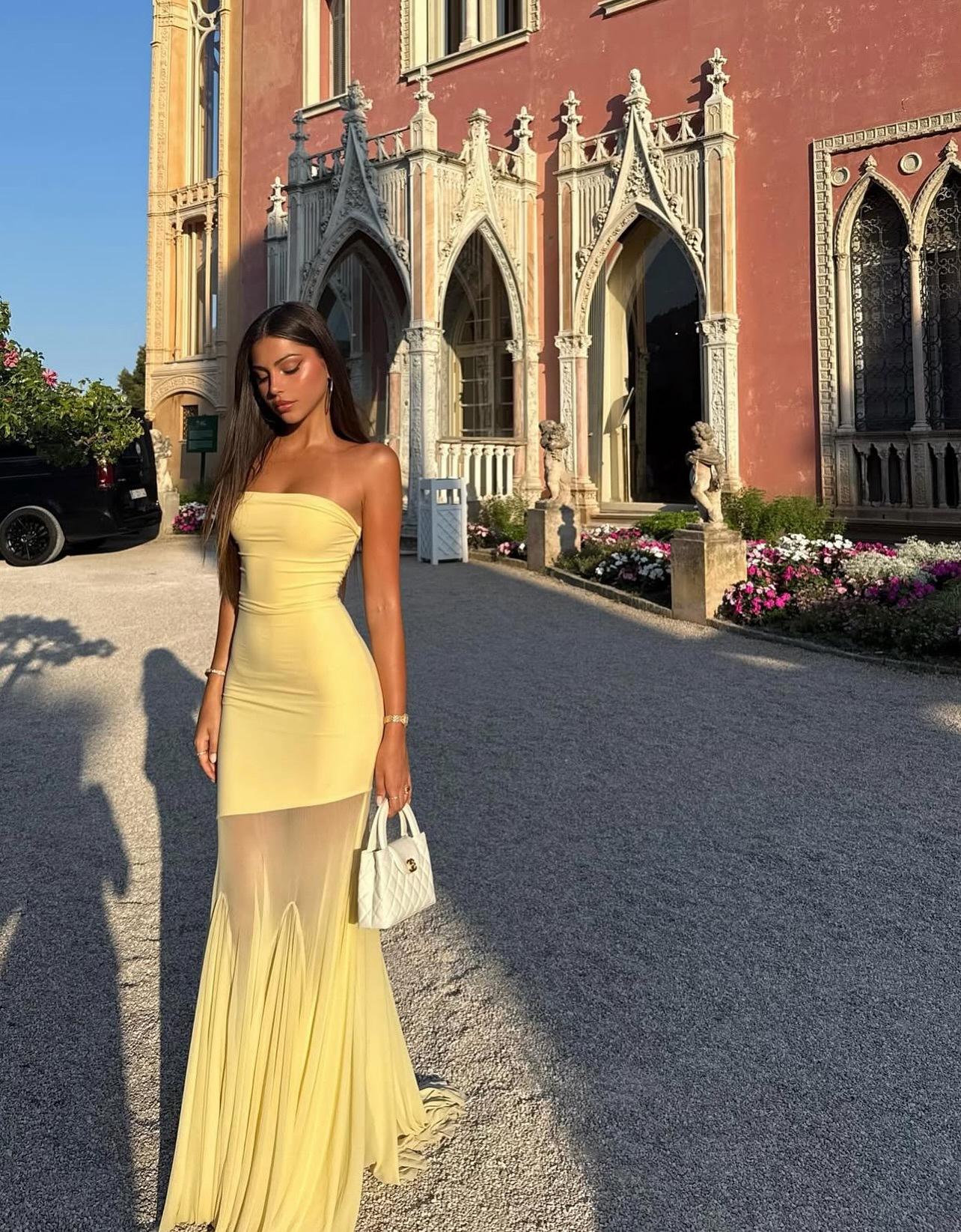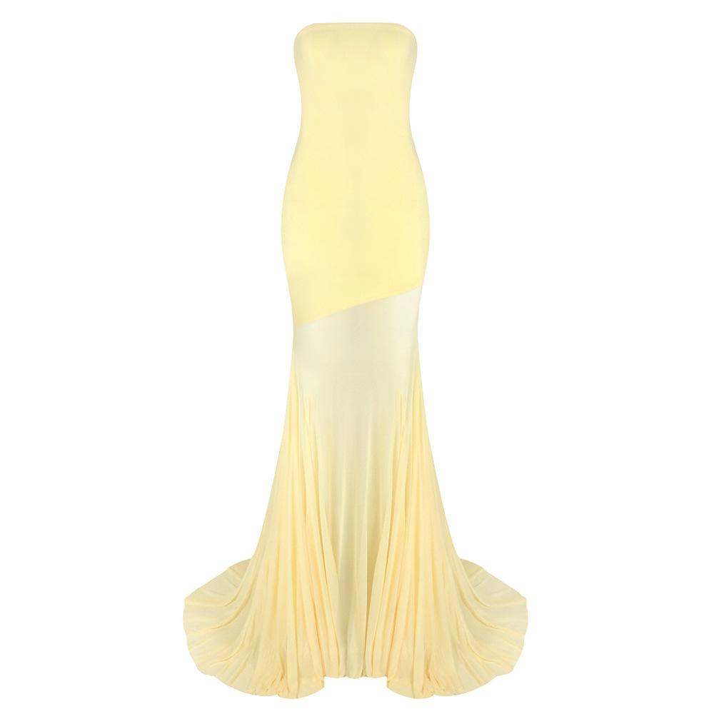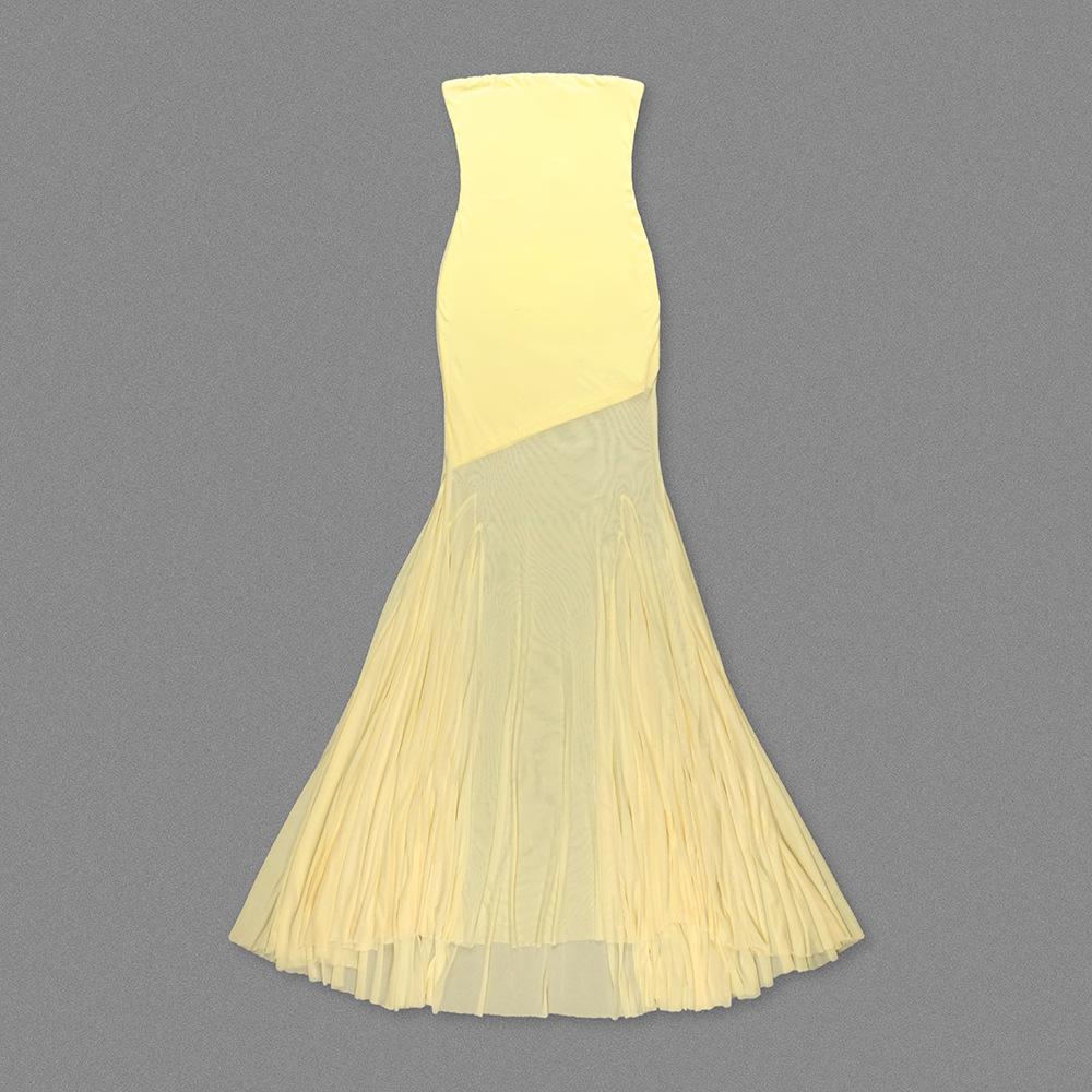 Vestido strapless de retazos de malla de seda de hielo amarillo claro de nuevo estilo suave europeo y americano para mujer, falda grande, ajuste ceñido, vestido con drapeado en la cadera