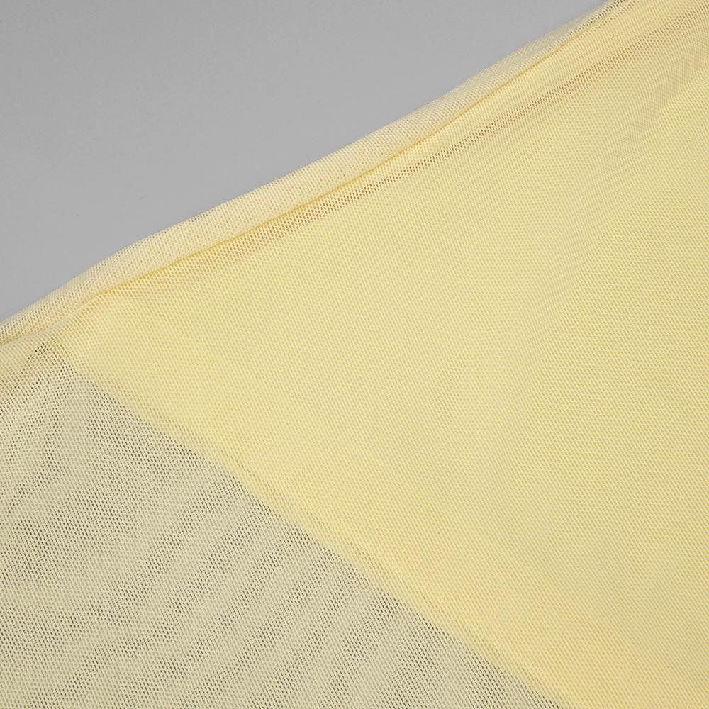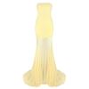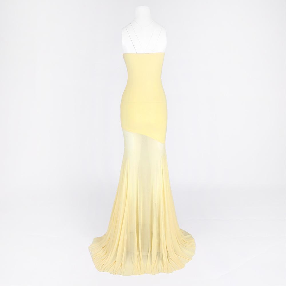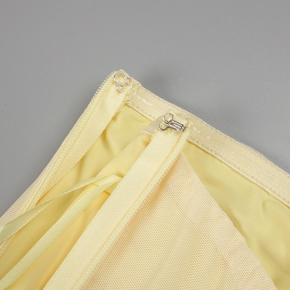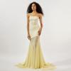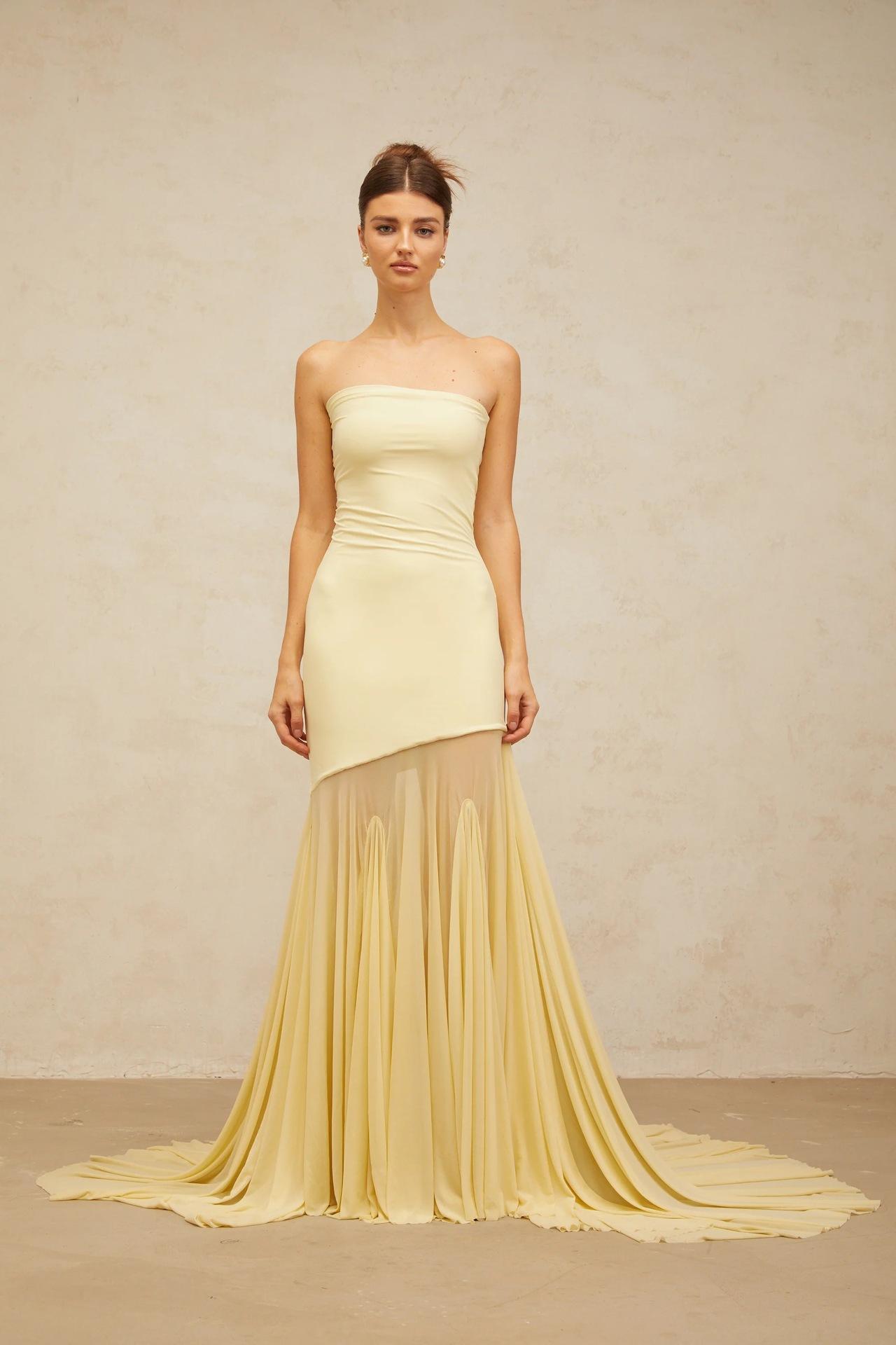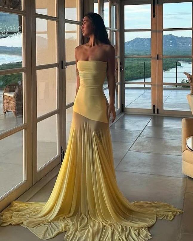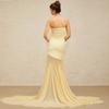 Vestido strapless de retazos de malla de seda de hielo amarillo claro de nuevo estilo suave europeo y americano para mujer, falda grande, ajuste ceñido, vestido con drapeado en la cadera