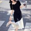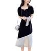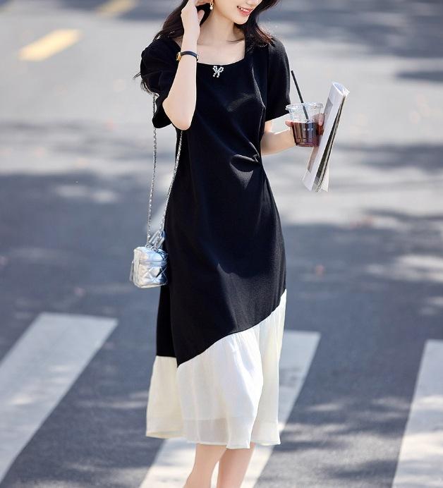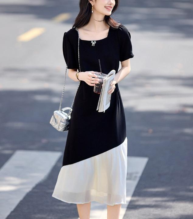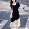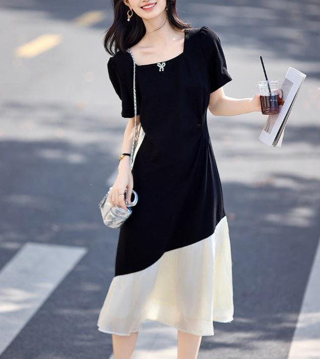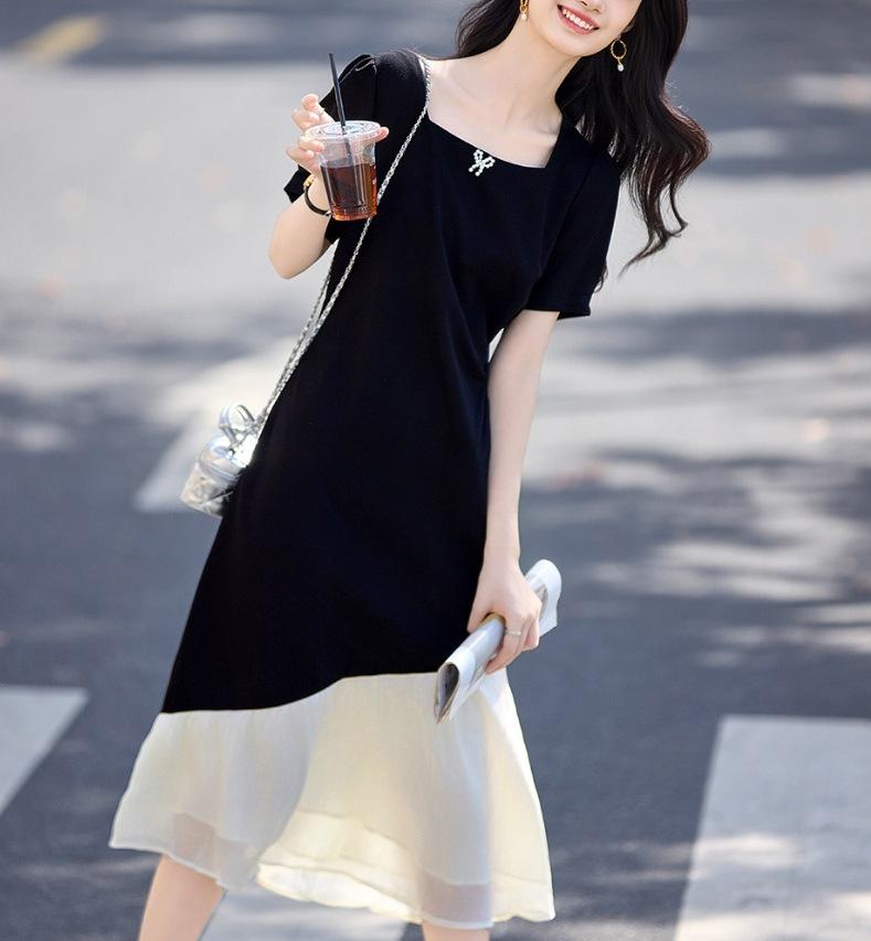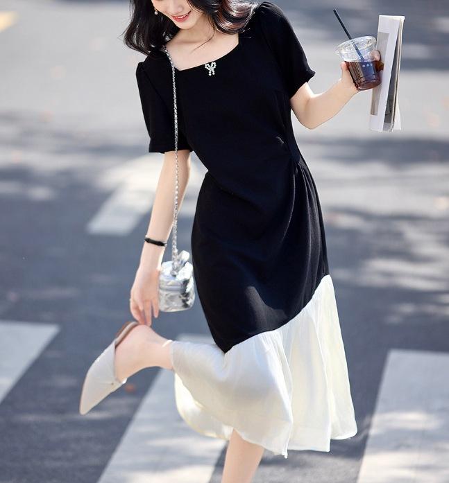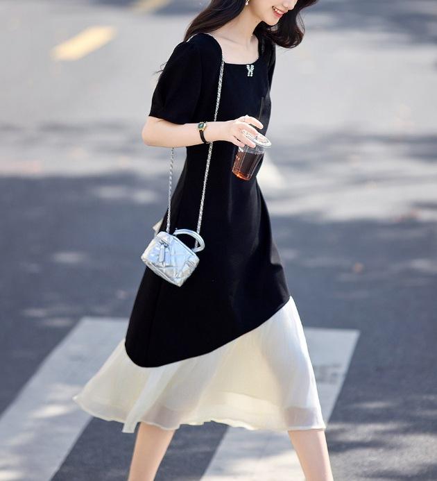 Elegante Vestido Negro Corto de Estilo Francés Inspirado en Hepburn 2025 Verano Nuevo Temperamento Bloque de Color Vestido Fresco Adornado con Perlas