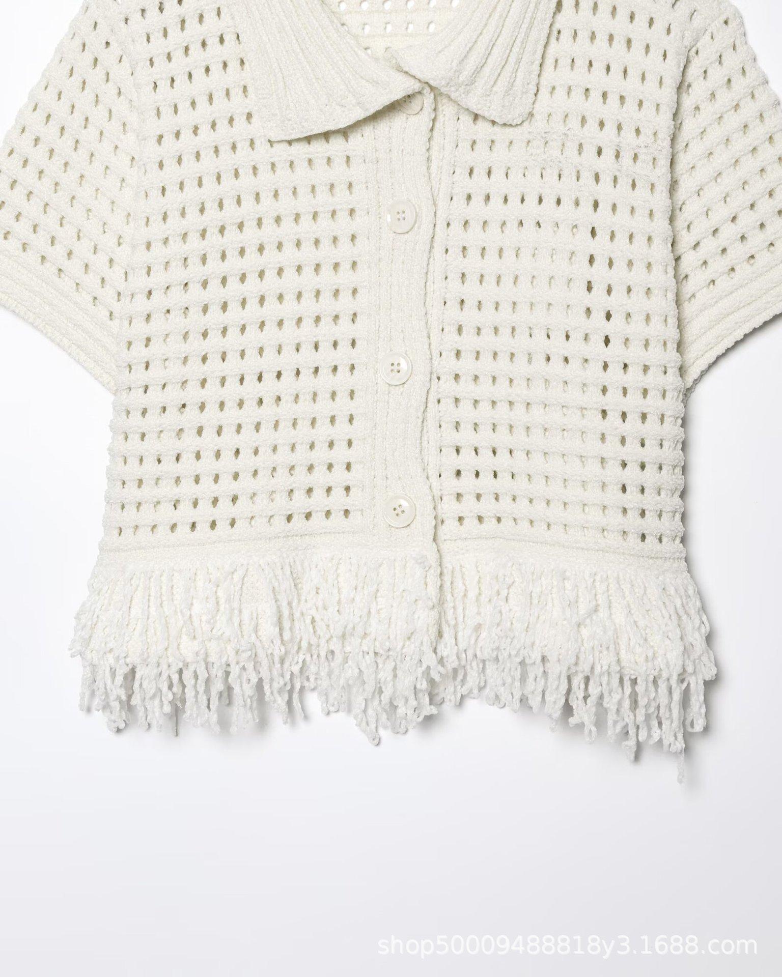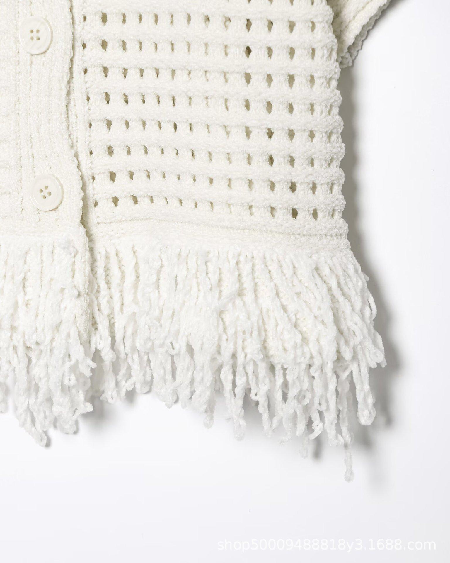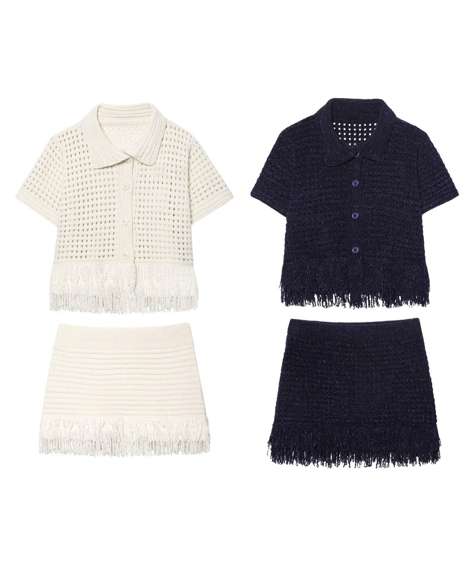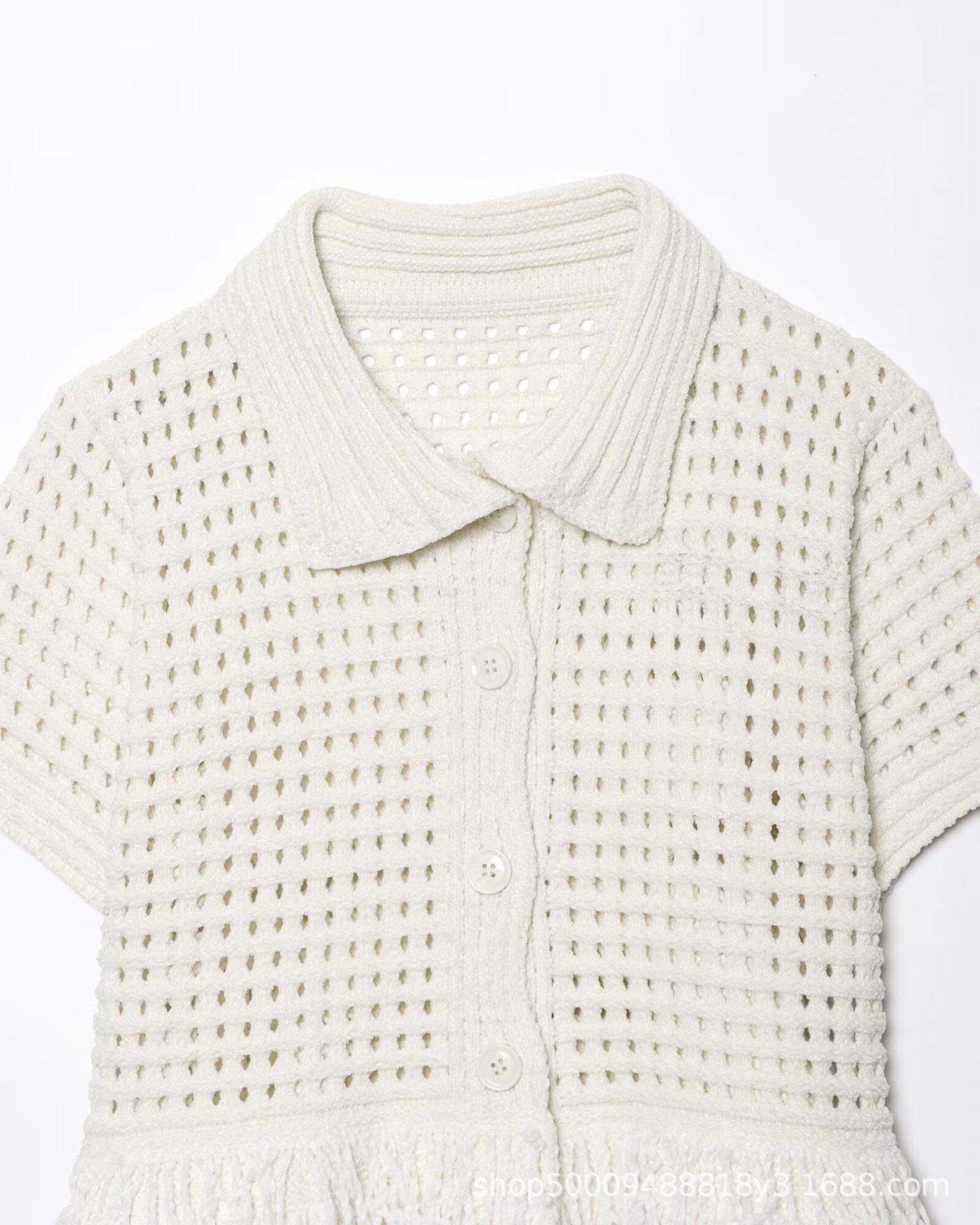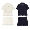 Comercio Exterior Mujeres Primavera y Verano Estilo Europeo y Americano Chaqueta Tejida de Solapa de Manga Corta Decorada con Flecos + Traje de Falda Tejida