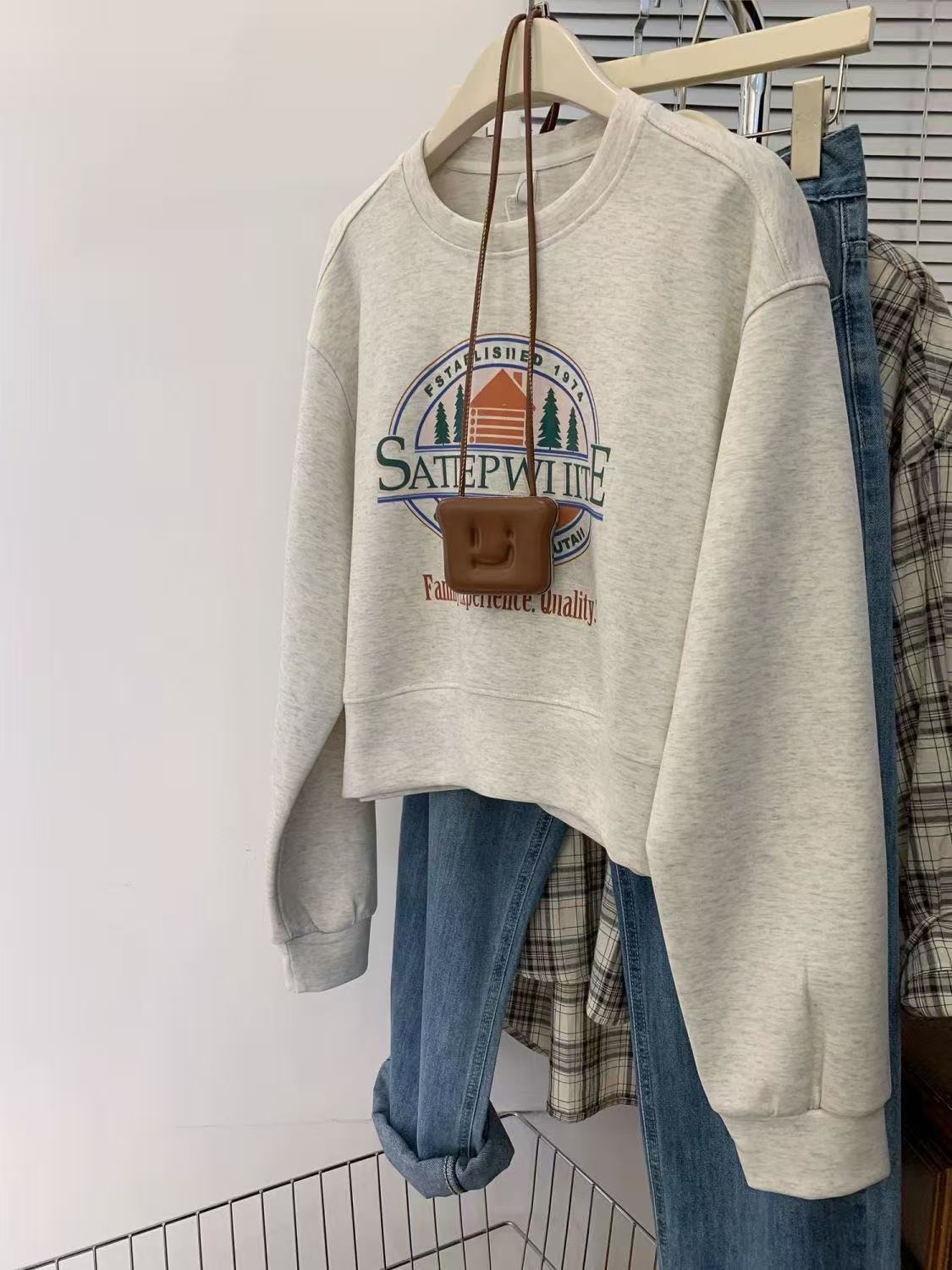 Sudadera corta gruesa estilo europeo de cuello redondo con forro polar gris para mujer, temporada primavera otoño invierno, petite, nuevo estilo caliente