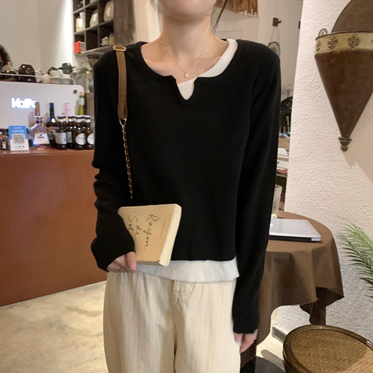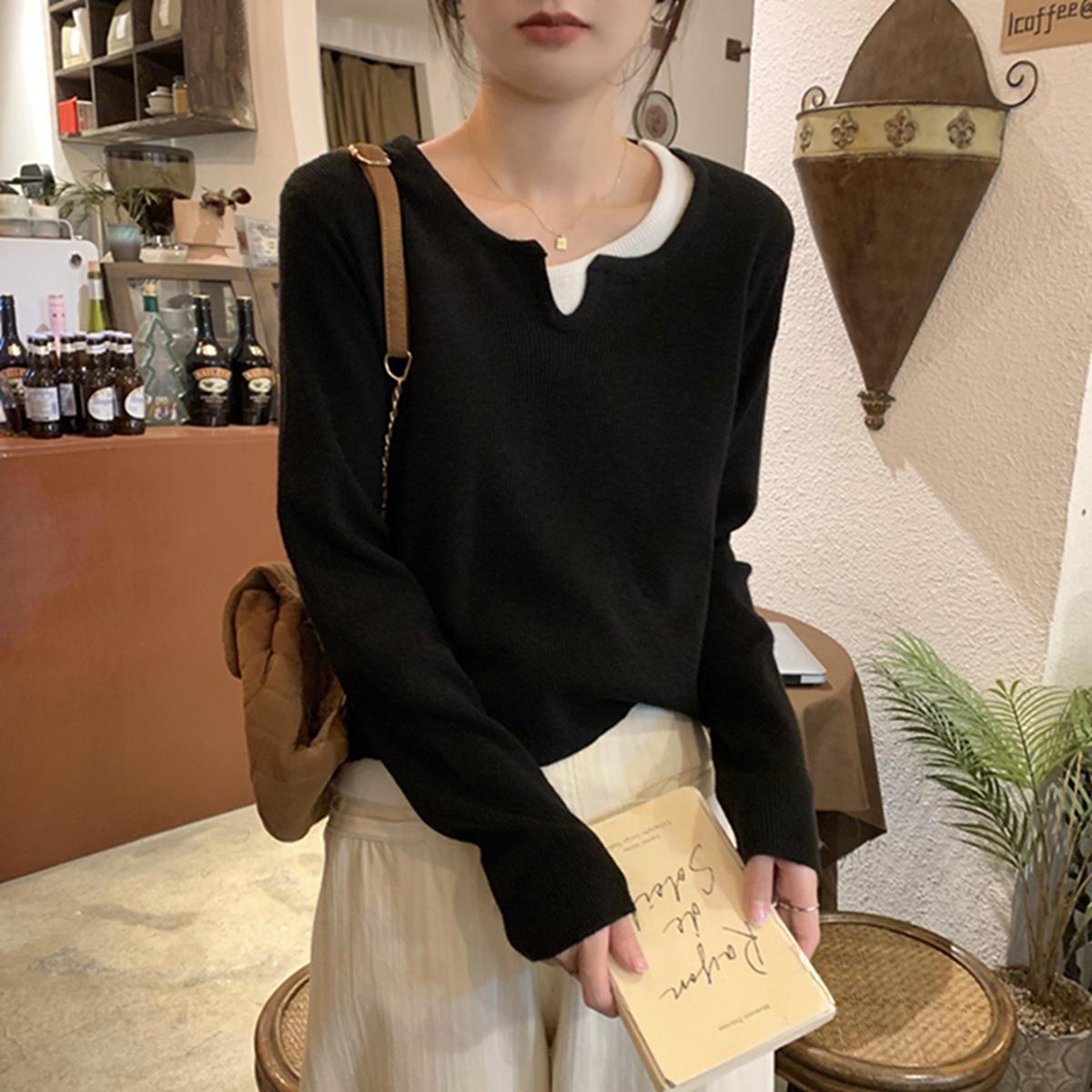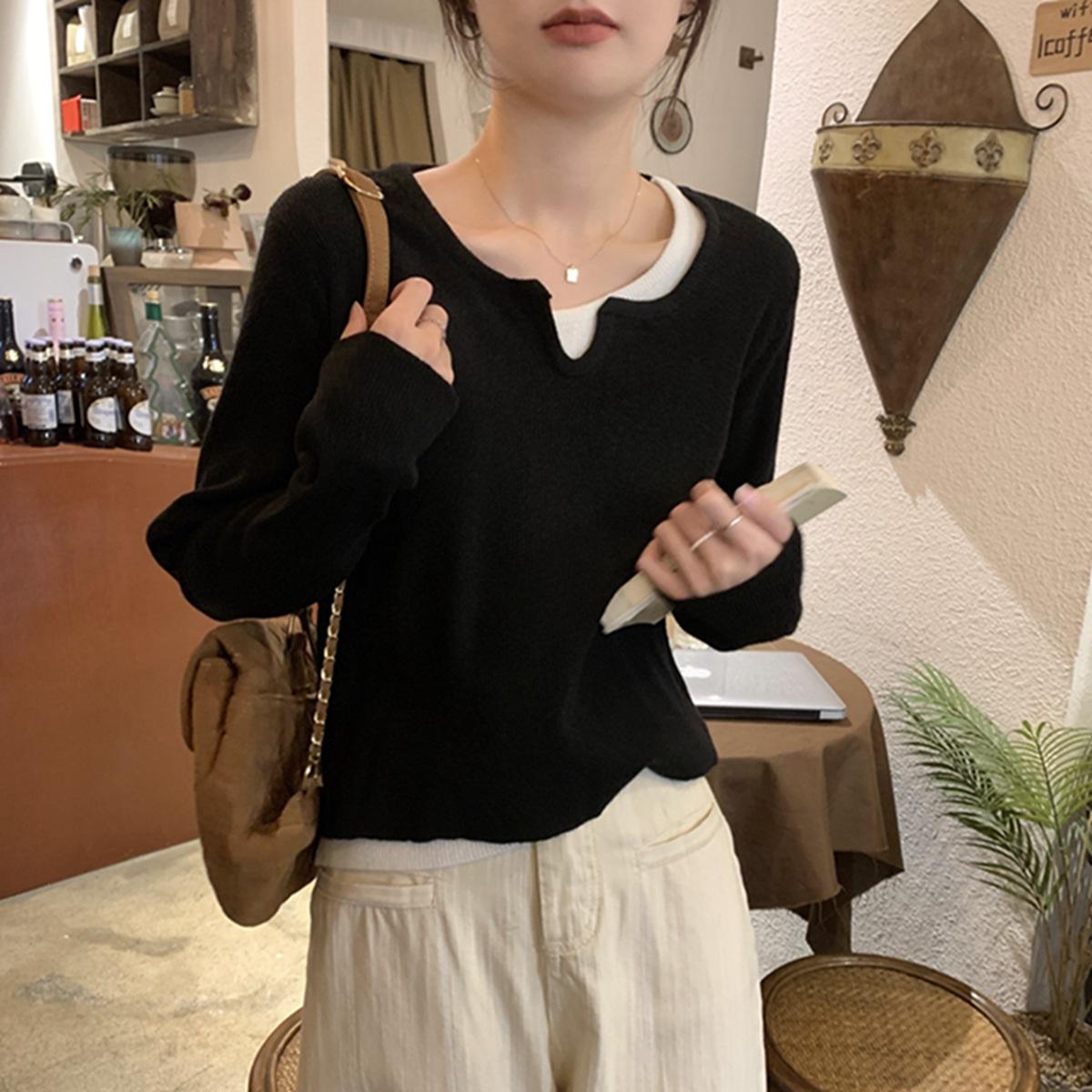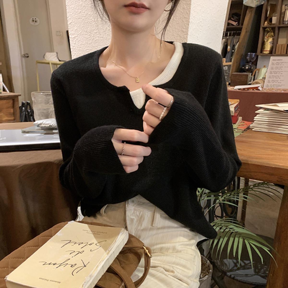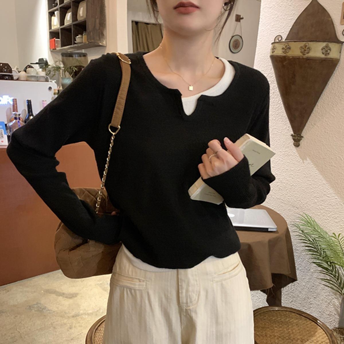 Camiseta Básica de Punto con Costuras de Contraste de Estilo Coreano de Dos Piezas Falsas para Mujer Otoño e Invierno Suéter de Manga Larga Casual Suave y Ceroso Top Styline