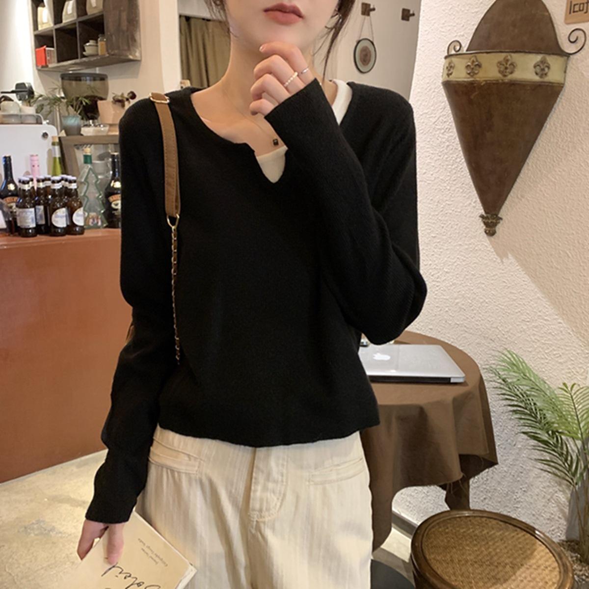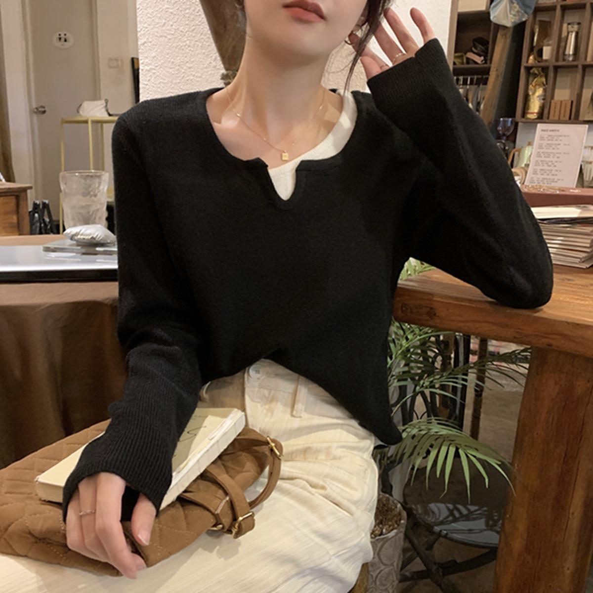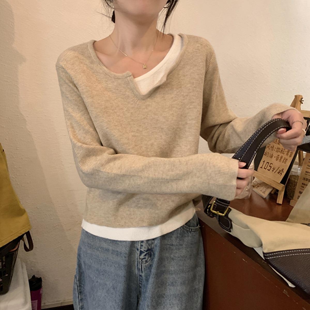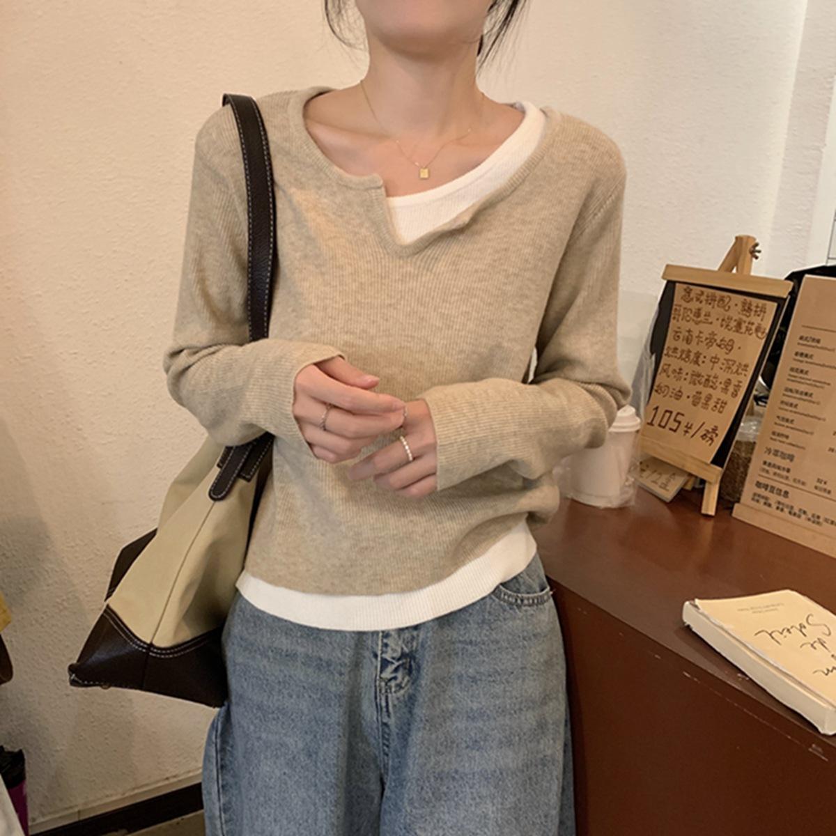 Camiseta Básica de Punto con Costuras de Contraste de Estilo Coreano de Dos Piezas Falsas para Mujer Otoño e Invierno Suéter de Manga Larga Casual Suave y Ceroso Top Styline