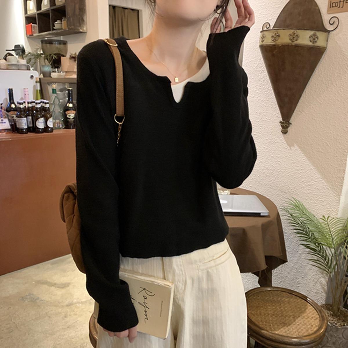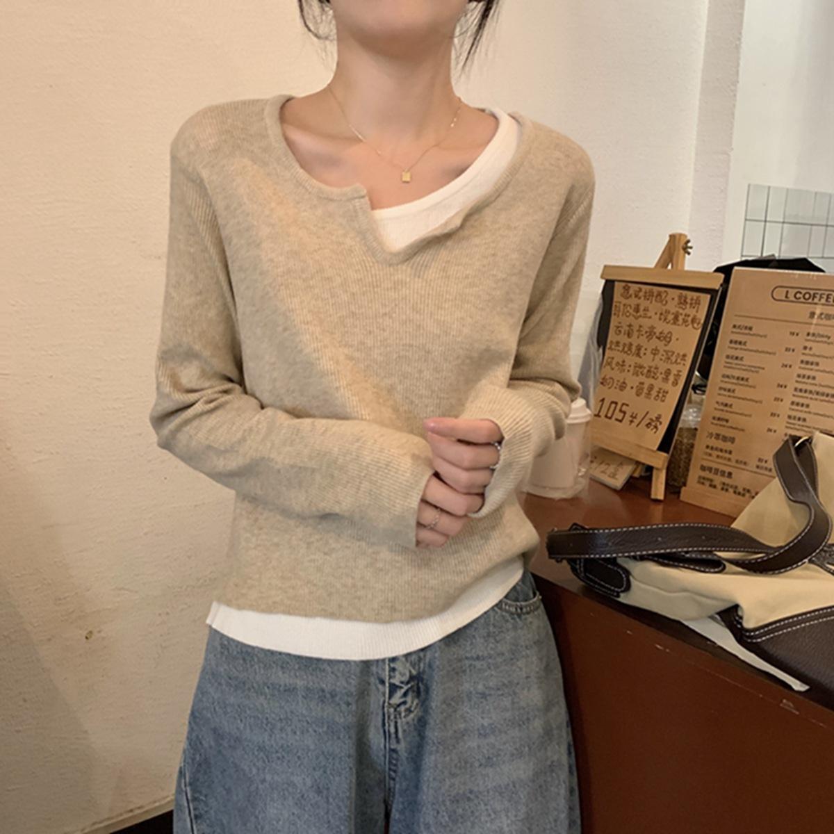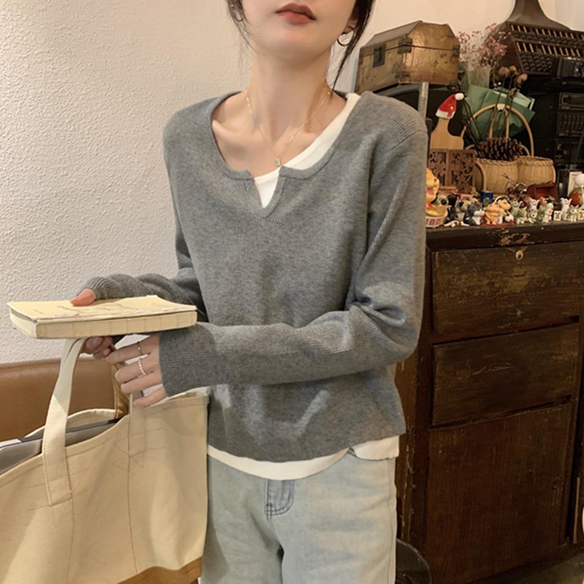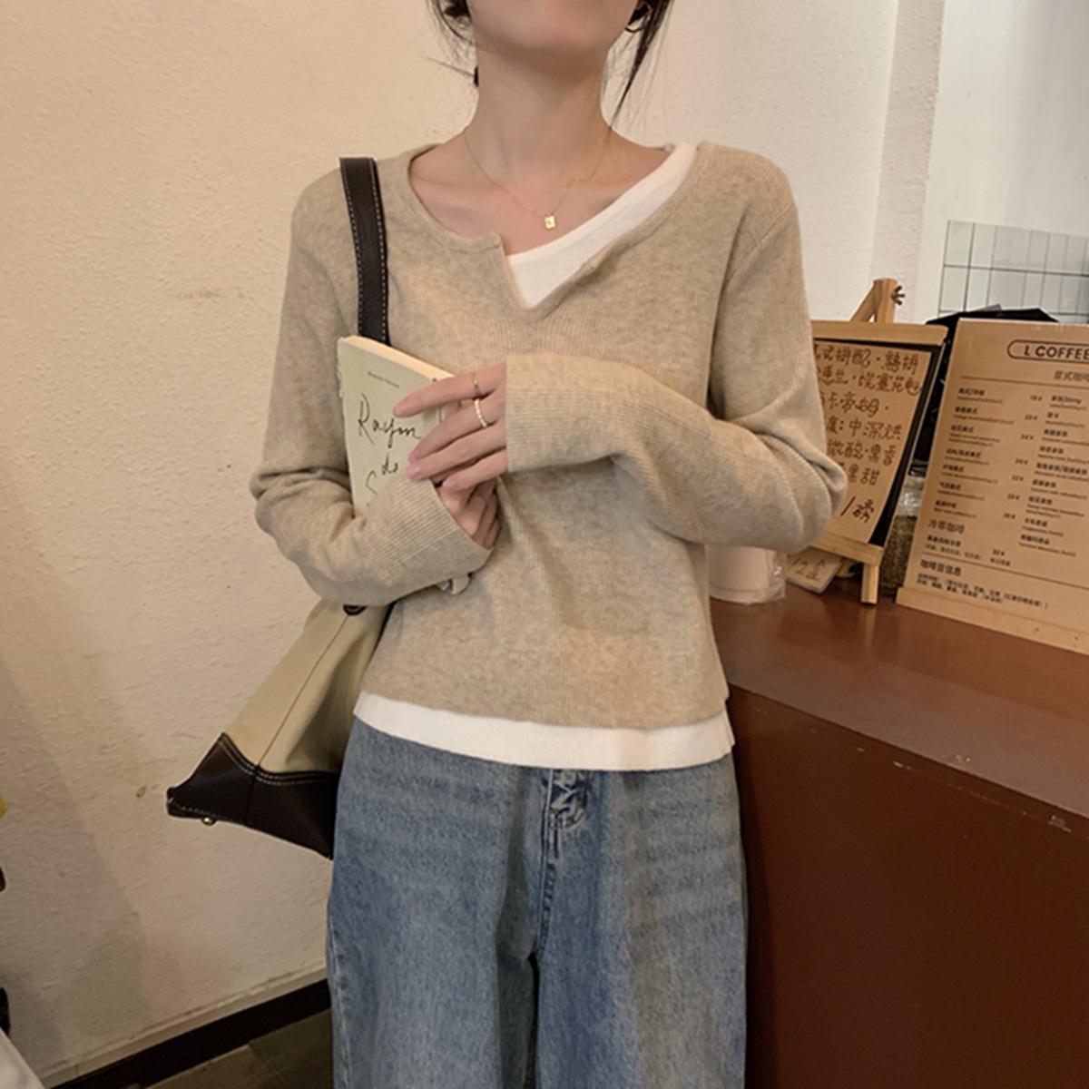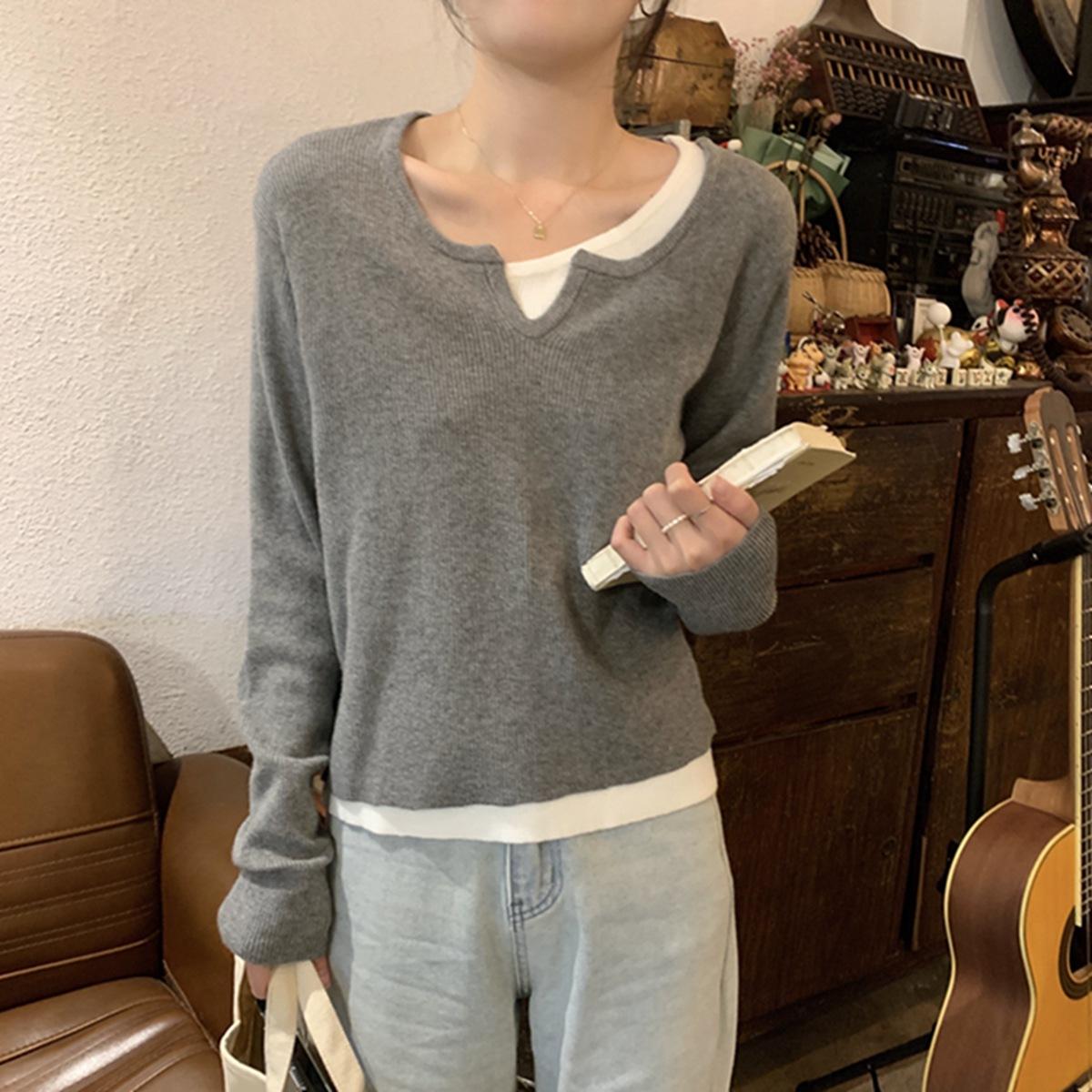 Camiseta Básica de Punto con Costuras de Contraste de Estilo Coreano de Dos Piezas Falsas para Mujer Otoño e Invierno Suéter de Manga Larga Casual Suave y Ceroso Top Styline