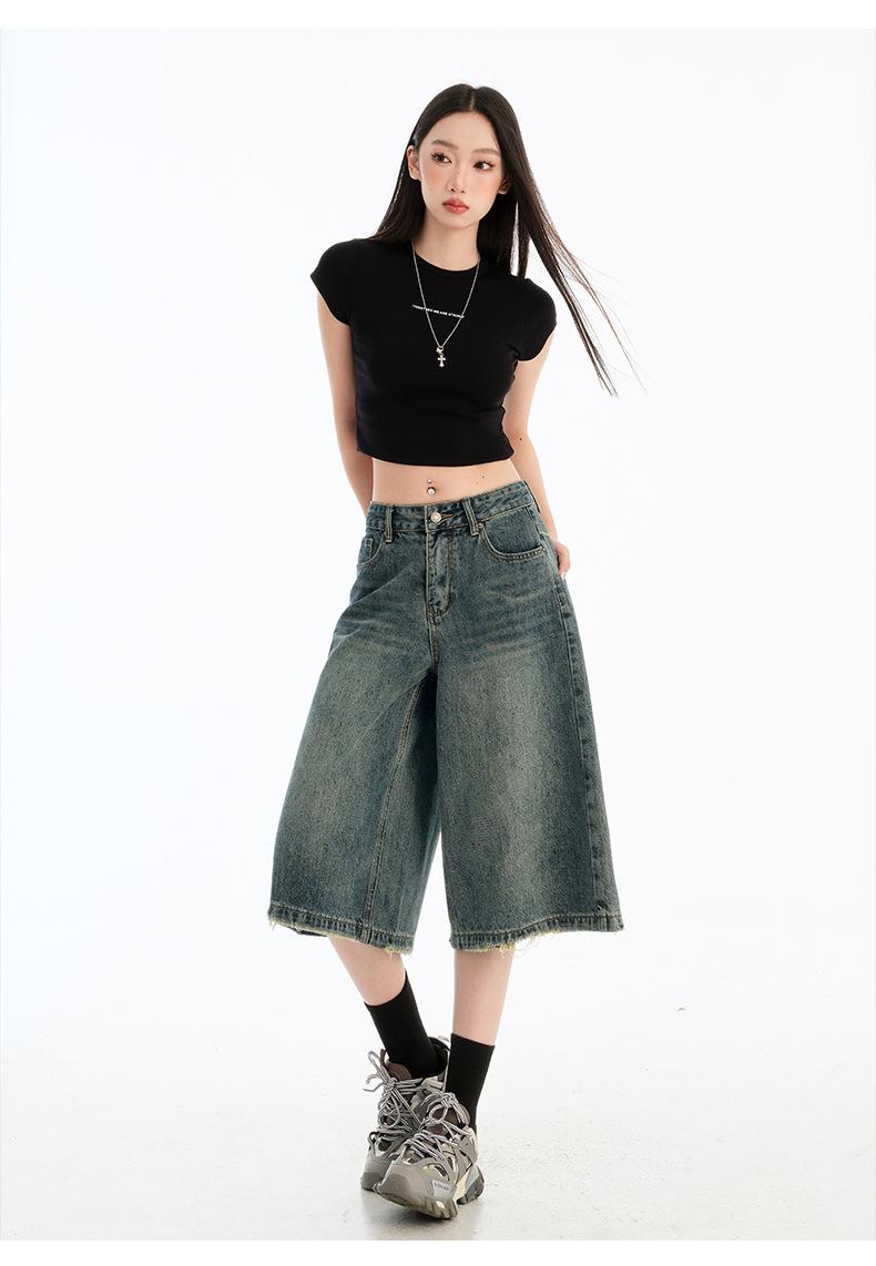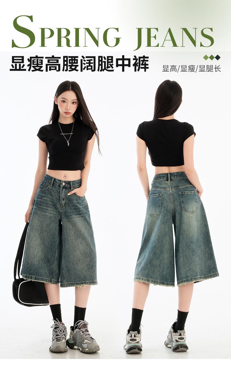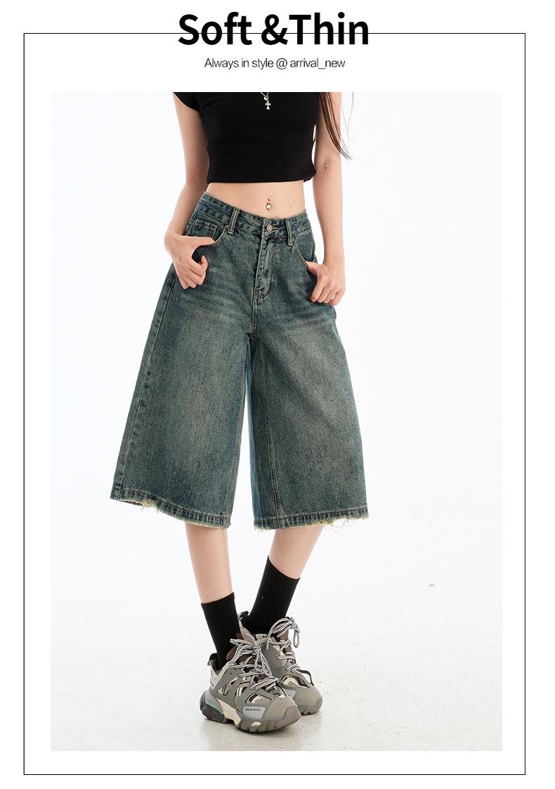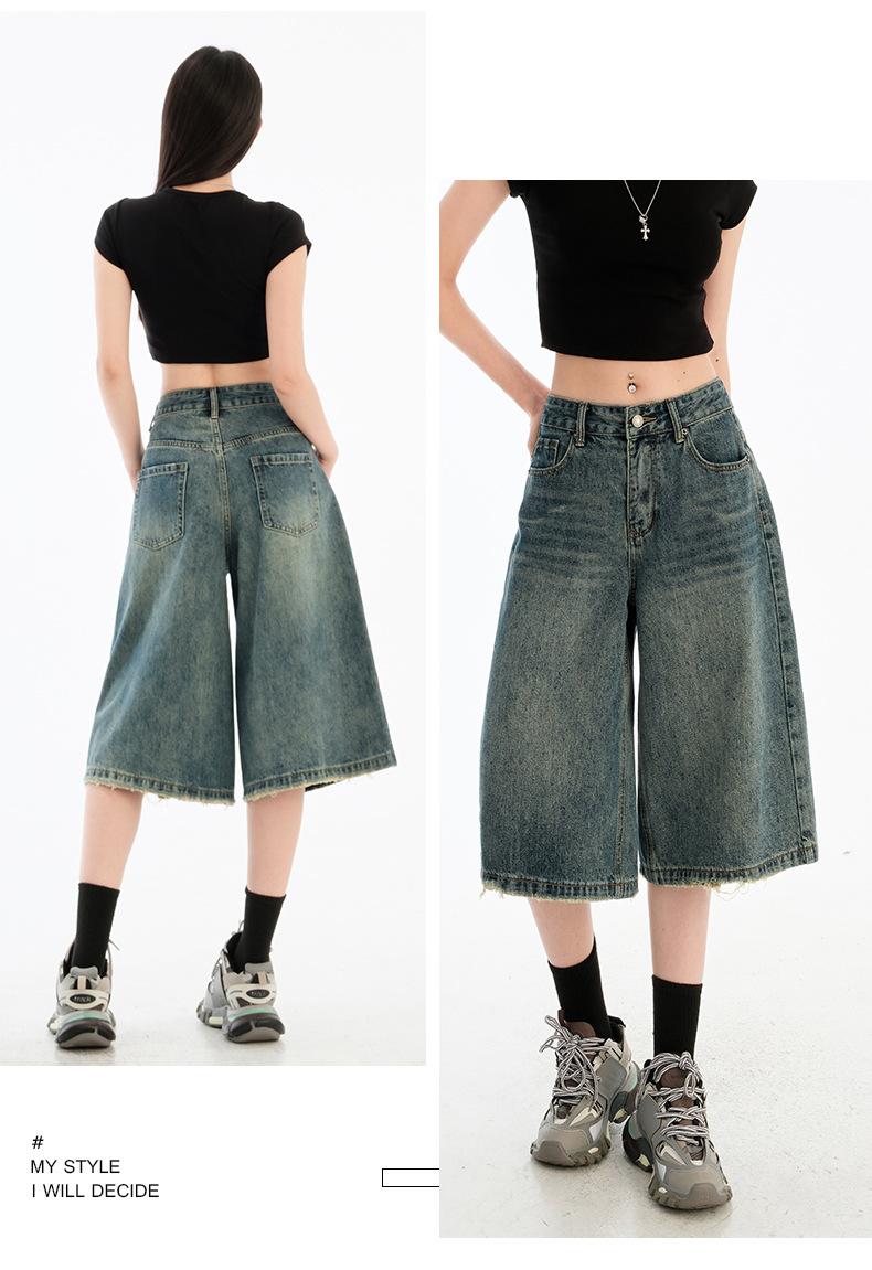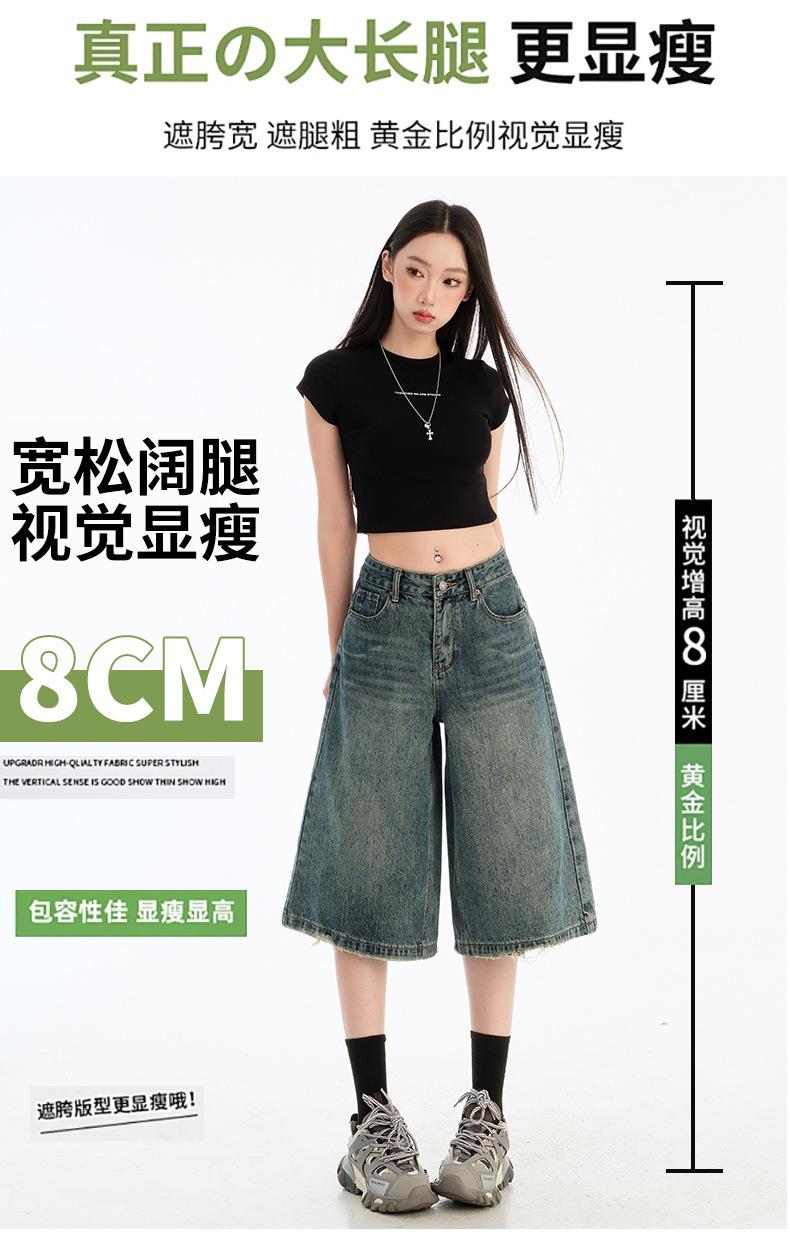 Jeans de Cinco Puntos de Pierna Ancha Primavera y Verano 2025 Nuevo Retro Lavado Drapeado Suelto Recto Mezclilla Pantalones Medios Shorts de Mujer