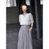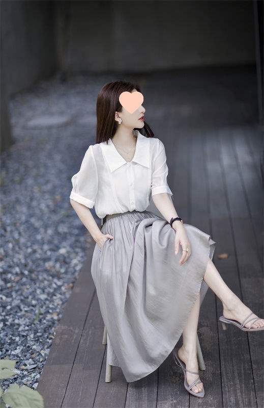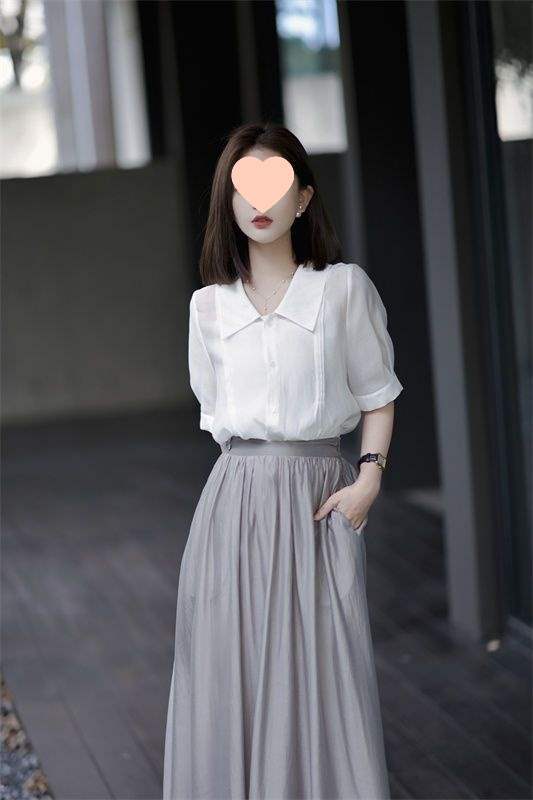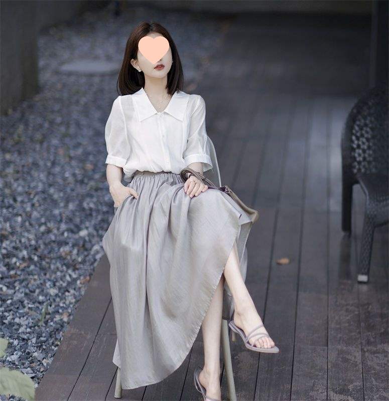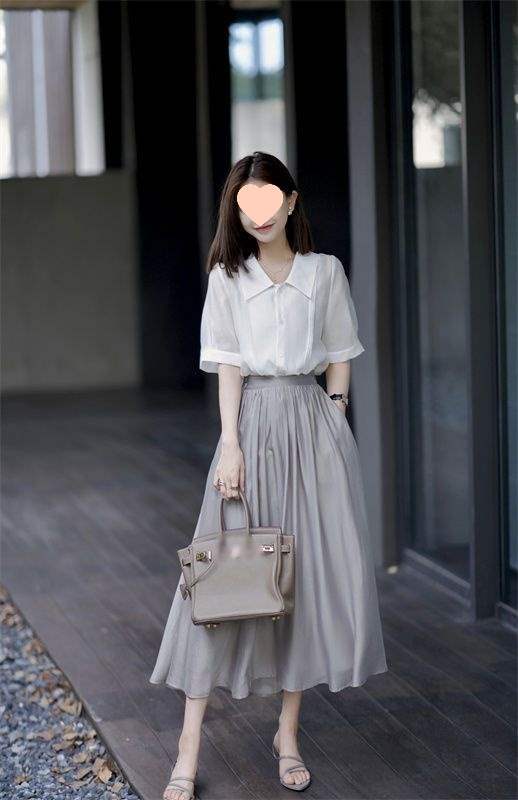 White top - single item, Gray midi skirt, single piece, White top + gray skirt suit