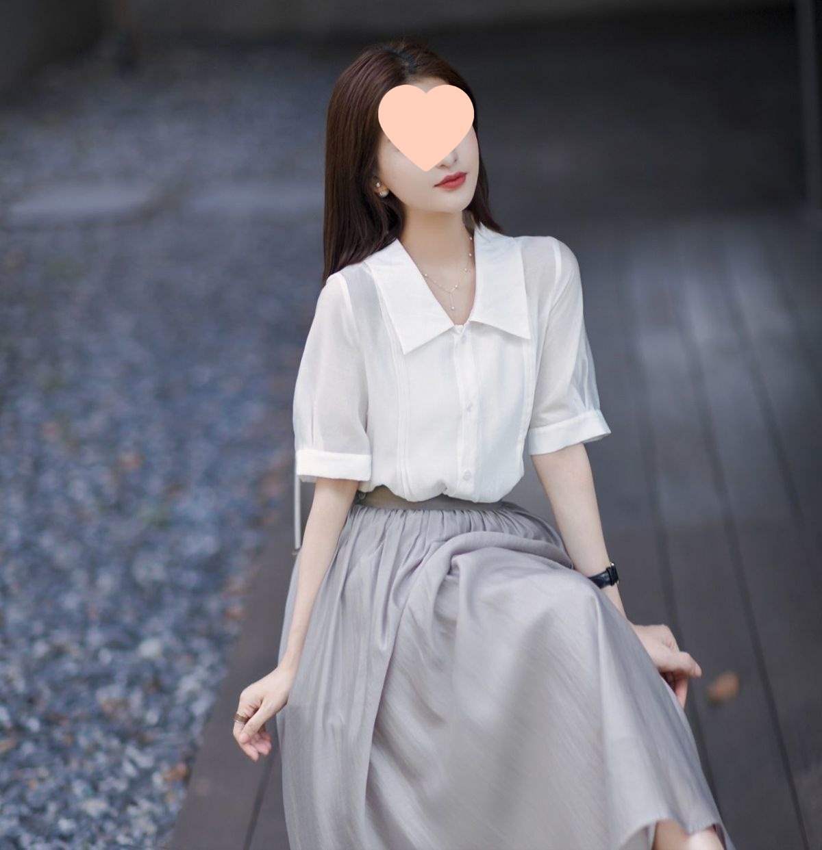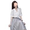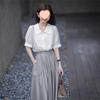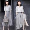 White top + gray skirt suit