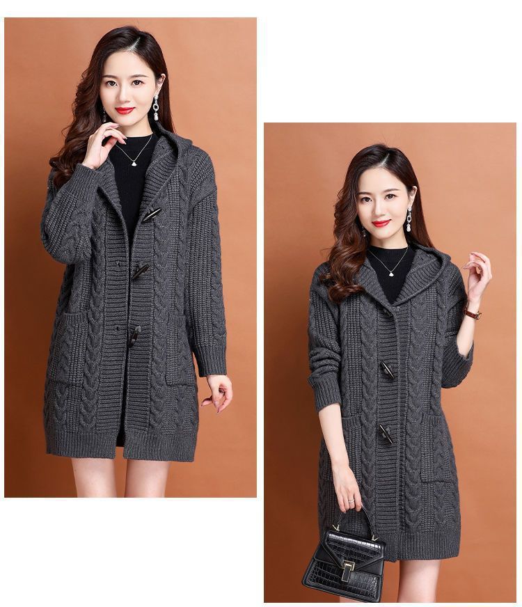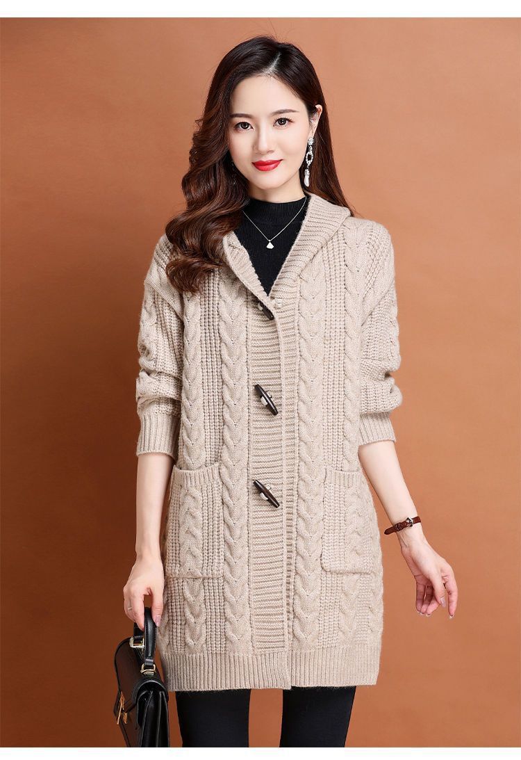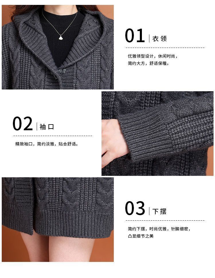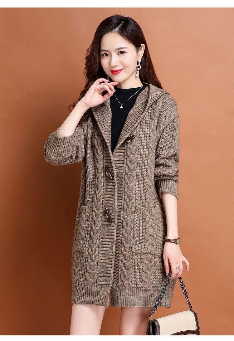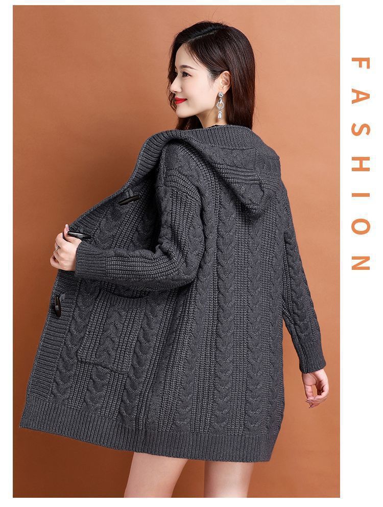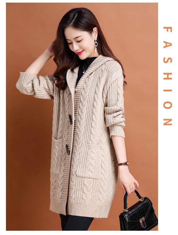 Suéter Chaqueta con Capucha de Línea Gruesa de Moda Cárdigan de Largo Medio Estilo Holgado Perezoso Talla Grande Tejido Grueso Trenzado Chaqueta