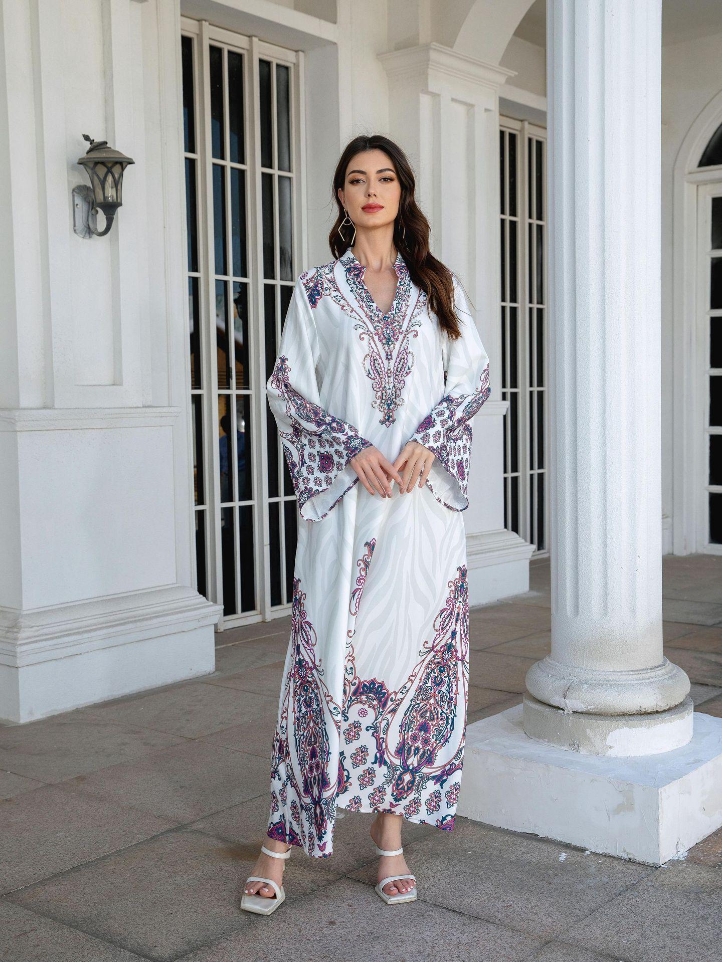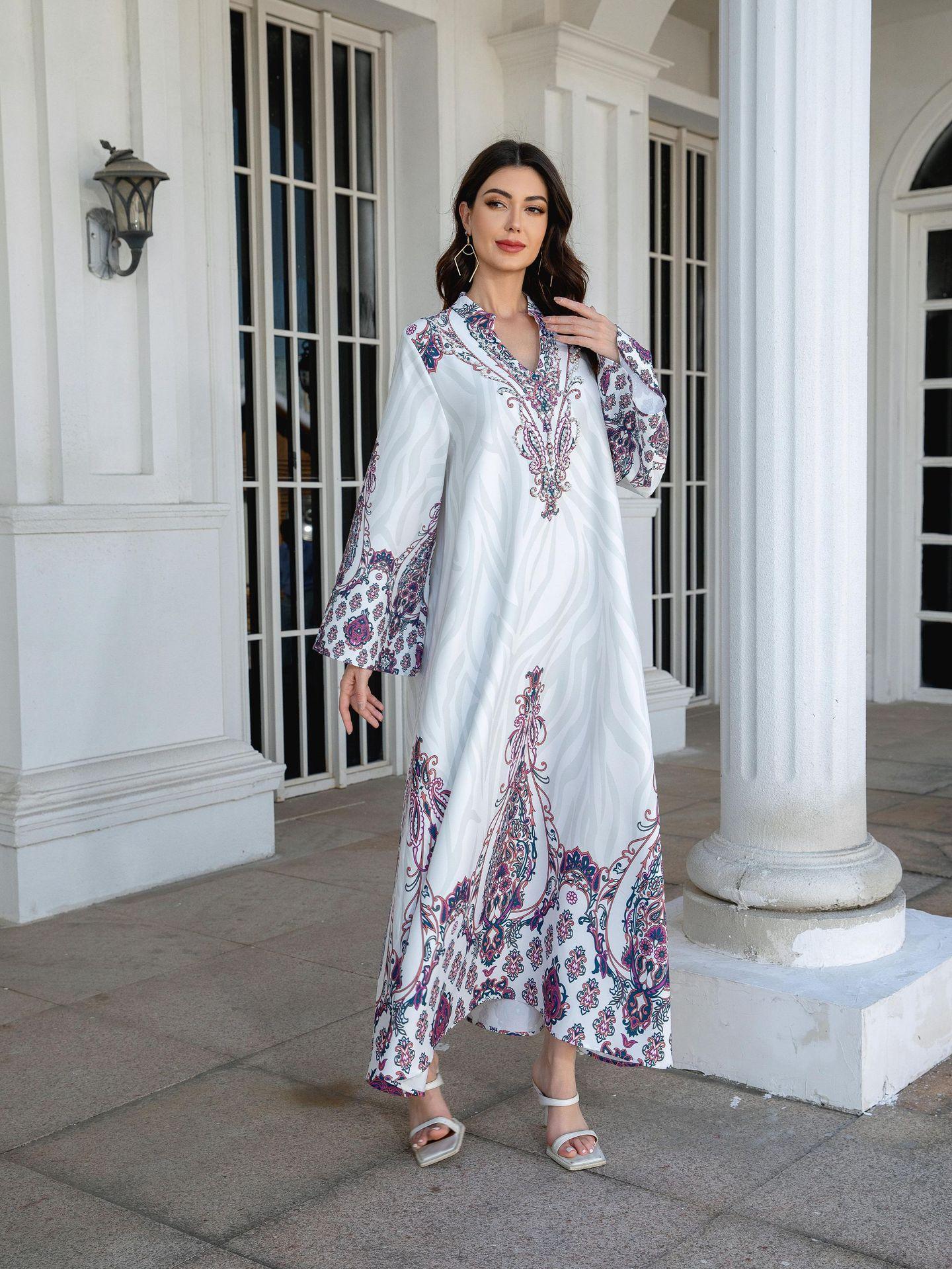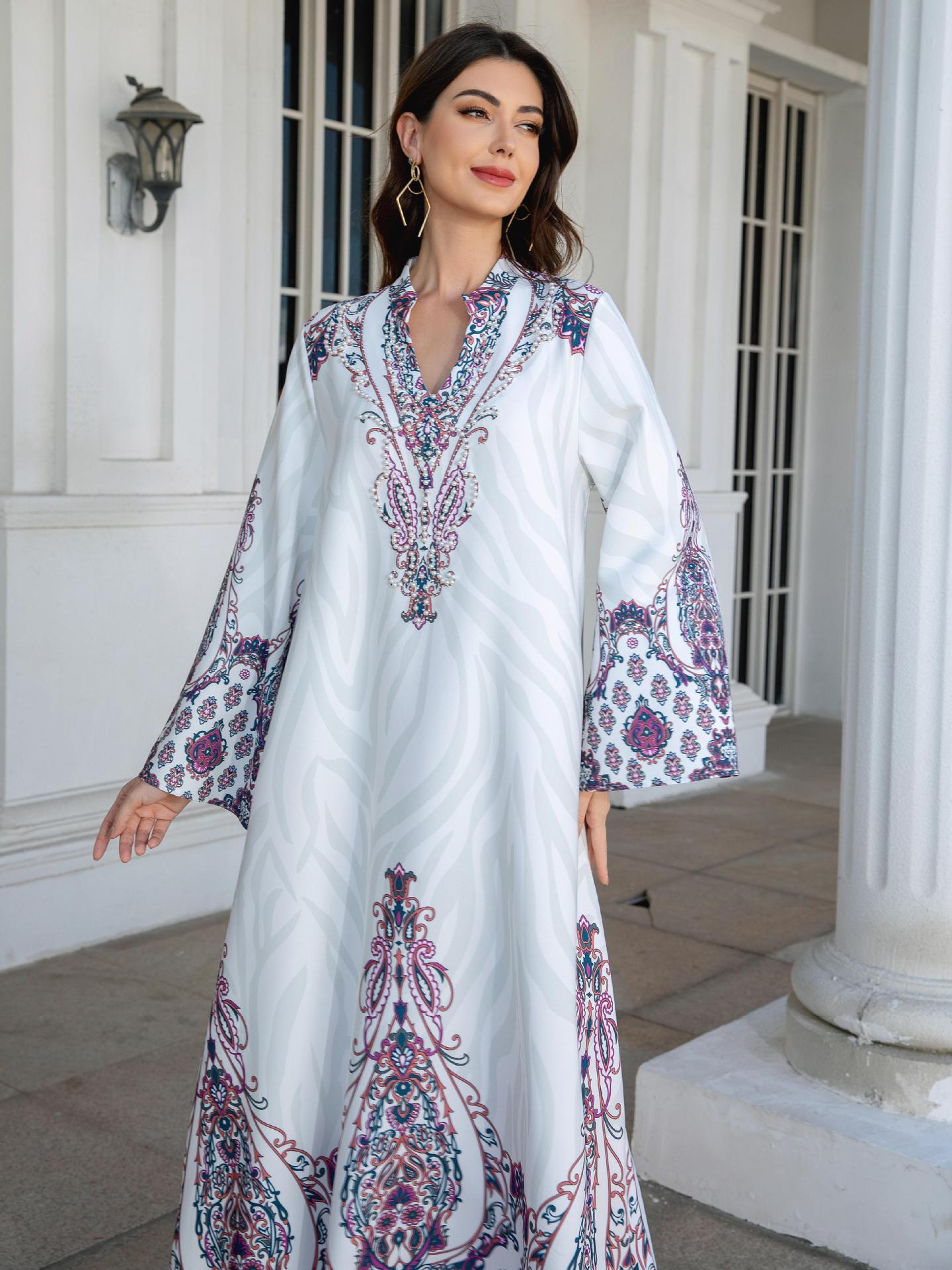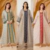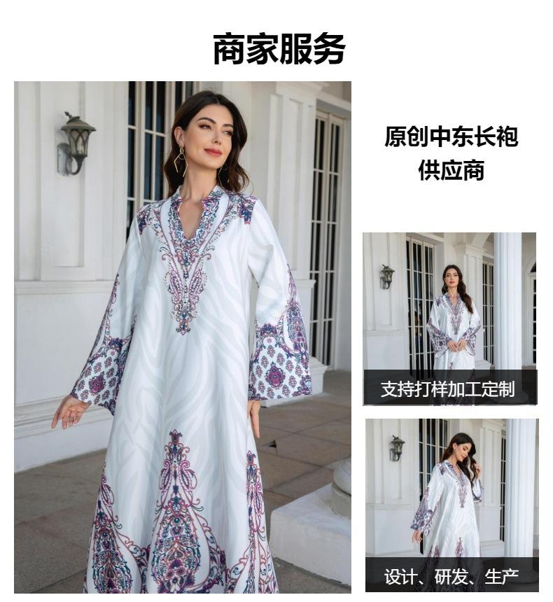 SW1102 Bata Nueva para Mujer del Medio Oriente Cuello Mao Transfronteriza Moda Musulmana Temperamento Abaya Estampado de Perlas Termoadheridas Bata Larga
