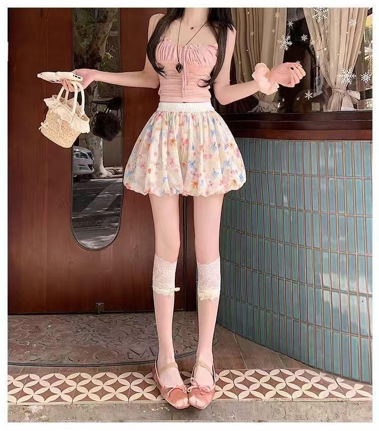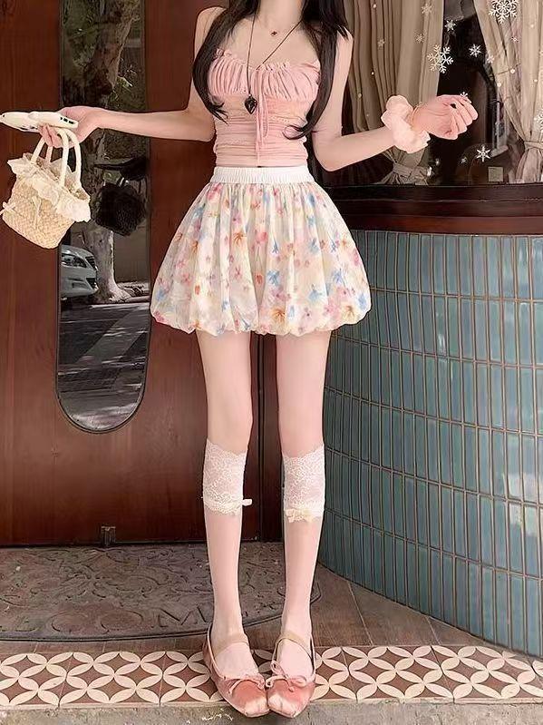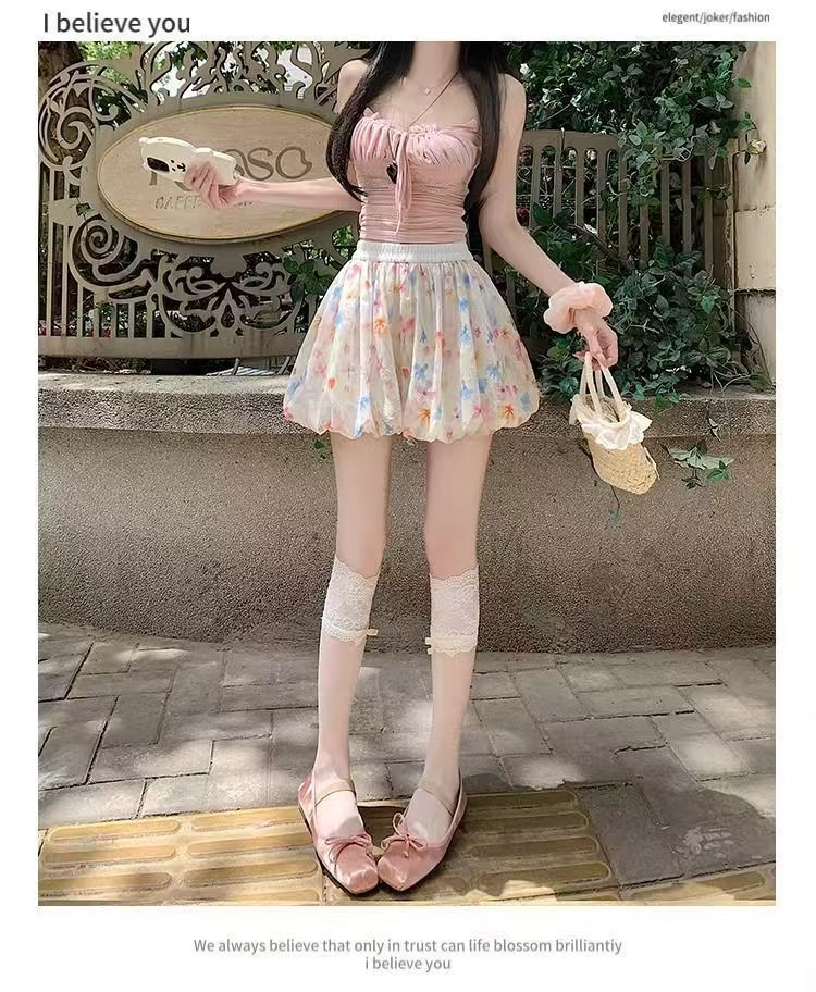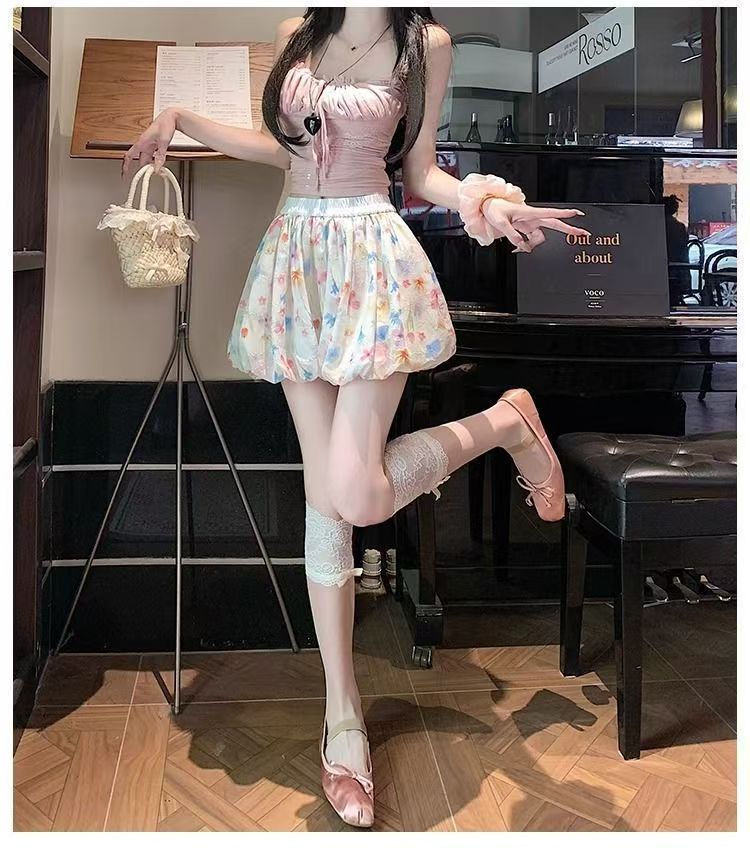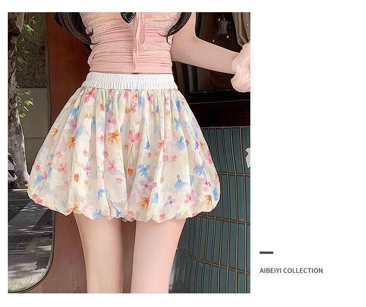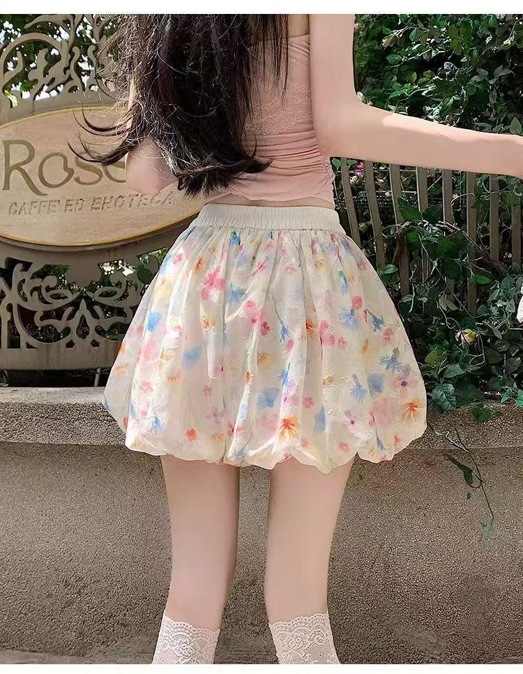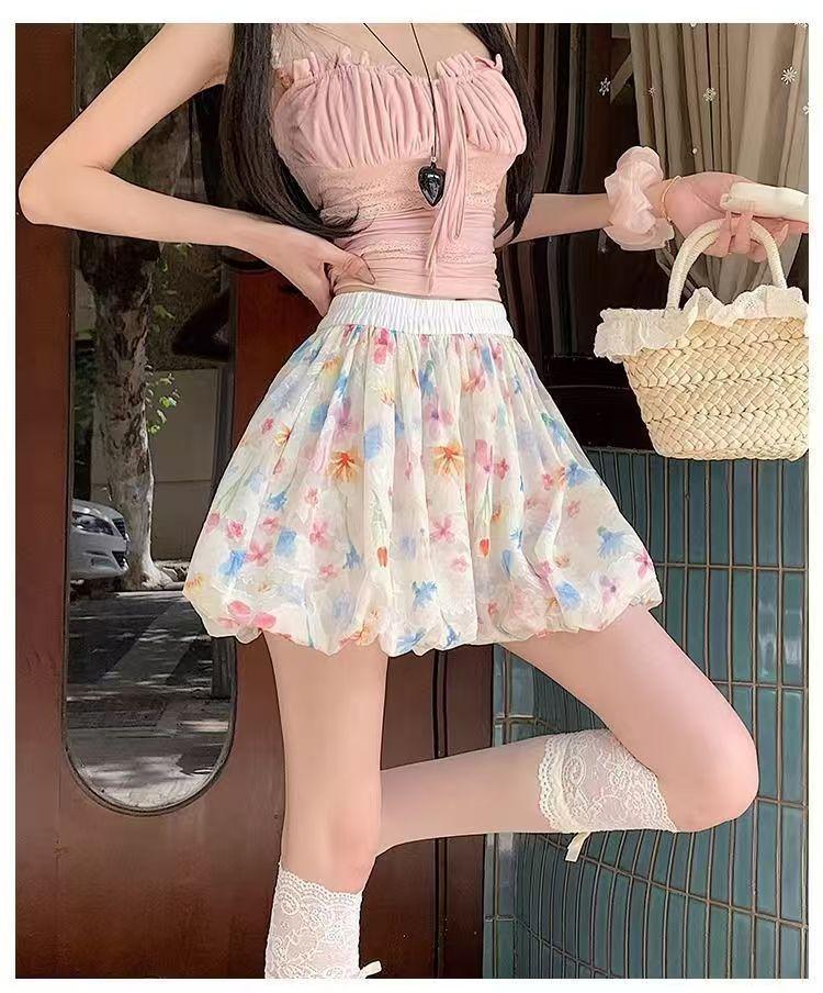 Falda midi de pierna ancha abullonada floral colorida estilo coreano para mujer verano 2025 cintura alta casual versátil línea A tulipán pantalones falda