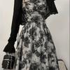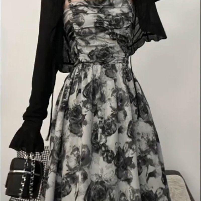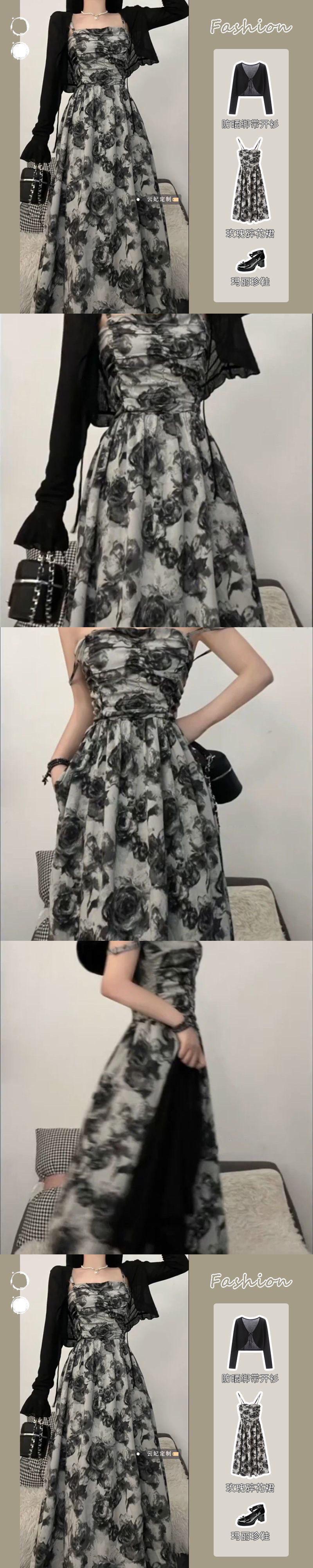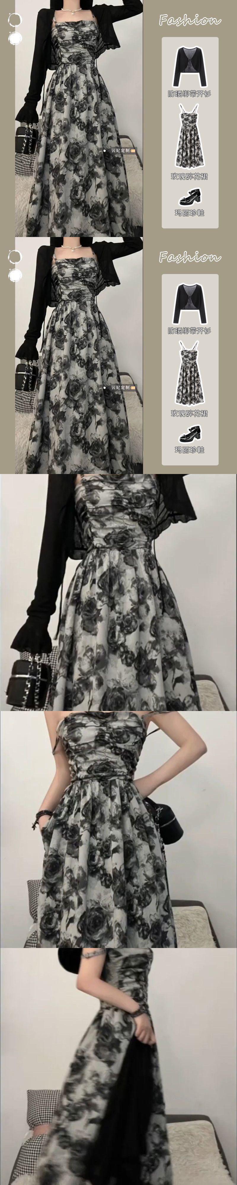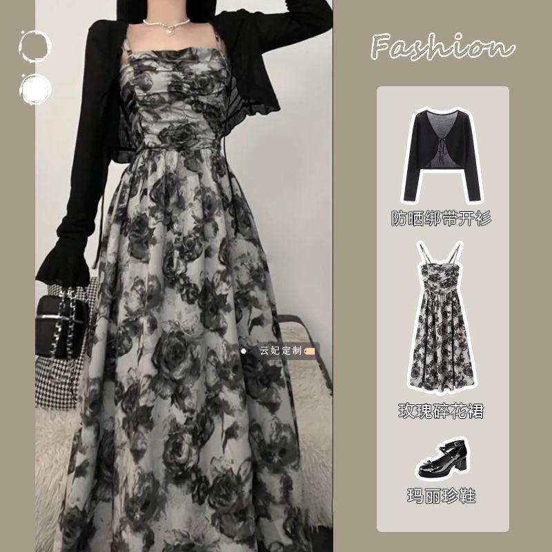 Black sun protection cardigan + rose floral skirt [two-piece set]