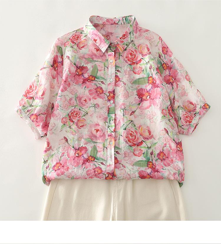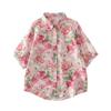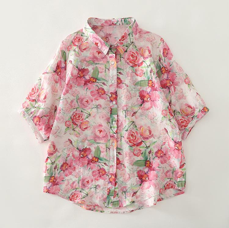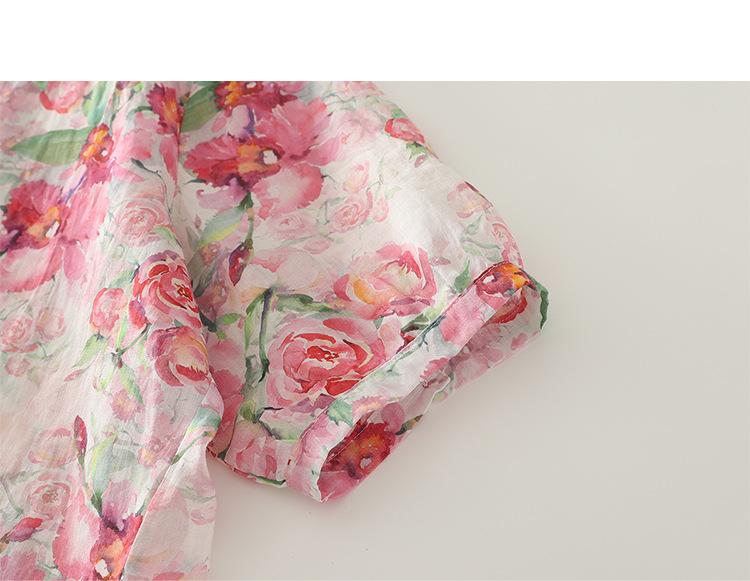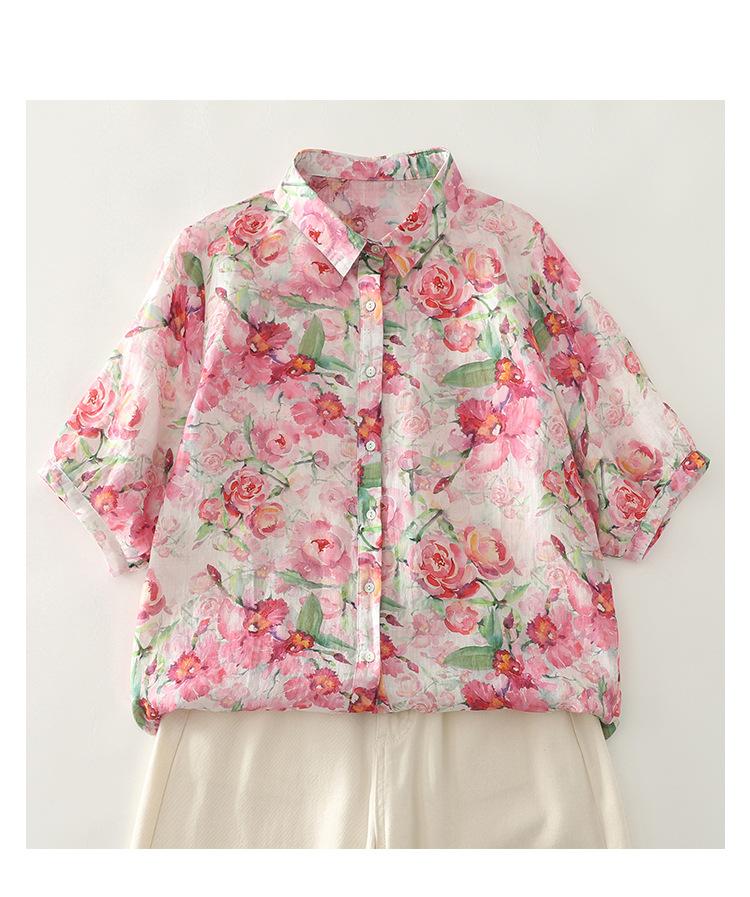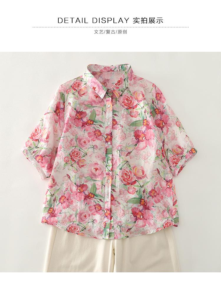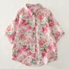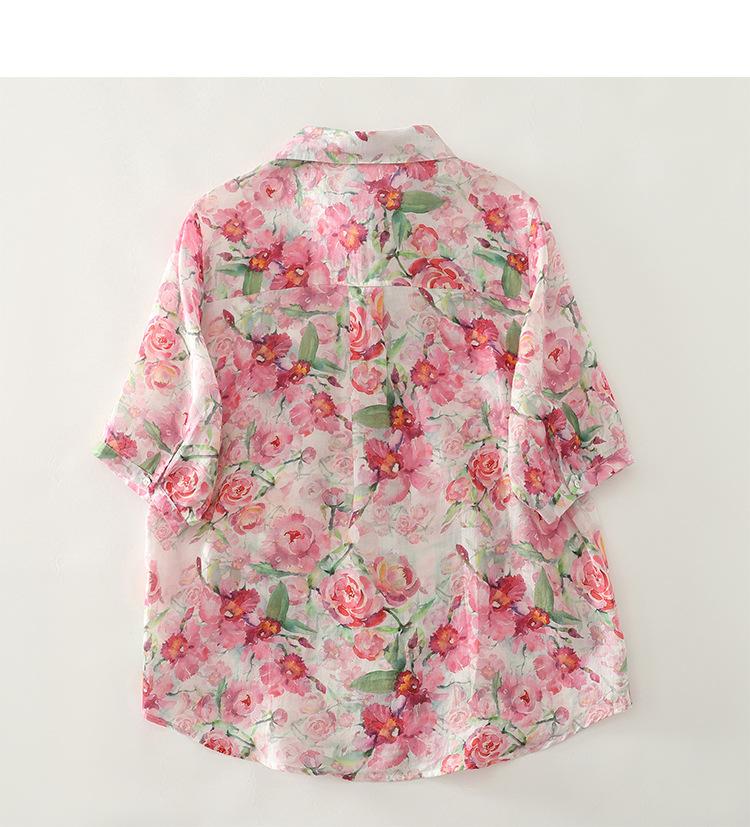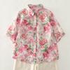 Foto real de camisa delgada rosa floral lista para usar 2025, camisa estampada de manga corta, holgada y versátil para mujer