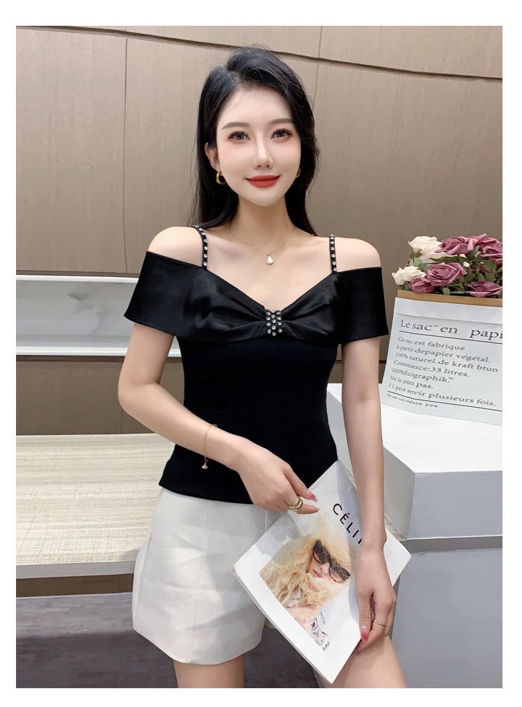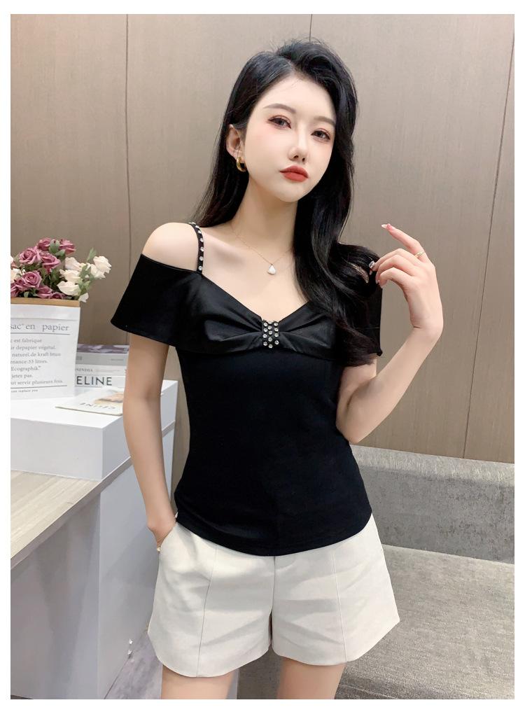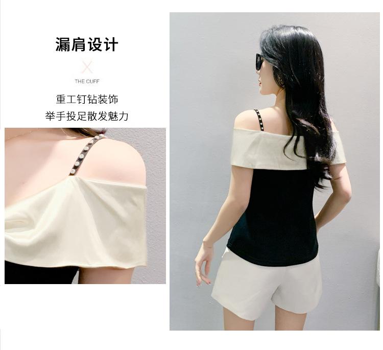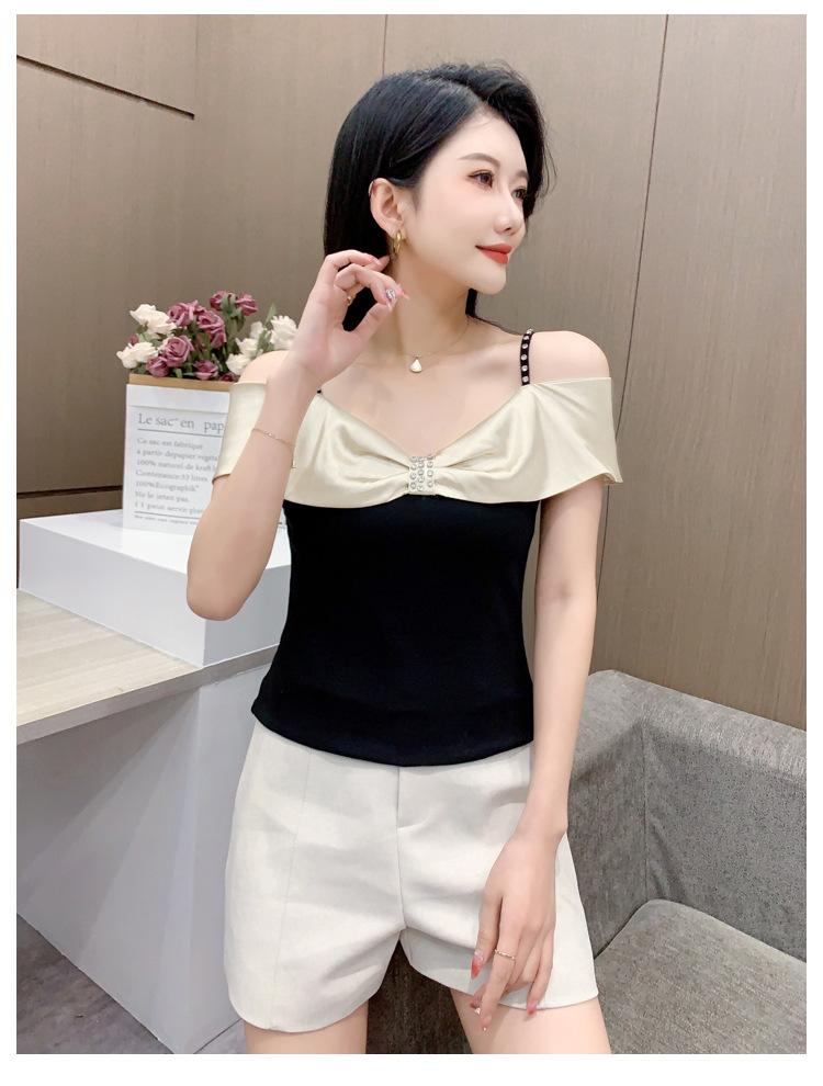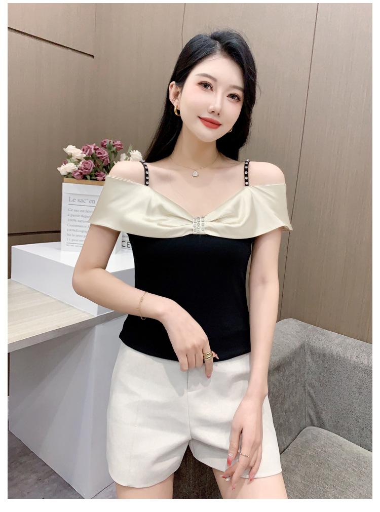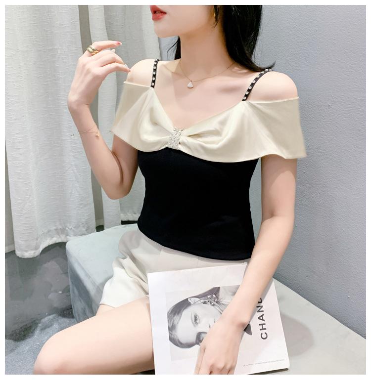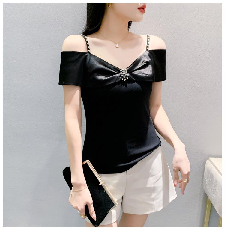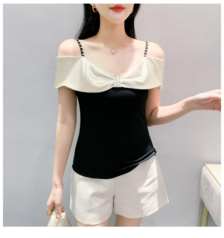 Verano Nuevo Costuras de Vinagre Diseñador Hombro Cuello Correa con Diamante Camiseta de Moda Estilo Occidental para Mujer