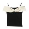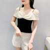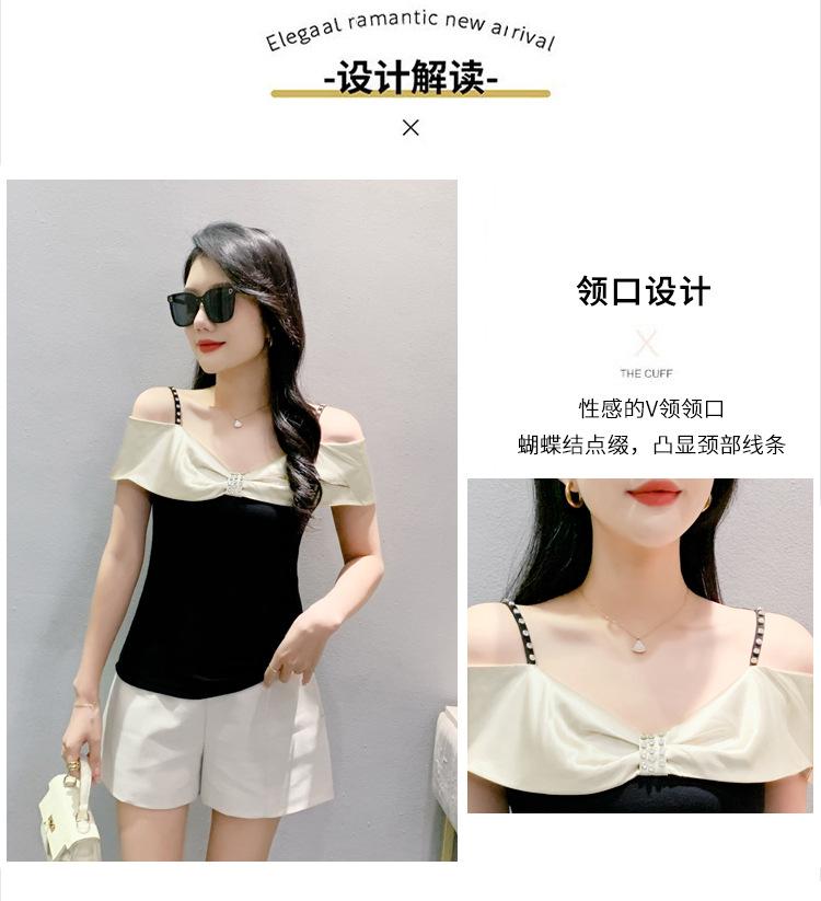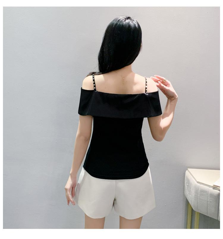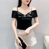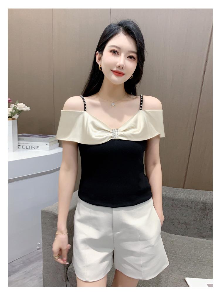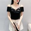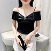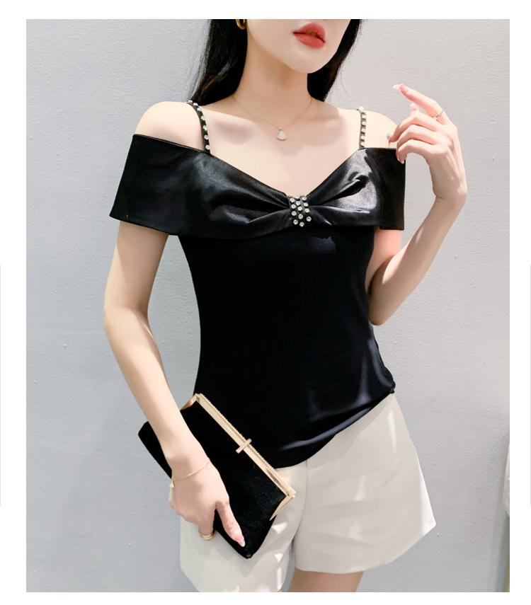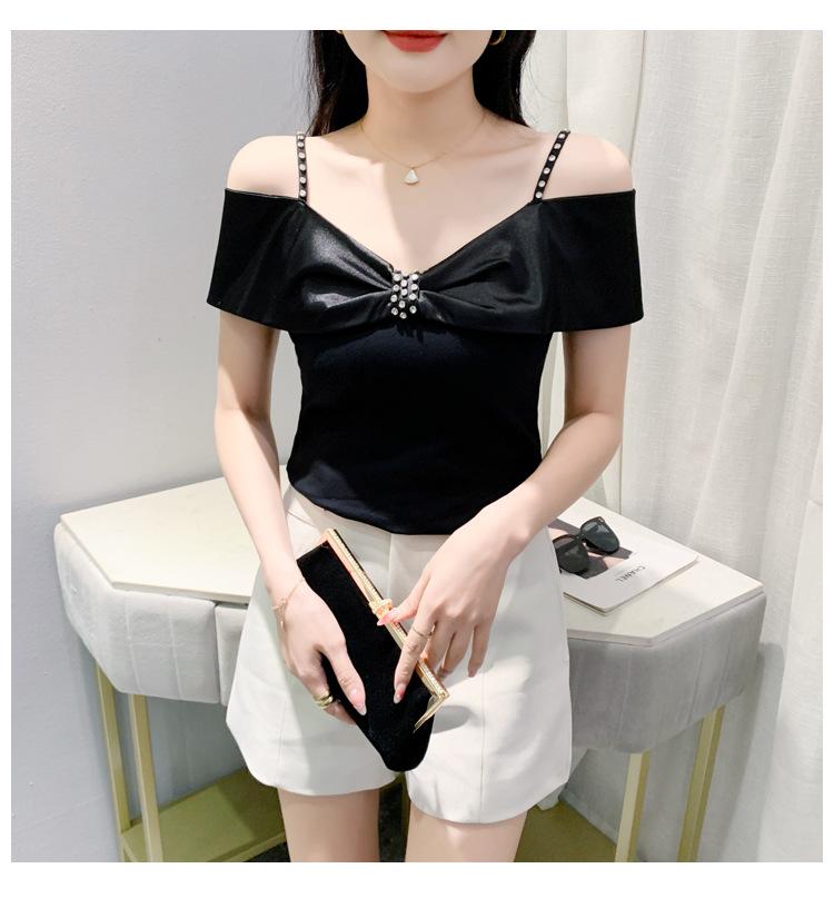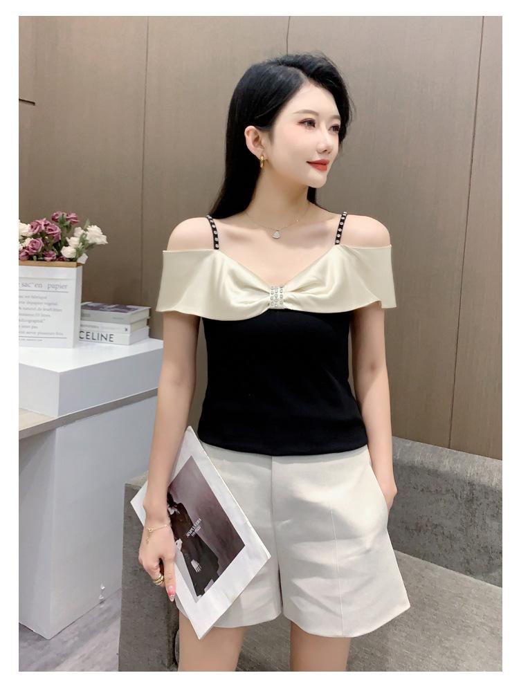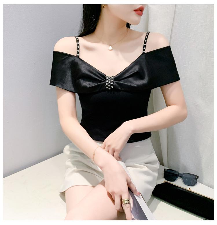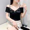 Verano Nuevo Costuras de Vinagre Diseñador Hombro Cuello Correa con Diamante Camiseta de Moda Estilo Occidental para Mujer