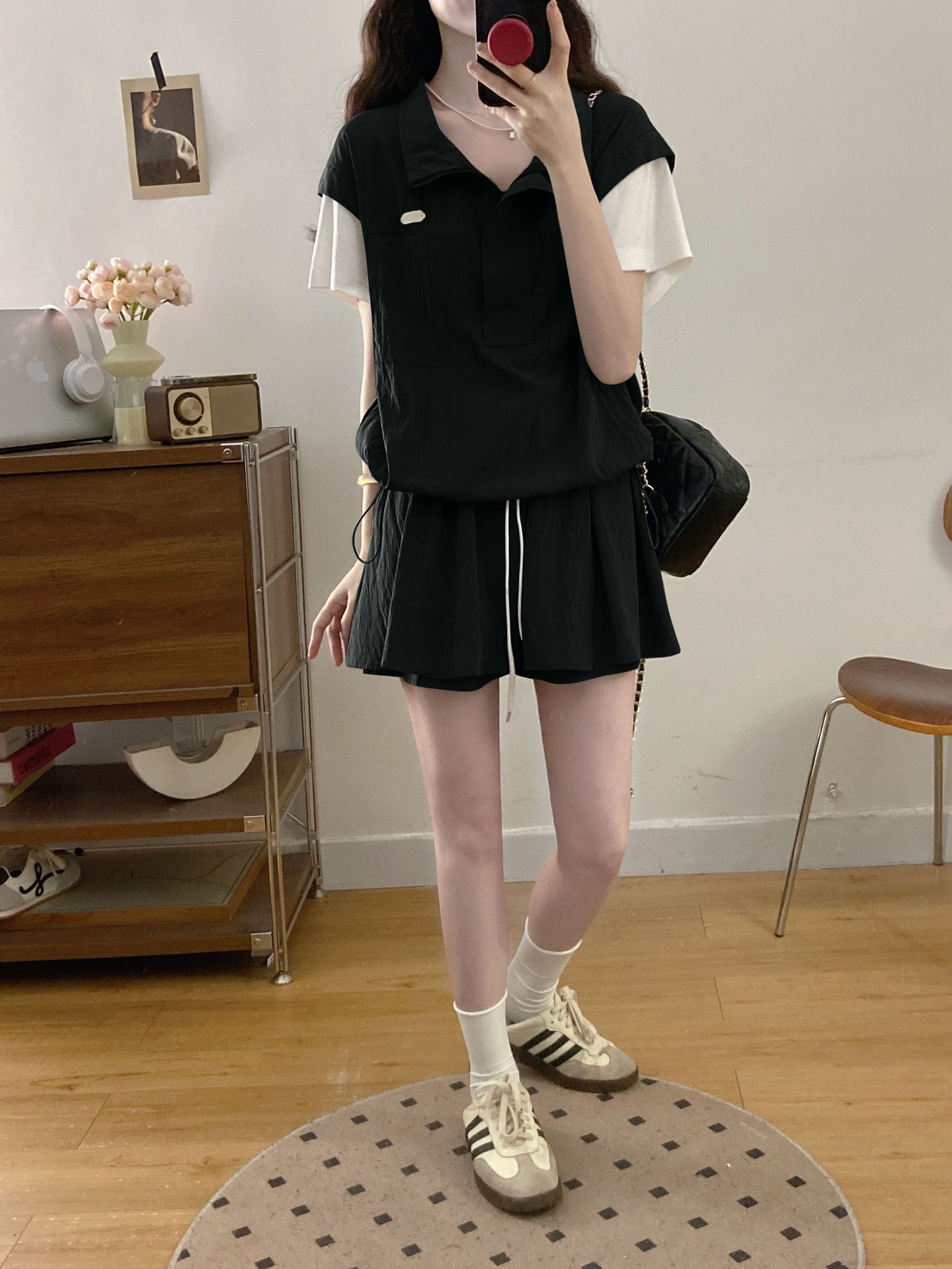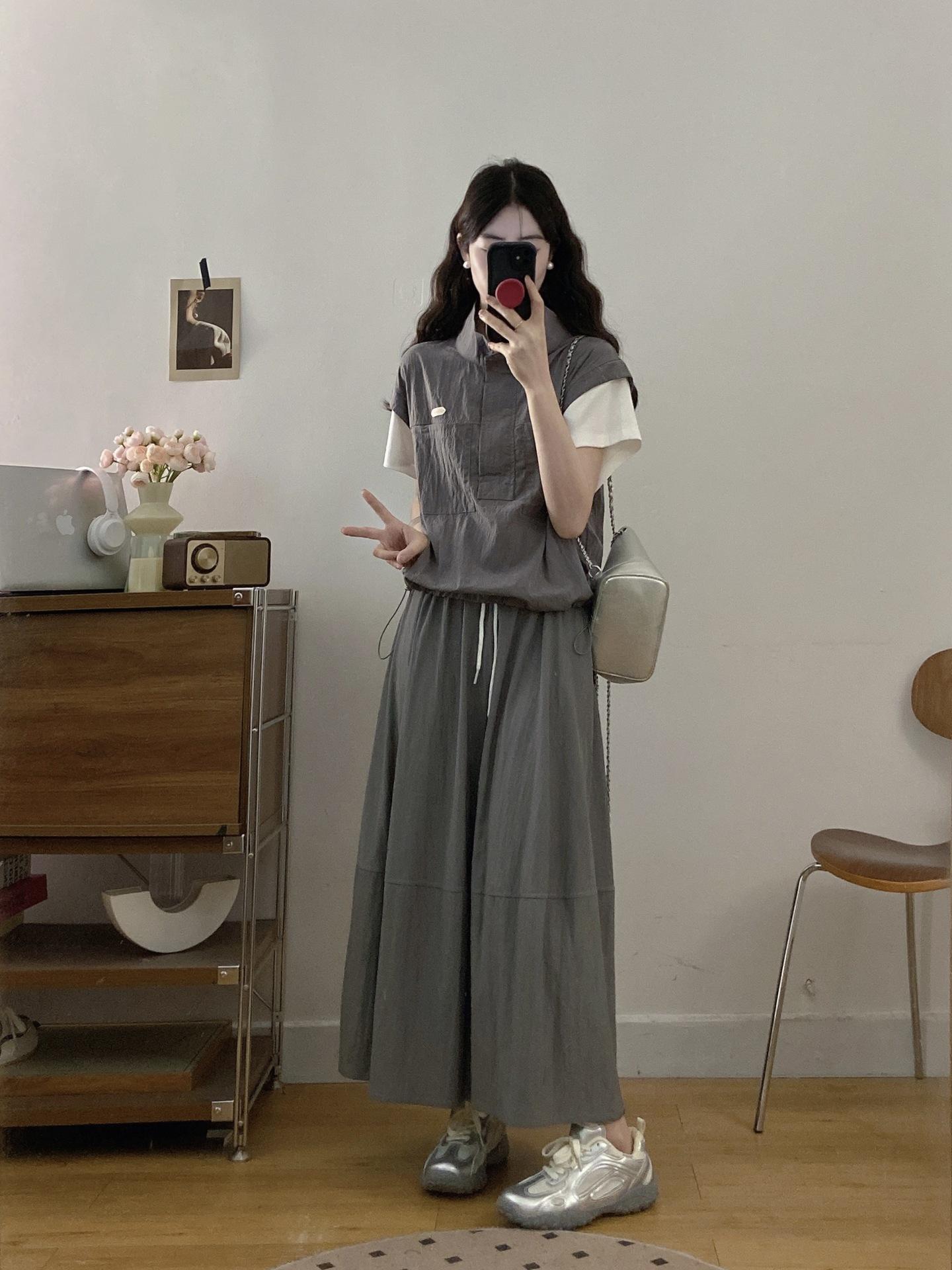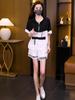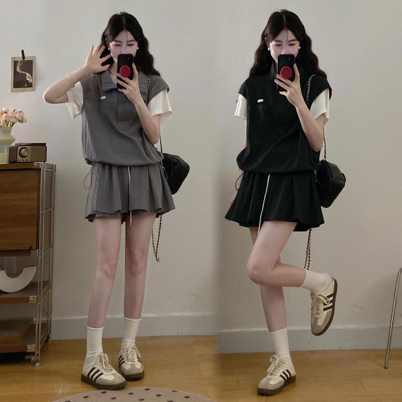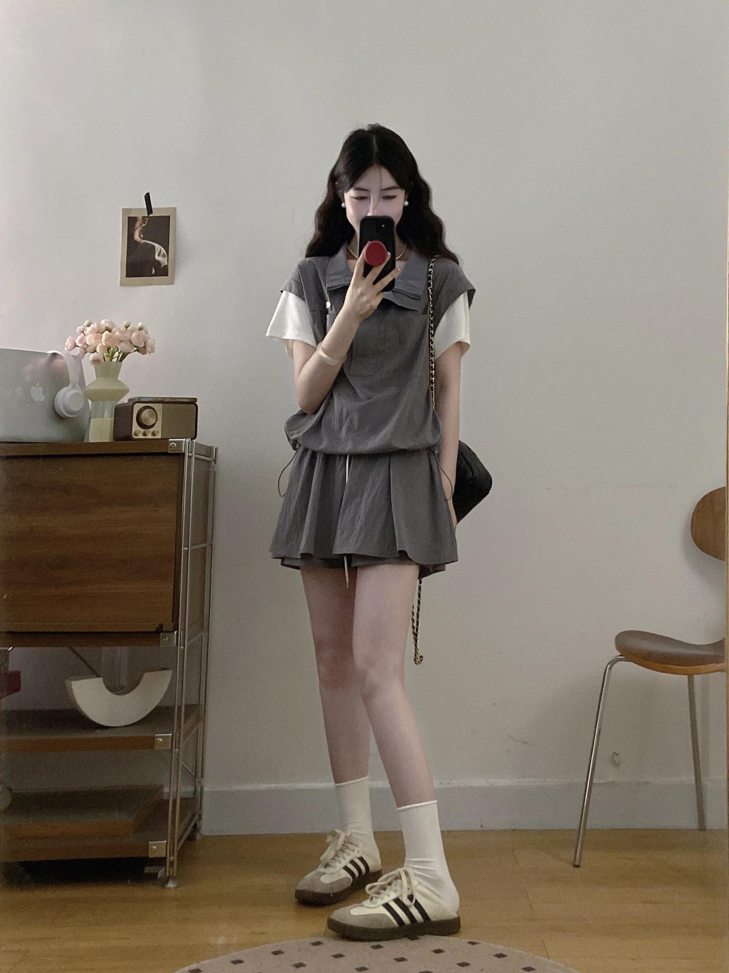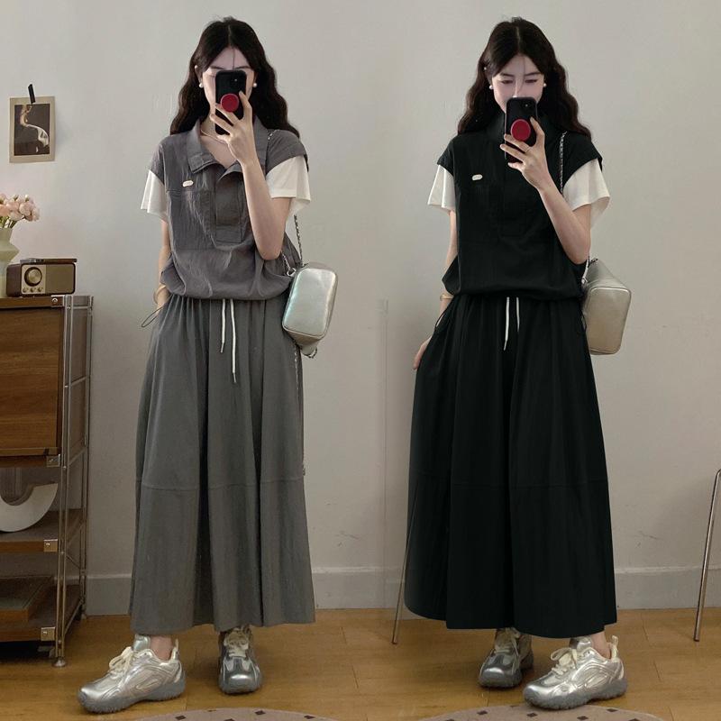 Conjunto Deportivo Casual de Talla Grande Top de Manga Corta Falso de Dos Piezas Shorts Conjunto de Dos Piezas Mujer Gordo MM Adelgazante Conjunto de Verano