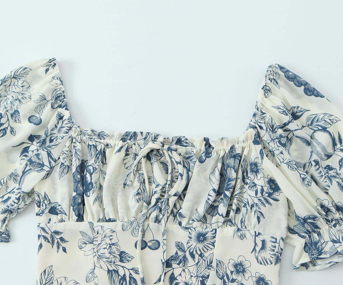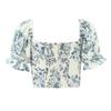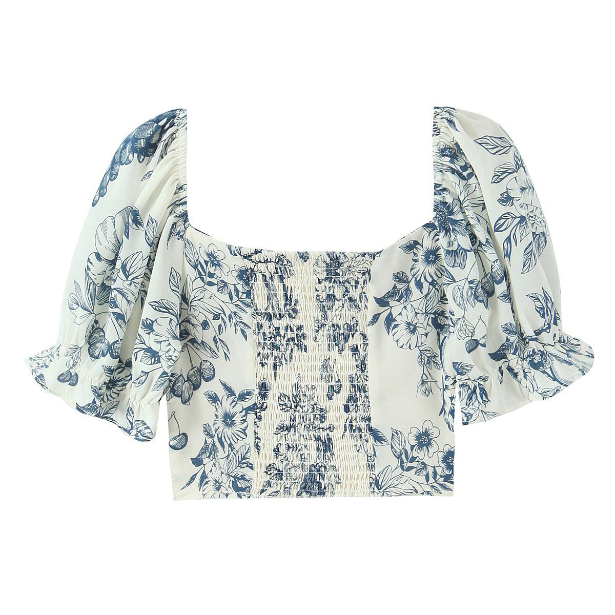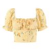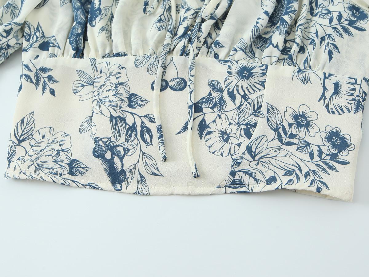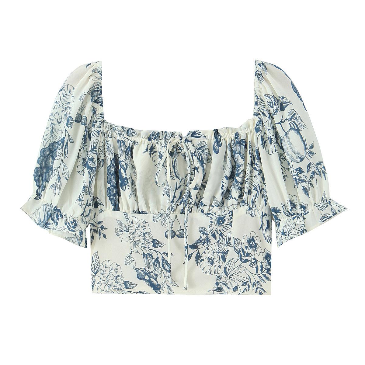 7700-25 Nuevo Estilo de Verano Retro Francés Estampado Floral Lazada con Cordones Sexy Dos Usos Camisa Manga Abullonada