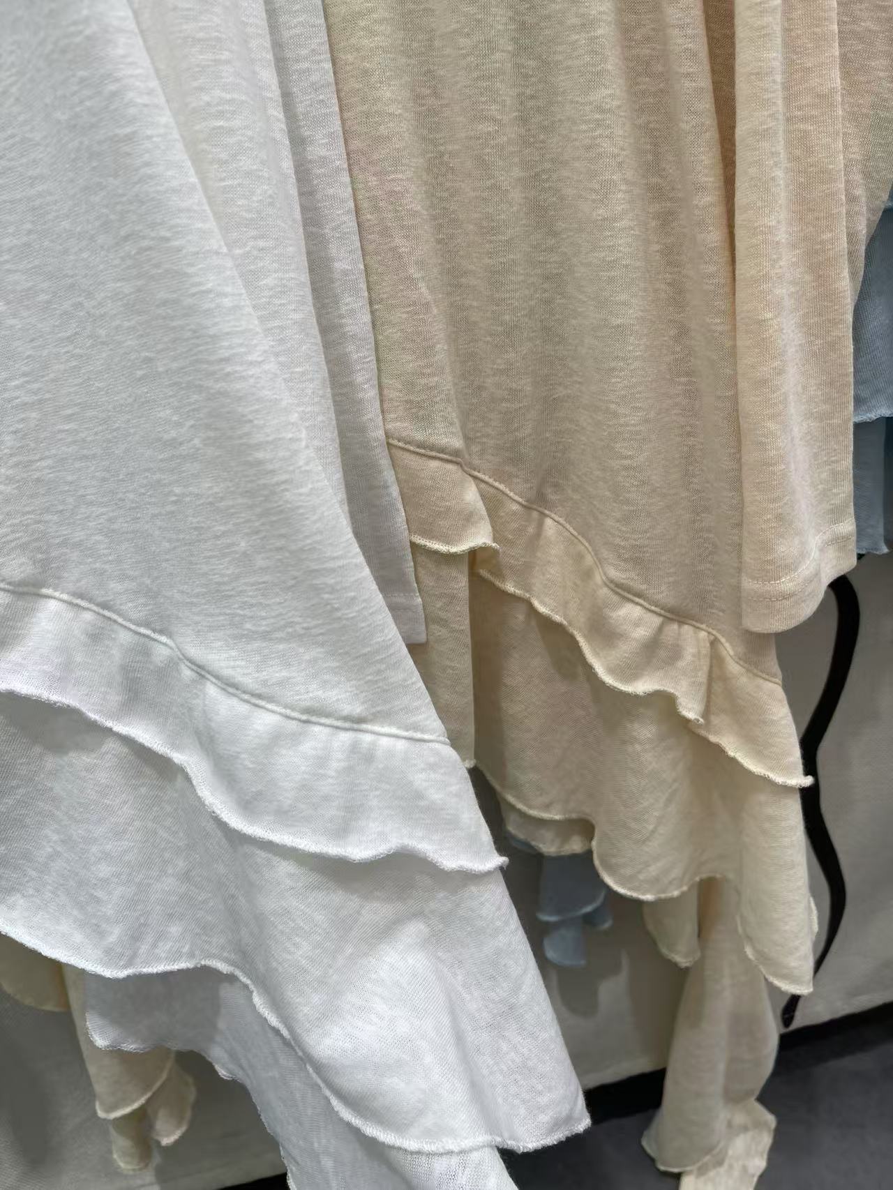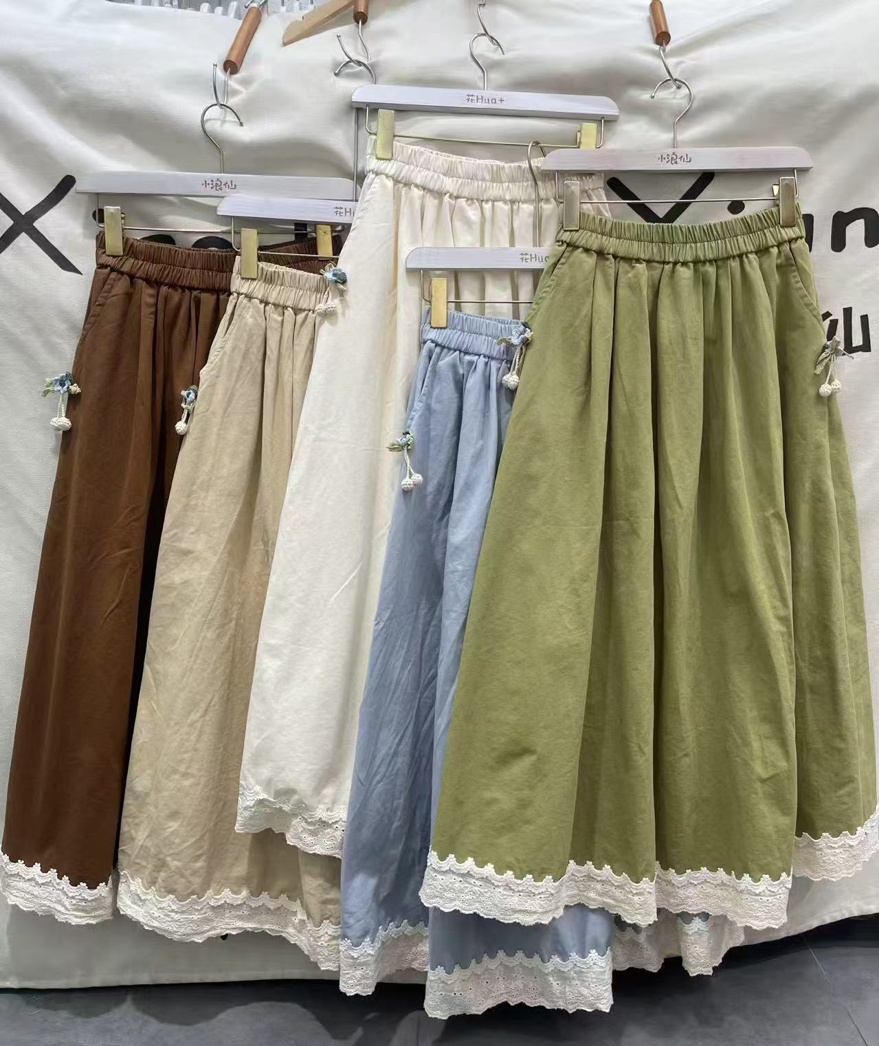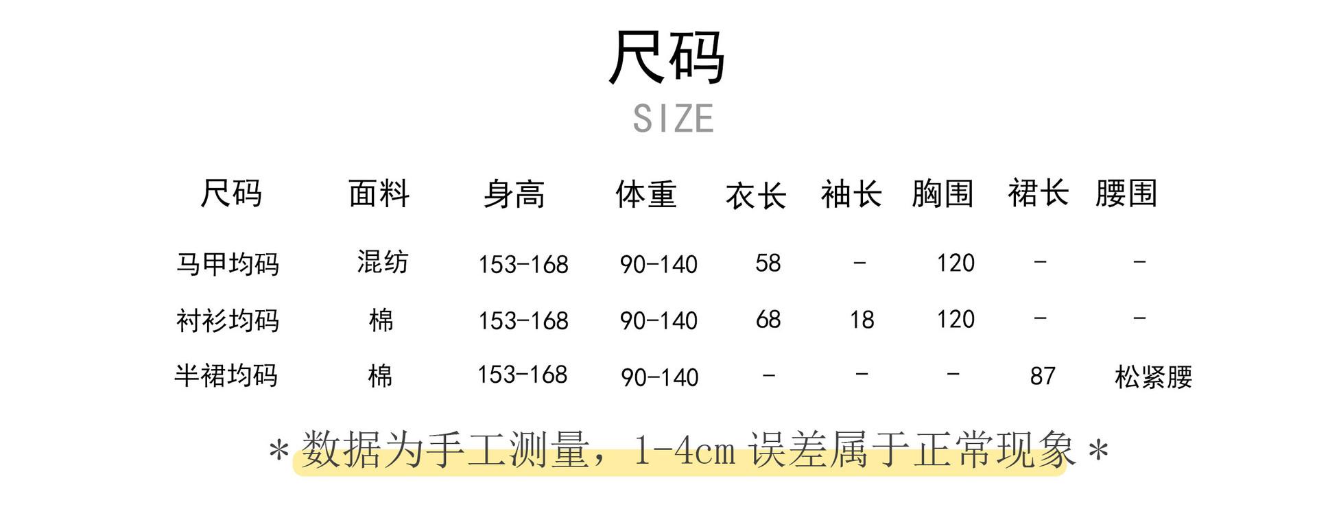Grey vest, Apricot vest, Khaki vest, Pink vest, White top, blue top, Apricot top, Blue skirt, Green skirt, Apr...