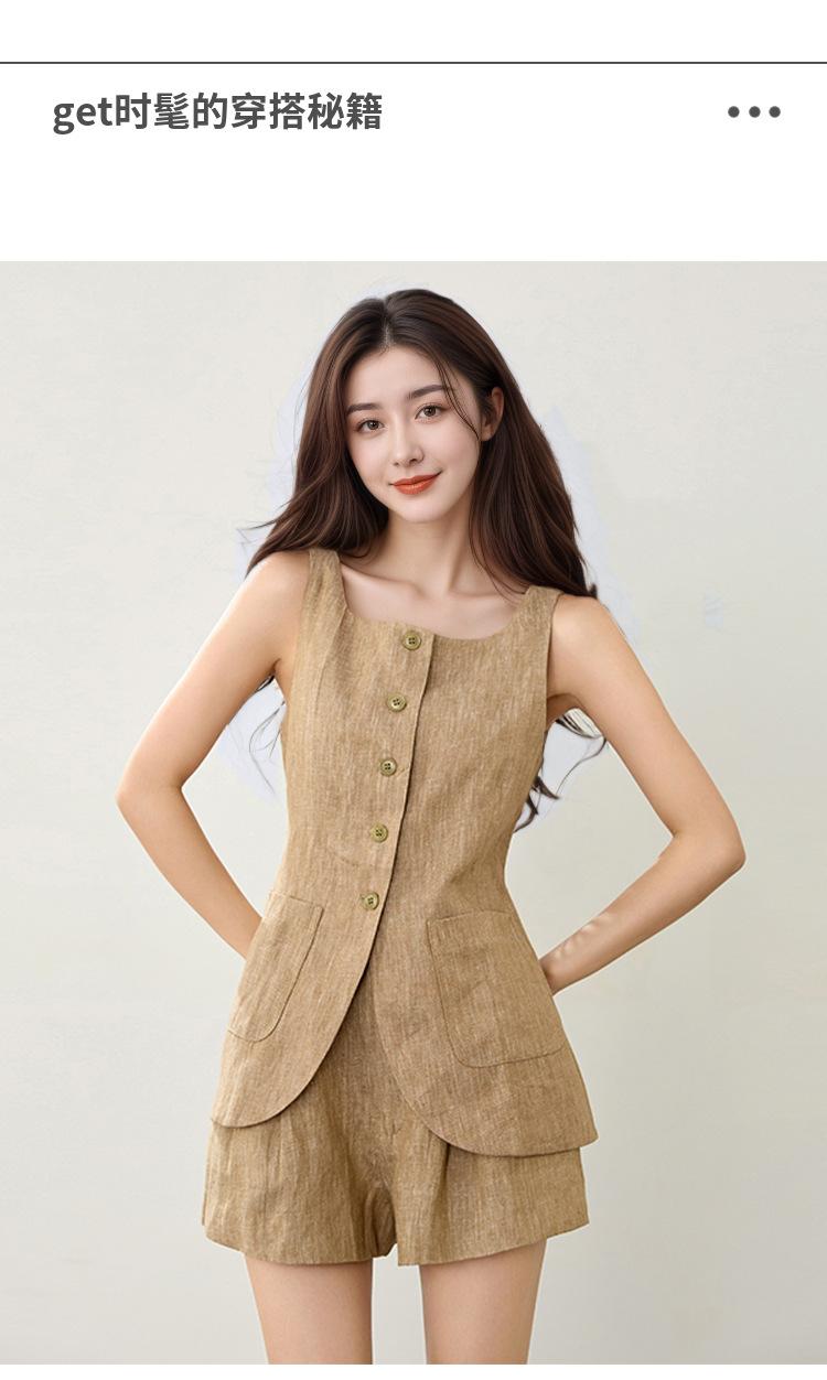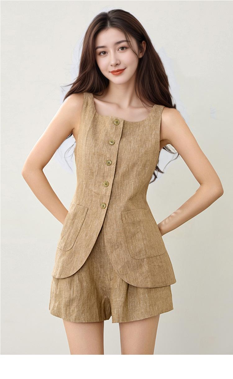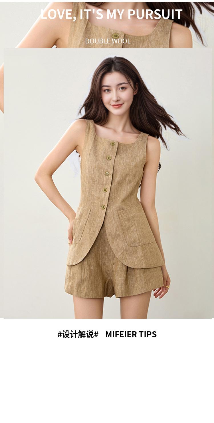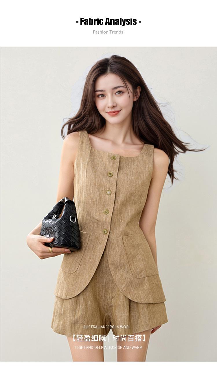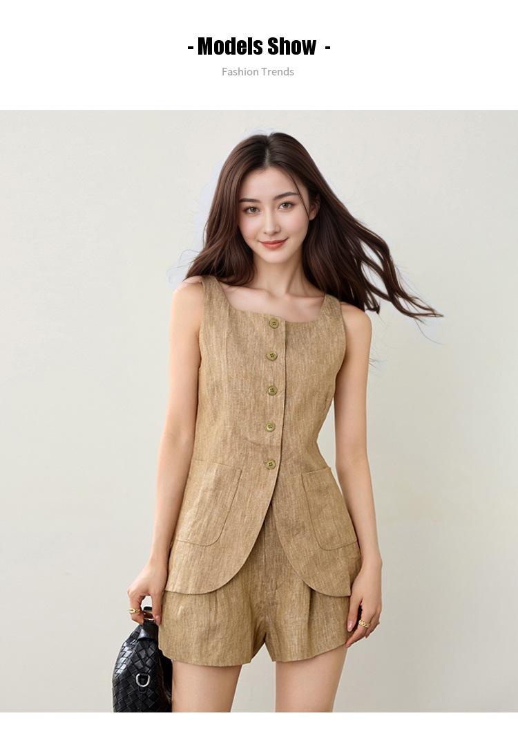 2025 Verano Nuevo Estilo Old Money Commuter Secado Rápido Transpirable Lino Sin Mangas Cuello Cuadrado Chaleco Shorts Traje de Dos Piezas para Mujer