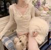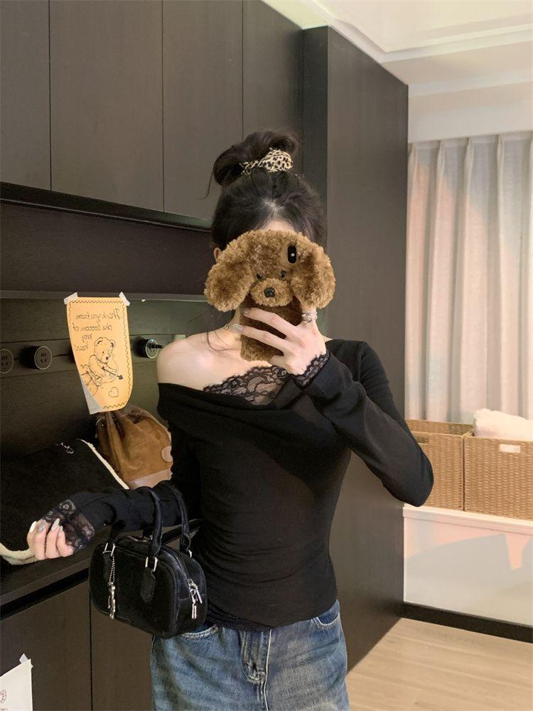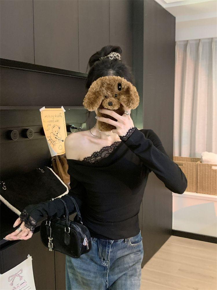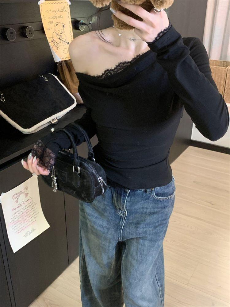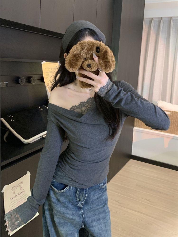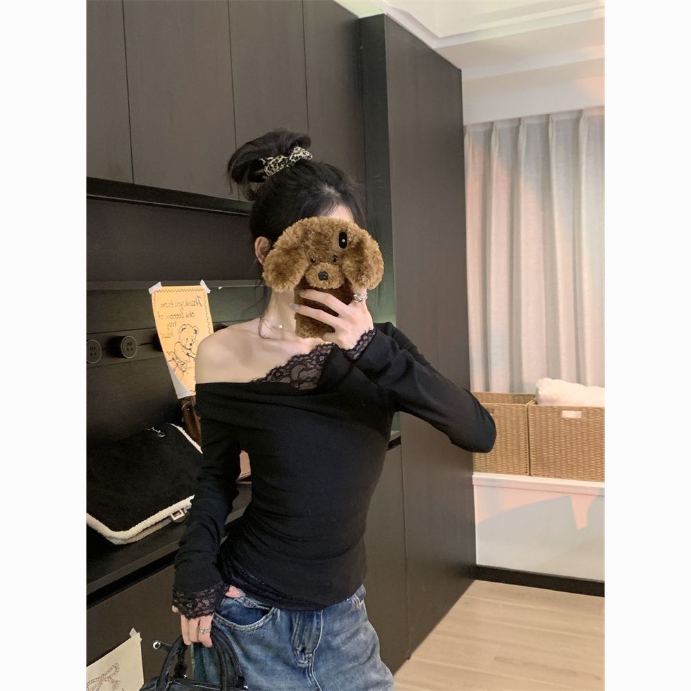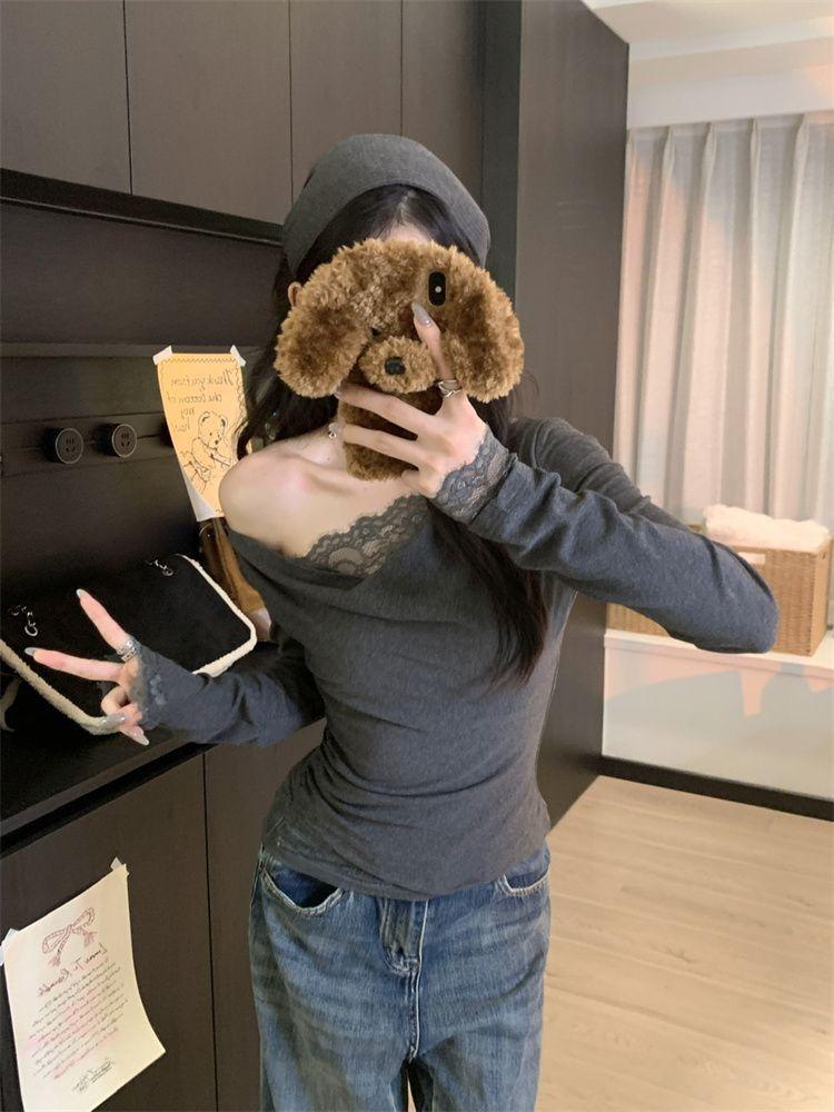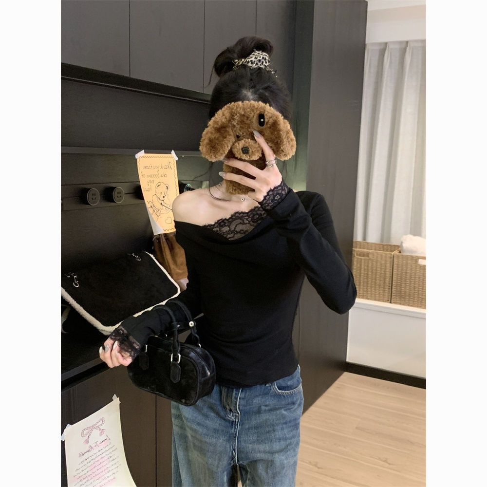 Diseño Sense Encaje Costuras Top Base para Mujer Otoño e Invierno Nuevo Chica Picante Pura Ajustado Adelgazante Hombro Camiseta de Manga Larga