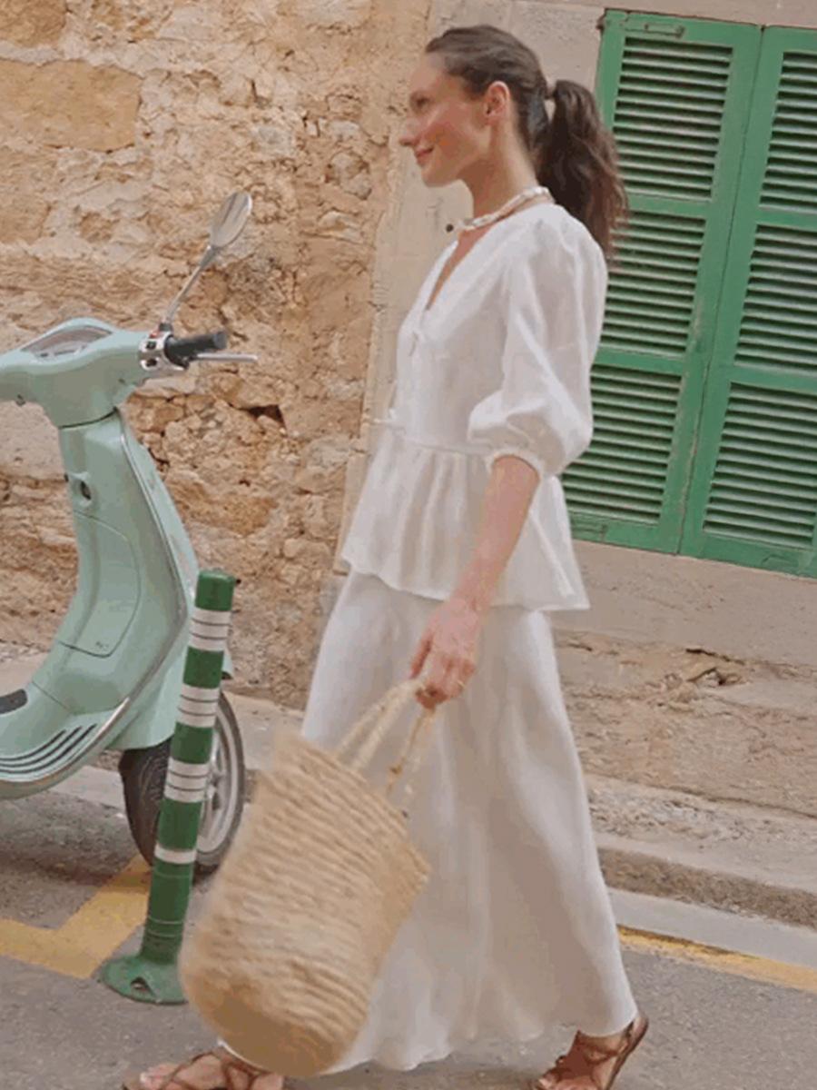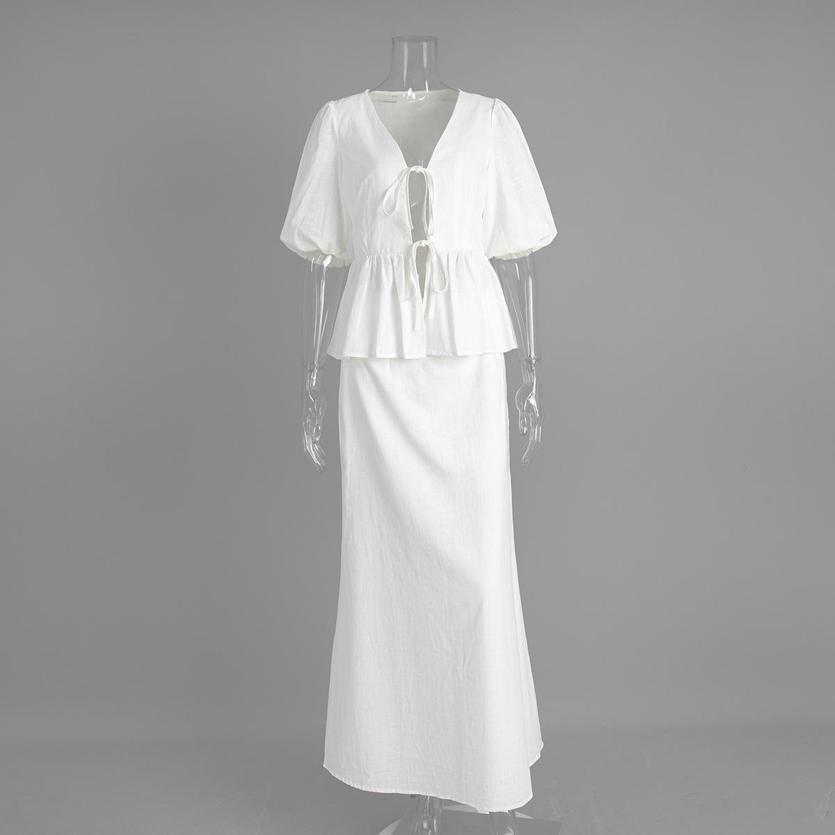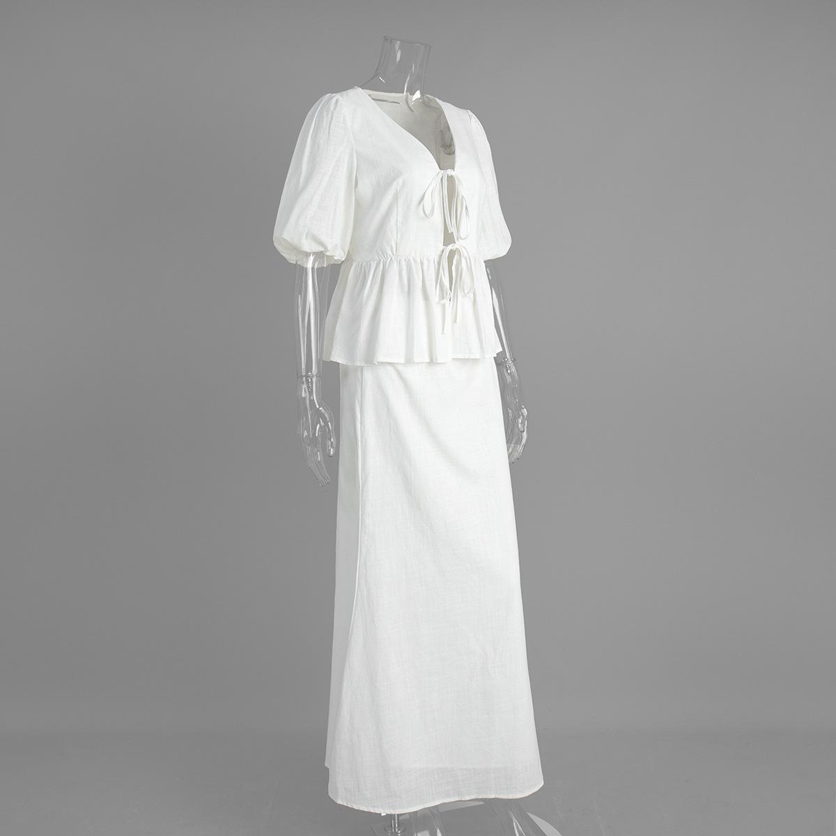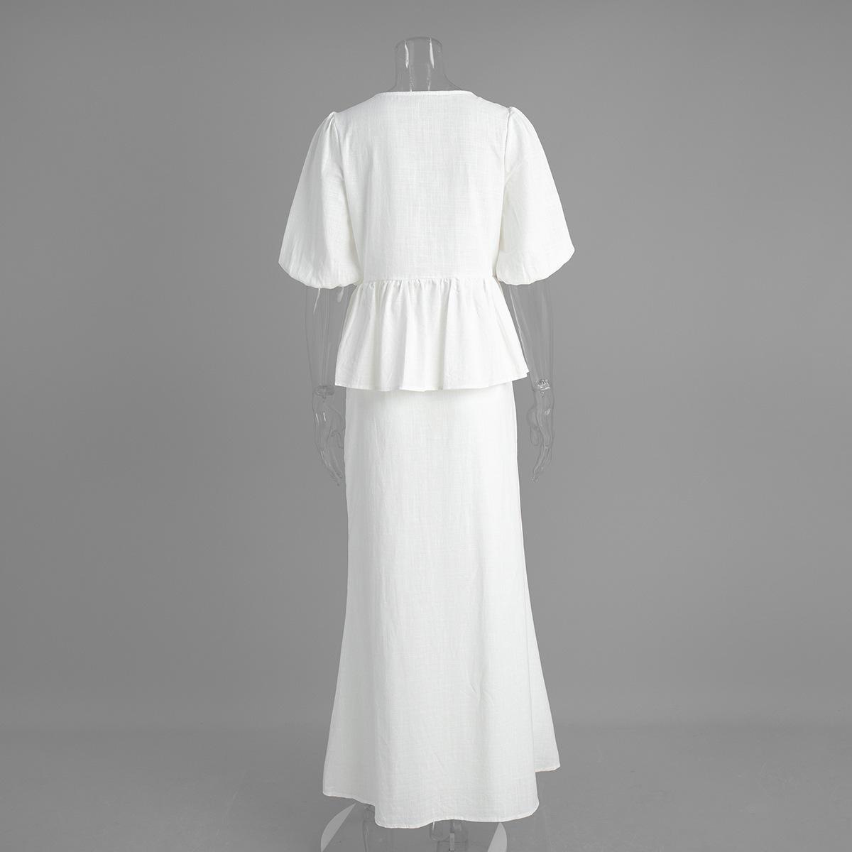 Traje de Falda de Algodón Puro Transfronterizo para Mujer Verano Europeo y Americano Camisa de Manga Abullonada + Falda Larga Traje Casual para Mujer